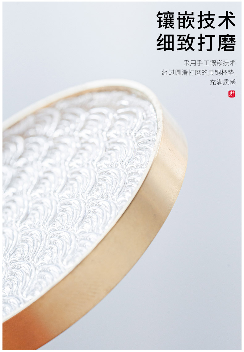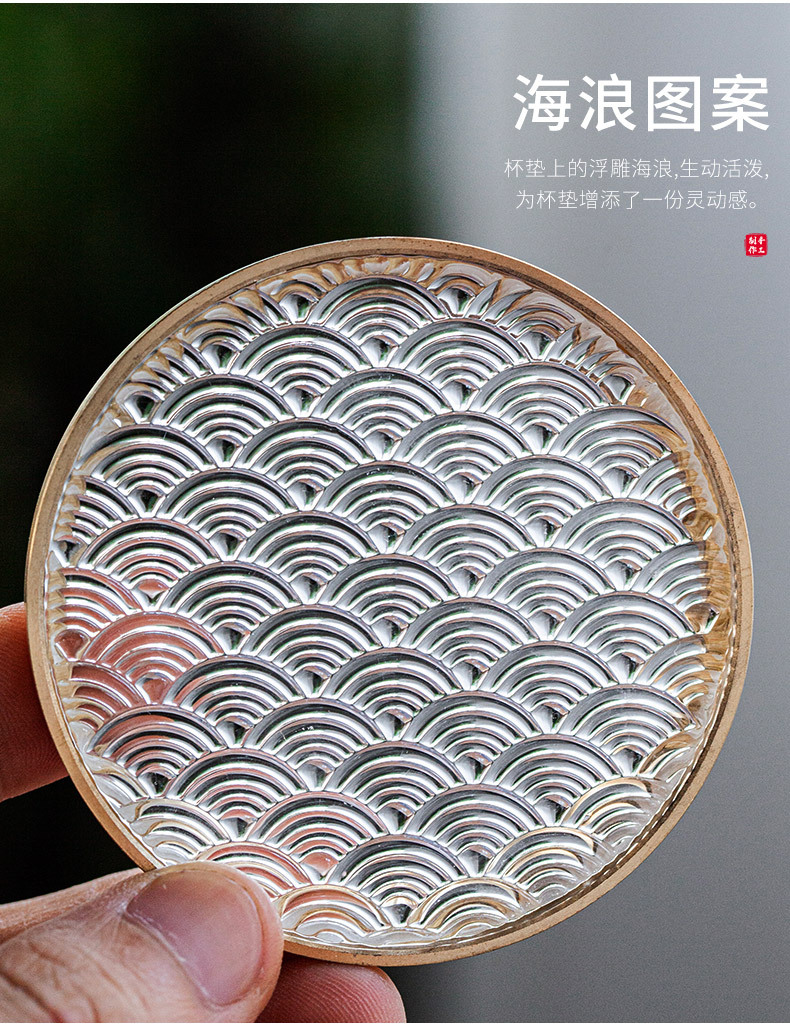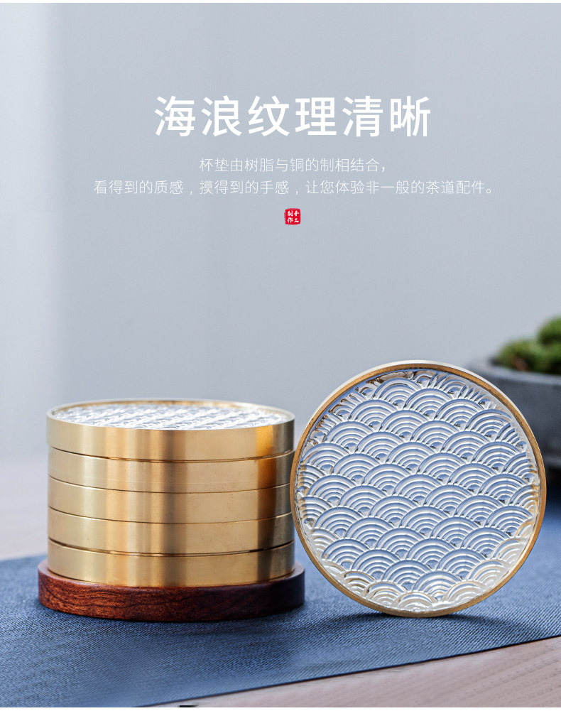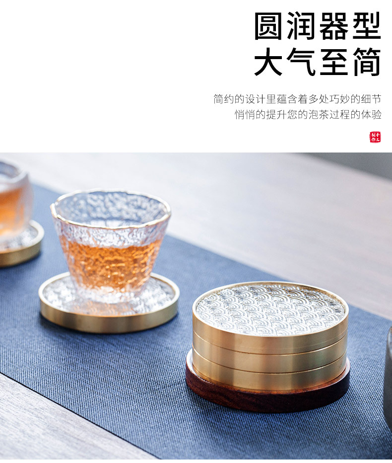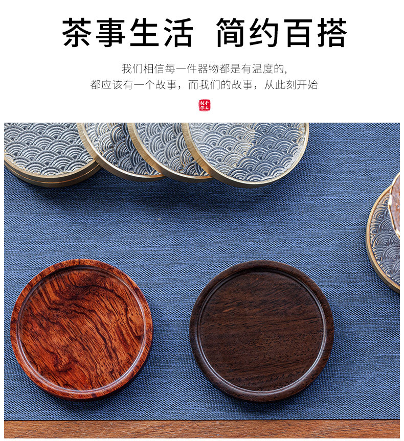 6 bộ đế lót ly gỗ Đàn hương đen, lót ly trà thủy tinh dát đồng thau, lót cách nhiệt hình tròn, Phụ Kiện Bộ trà khay trà kiểu Trung Quốc