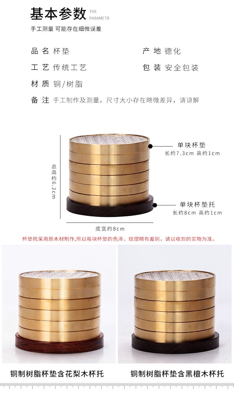 - 6 bộ đế lót ly gỗ Đàn hương đen, lót ly trà thủy tinh dát đồng thau, lót cách nhiệt hình tròn, Phụ Kiện Bộ trà khay trà kiểu Trung Quốc