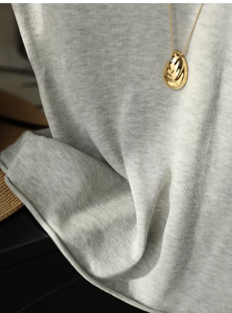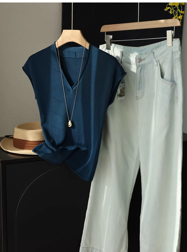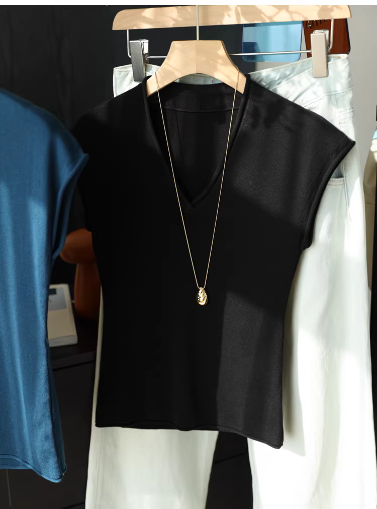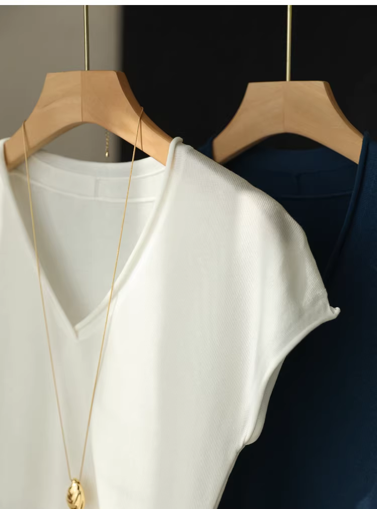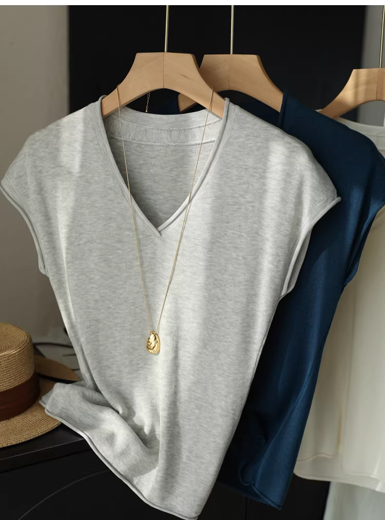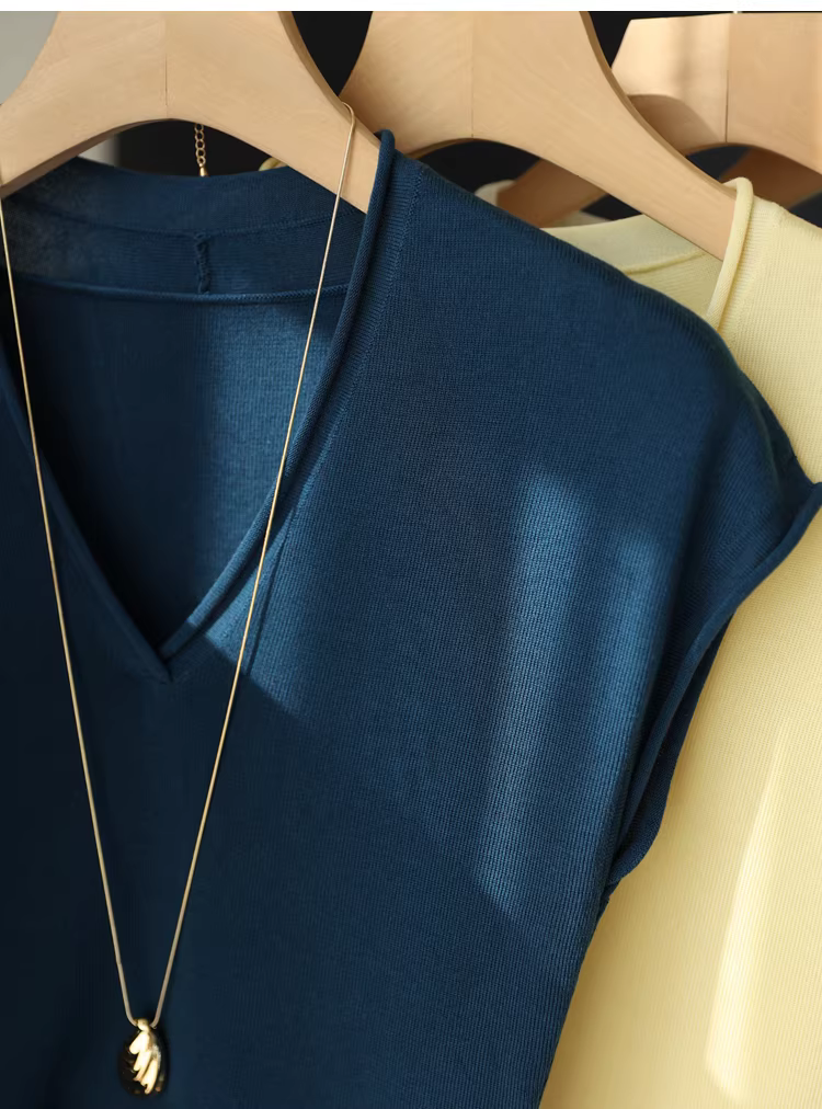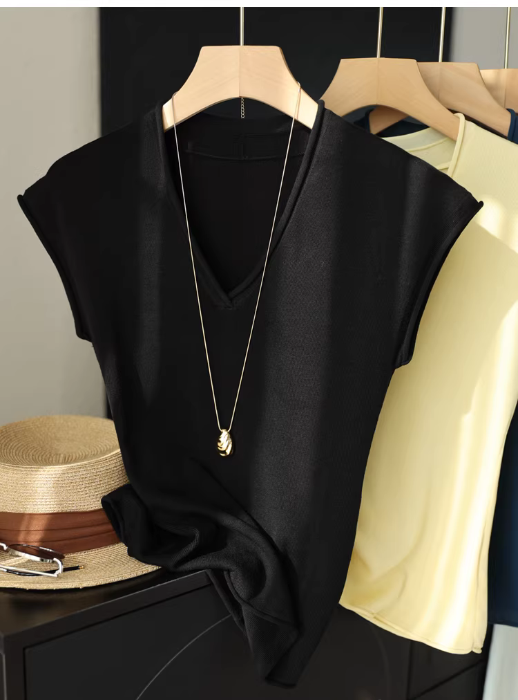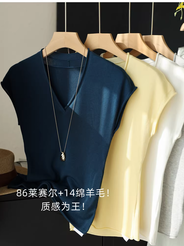 86% Lyocell + 14% len siêu mịn, áo thun ngắn tay dệt kim cổ chữ V tôn dáng, viền cuốn, dành cho nữ, mùa hè