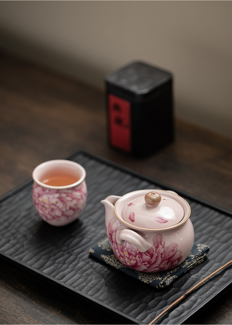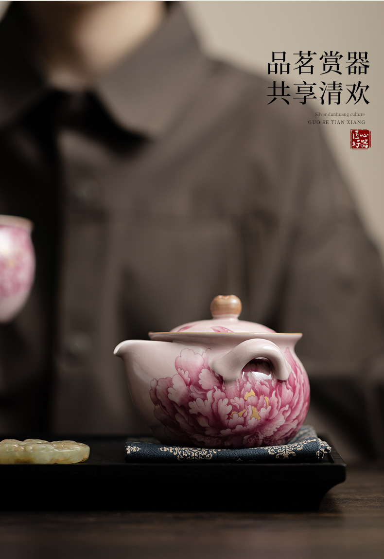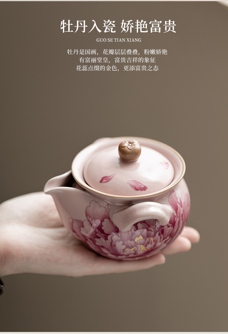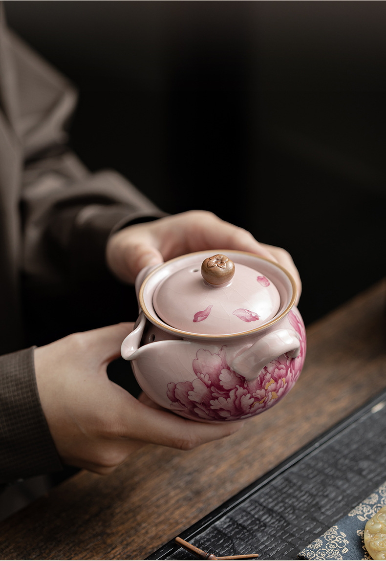 - Ấm cầm tay hoa mẫu đơn Ru Kiln màu hồng ấm pha trà bộ trà Kung Fu đơn dụng cụ pha trà chống bỏng gốm sứ gia dụng hộp quà