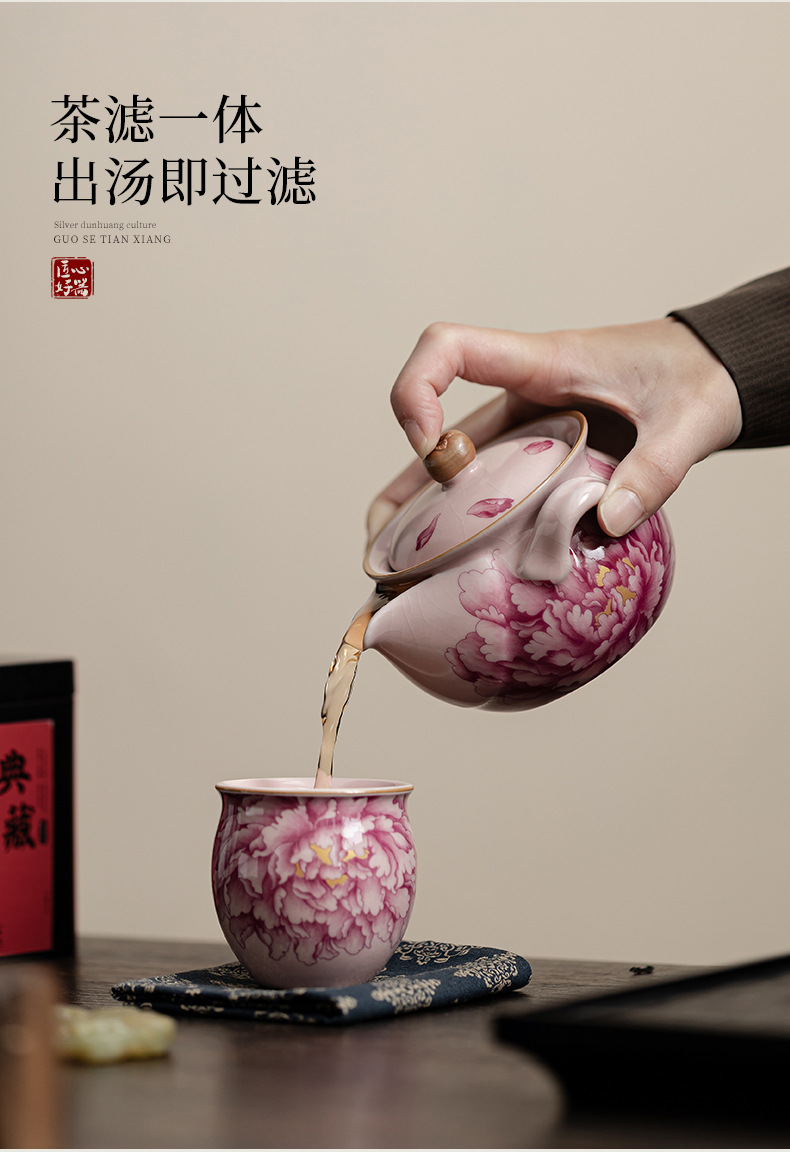 Ấm cầm tay hoa mẫu đơn Ru Kiln màu hồng ấm pha trà bộ trà Kung Fu đơn dụng cụ pha trà chống bỏng gốm sứ gia dụng hộp quà