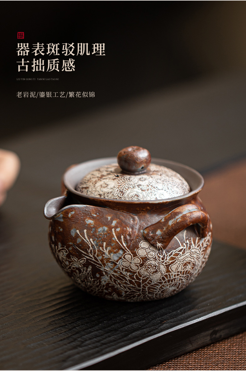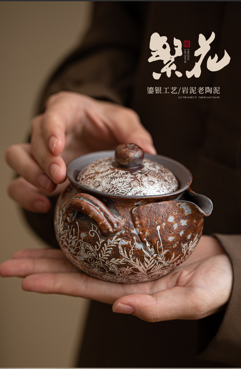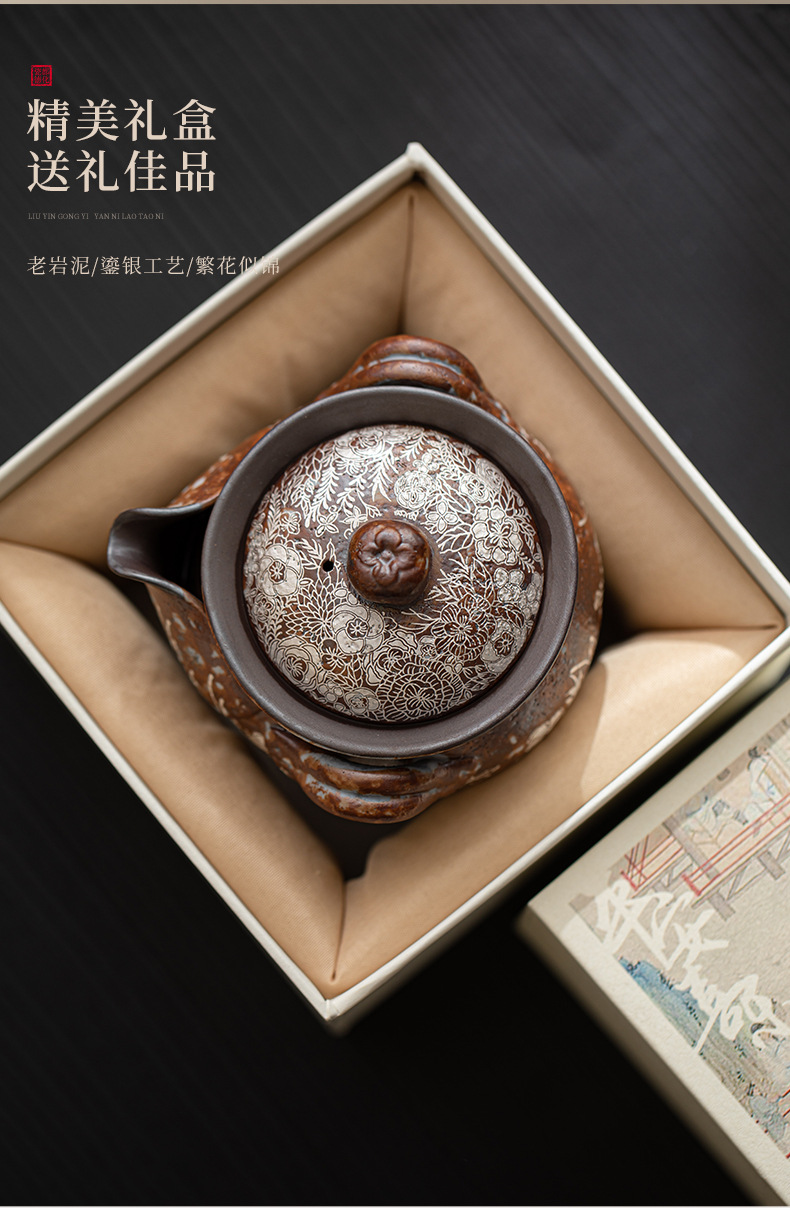 Ấm đun nước cầm tay bằng bạc mạ hoa, ấm pha trà Kung Fu bằng đất sét đá cũ, ấm pha trà, bình kho báu, bát có nắp chống bỏng