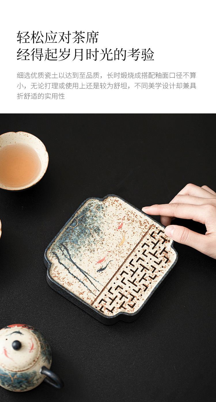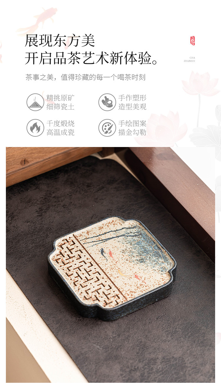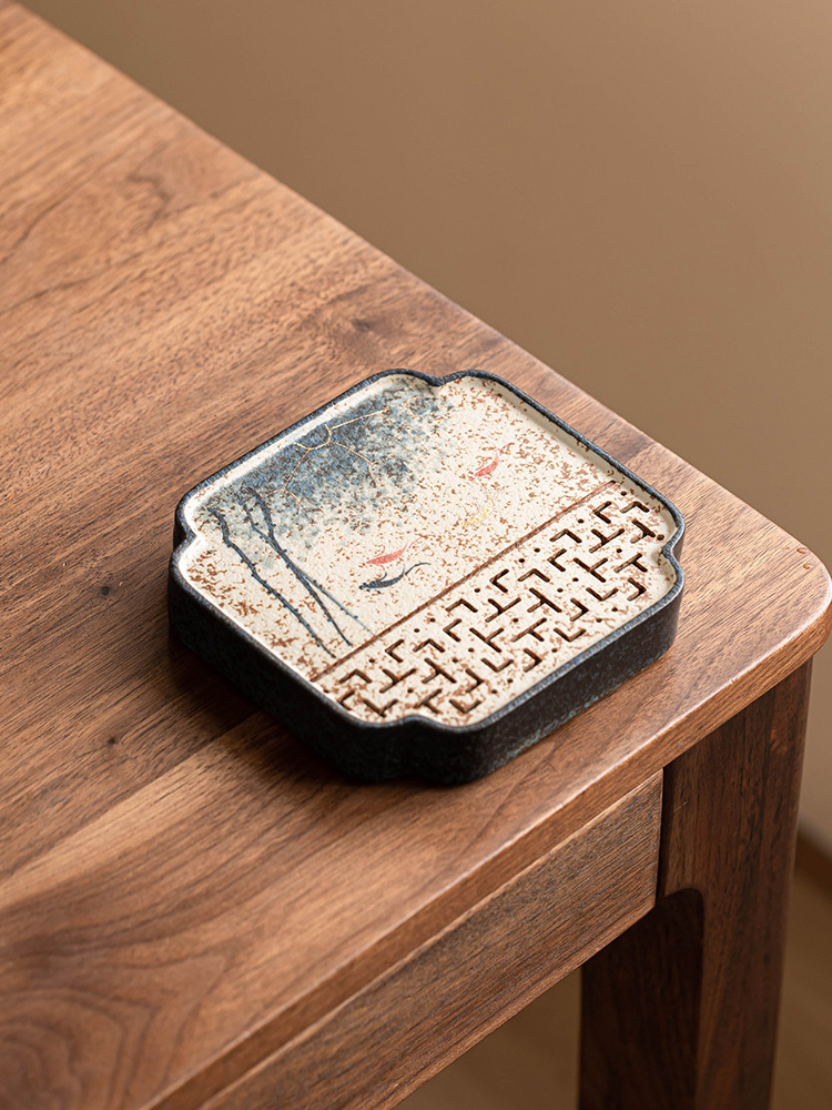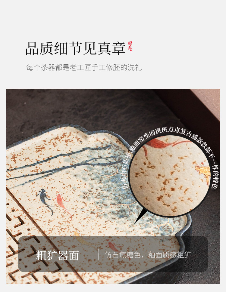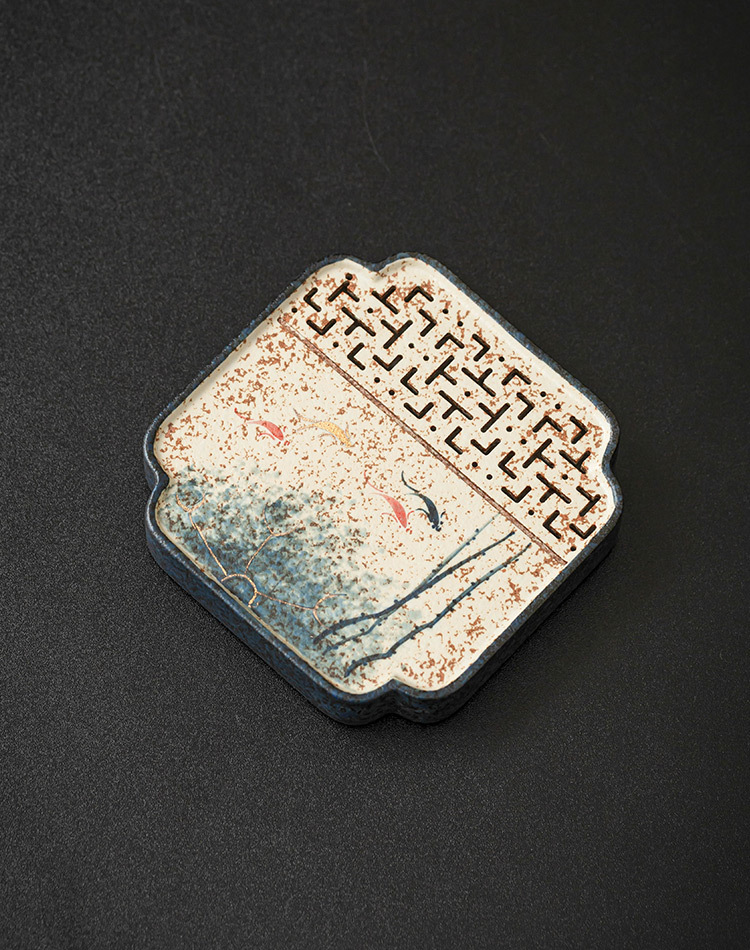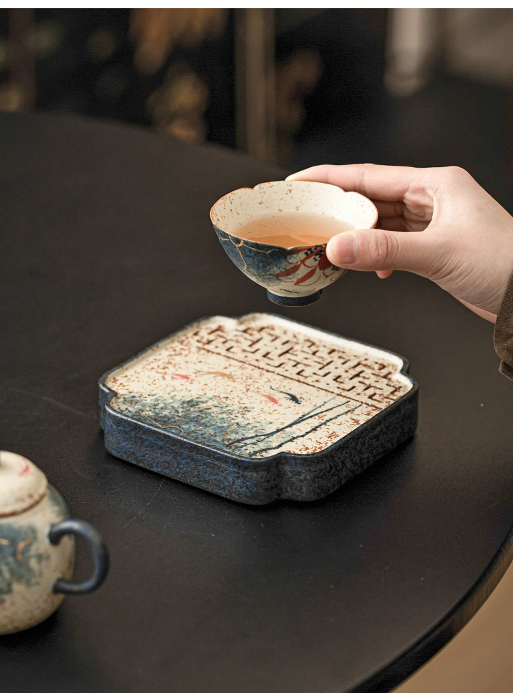 Ấm gốm đỏ đá lửa trắng xanh, bàn pha khô, vẽ tay vàng, khay trà cá koi vần sen vẽ tay, phụ kiện trà đạo