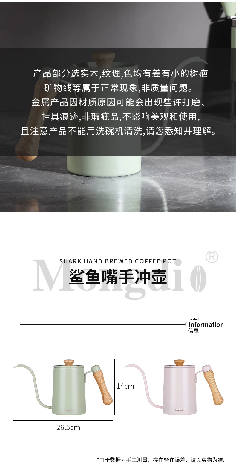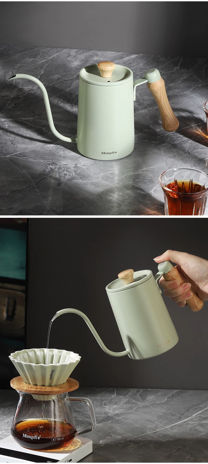 - Ấm pha cà phê Mongdio có vòi dài, ấm pha cà phê bằng thép không gỉ, ấm có vòi hẹp dùng trong gia đình.