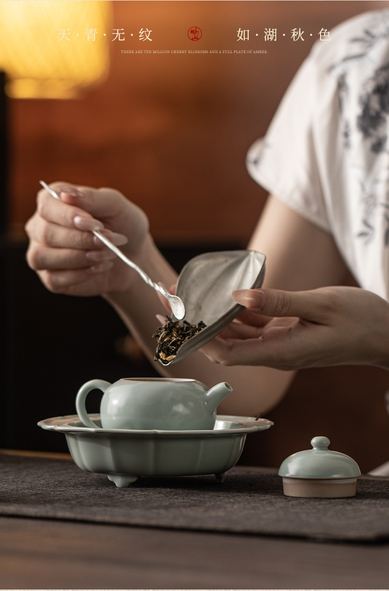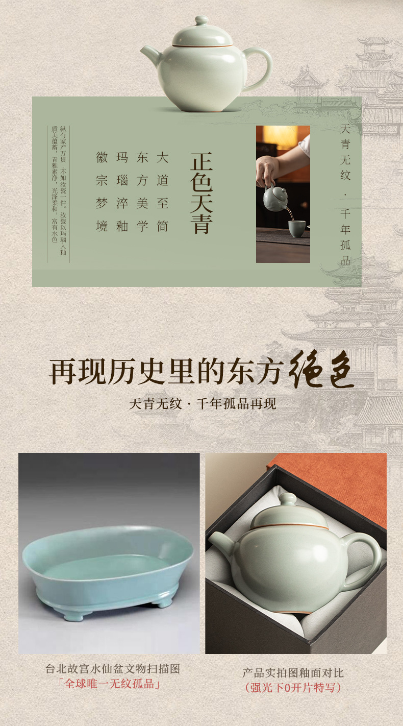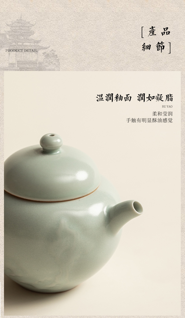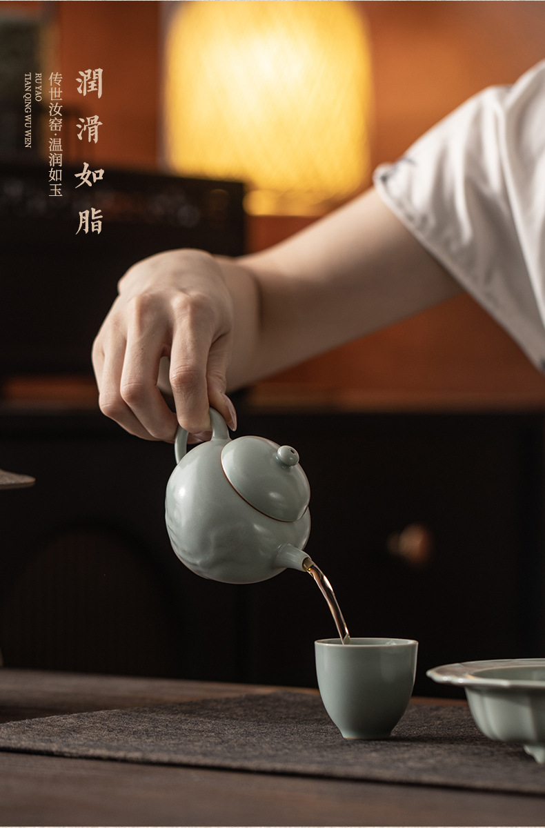 Ấm trà gốm sứ thủ công Trung Quốc Sky Blue Ru Kiln Dream Round Pot, có lỗ lọc, kiểu dáng cầu kỳ