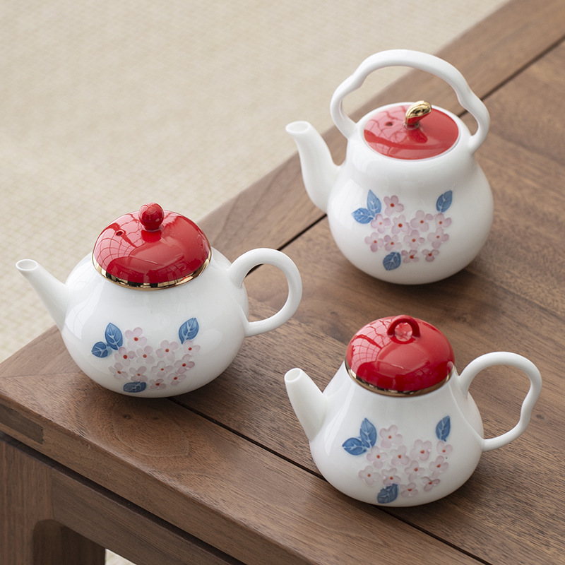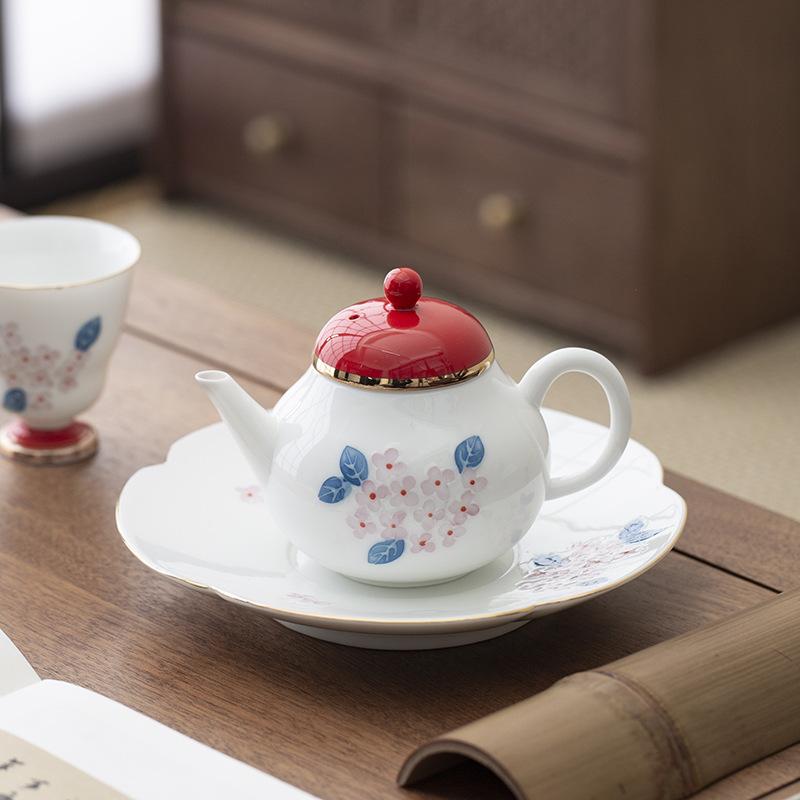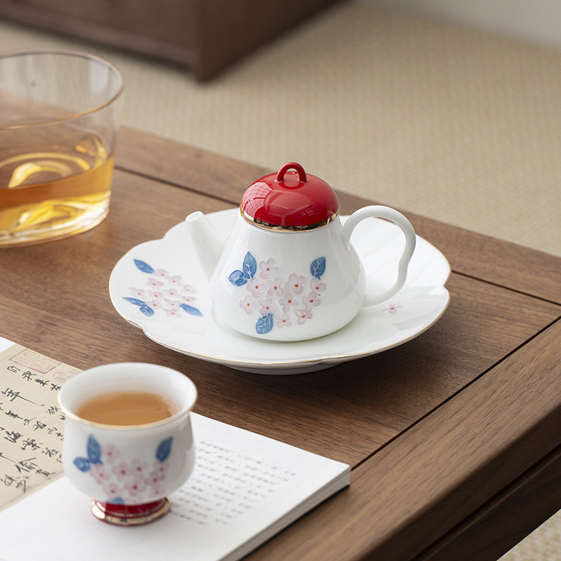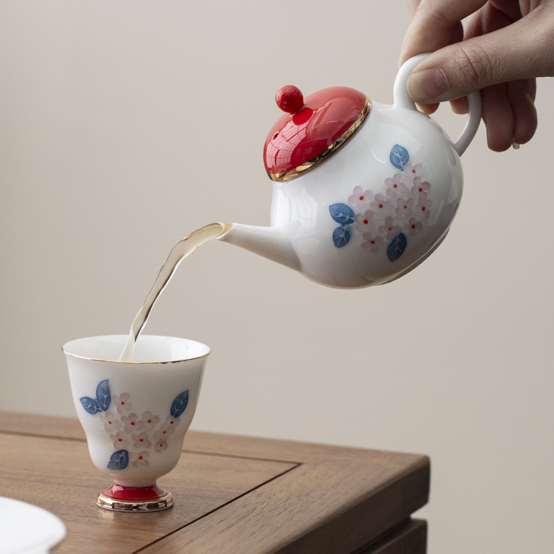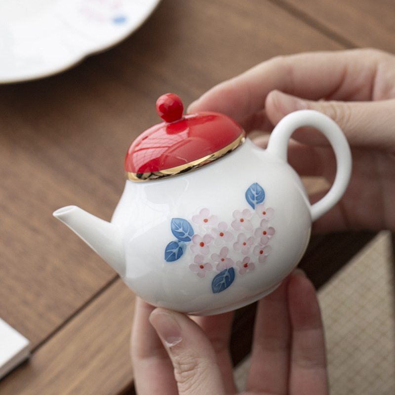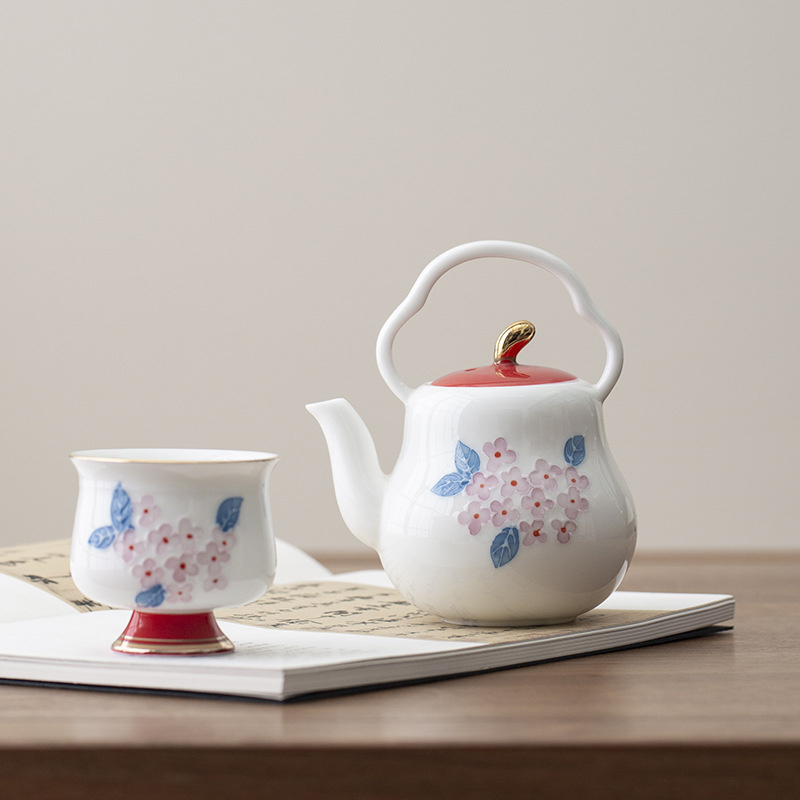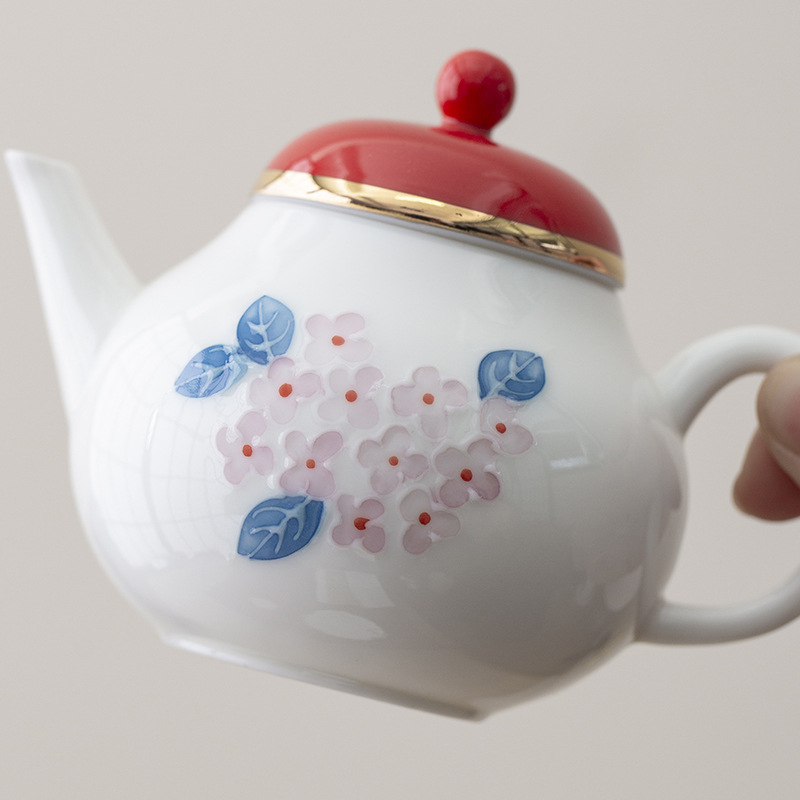 Ấm trà tráng men màu vẽ tay, ấm đơn hoa cẩm tú cầu cổ điển, dụng cụ pha trà gốm sứ cao cấp gia dụng