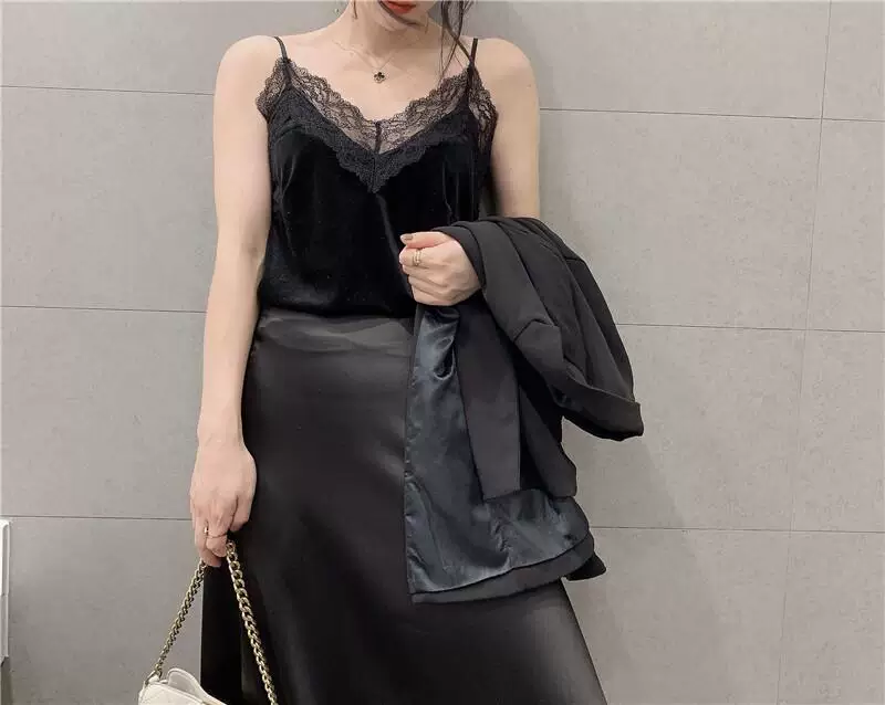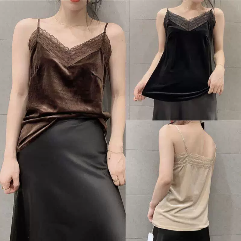 - Áo camisole nhung dây mảnh gợi cảm phong cách Hàn Quốc, áo lót ren cổ V, kiểu dáng ôm dáng, áo lót thời trang