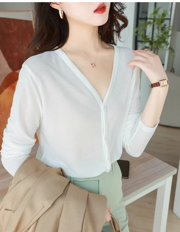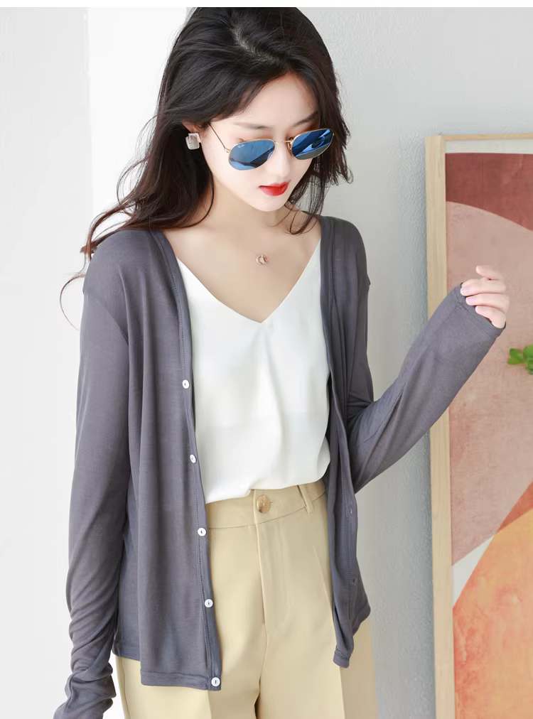 - Áo cardigan dệt kim cổ chữ V dài tay dáng rộng mát mẻ Lyocell dành cho nữ màu trơn