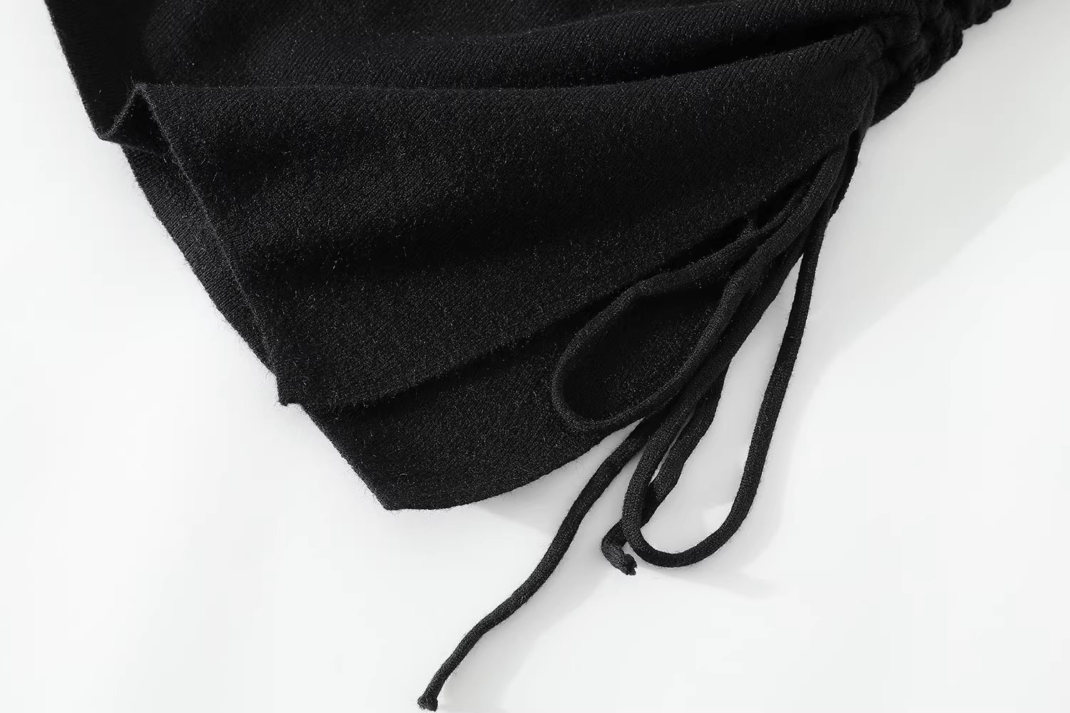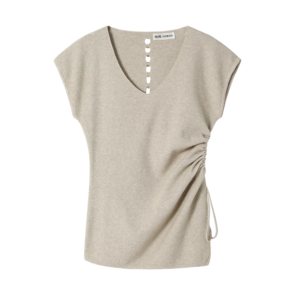 Áo dệt kim ngắn tay kiểu Pháp giản dị dành cho nữ, thiết kế xuân thu, ôm dáng, áo có dây rút xếp ly
