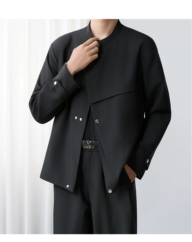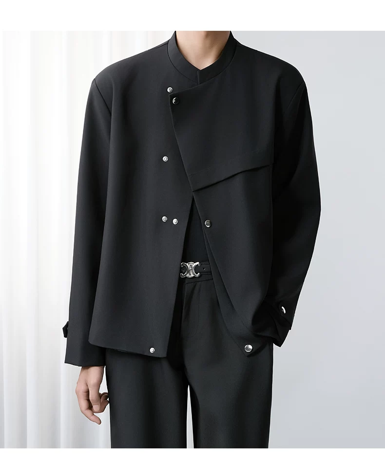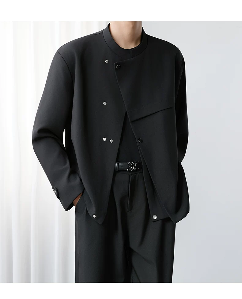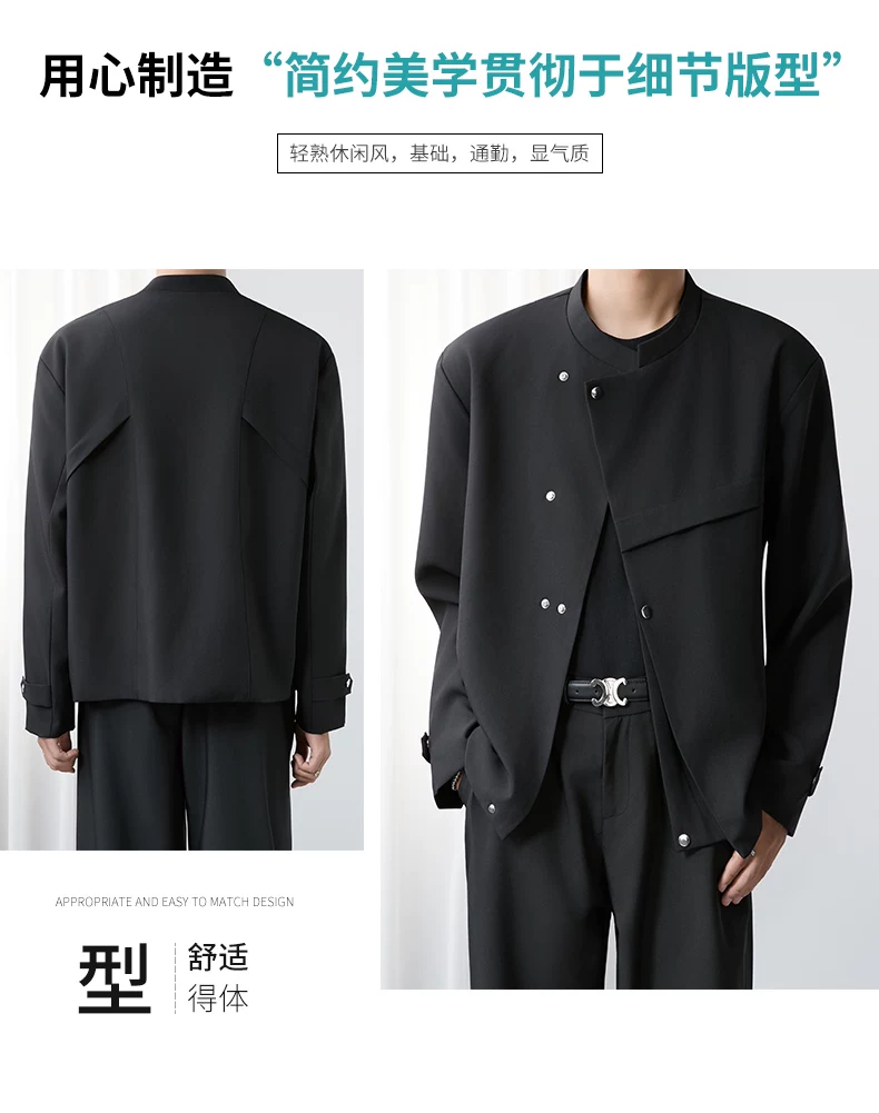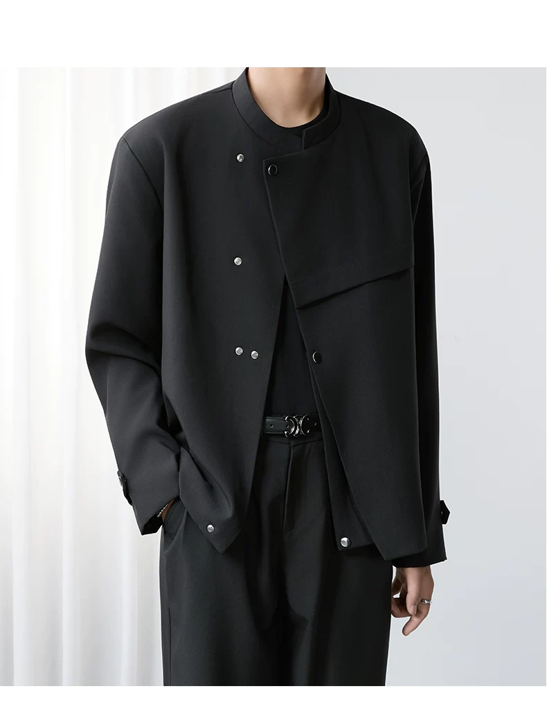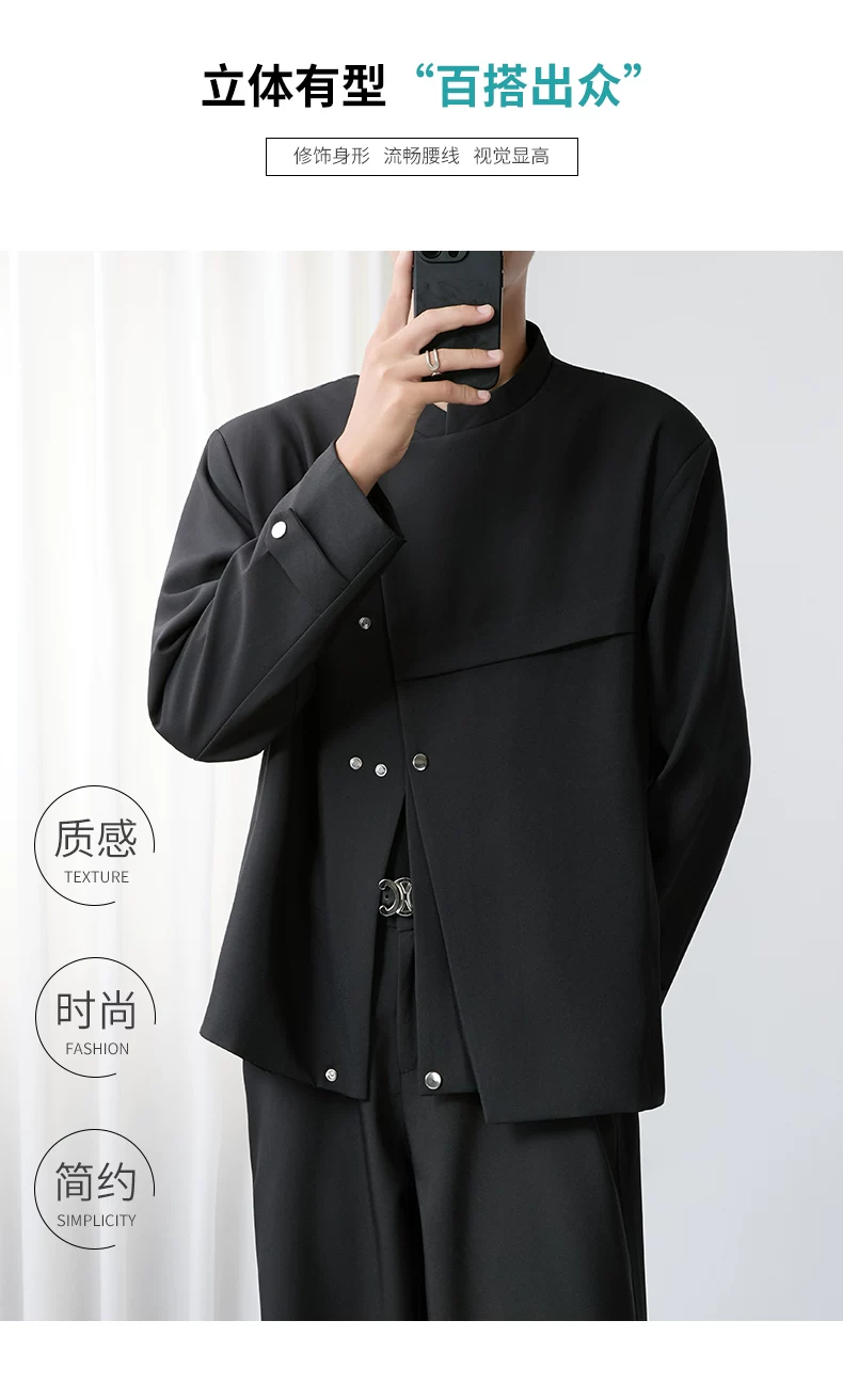 - Áo khoác blazer nam màu đen, dáng rộng, thiết kế phá cách, cổ đứng, kiểu xuân thu 2025, có đệm vai, chất liệu cao cấp, phong cách Trung Sơn.