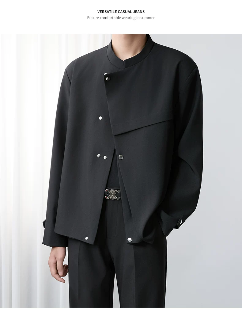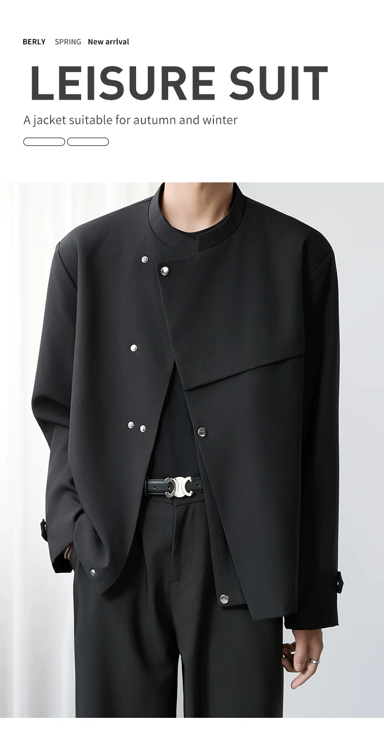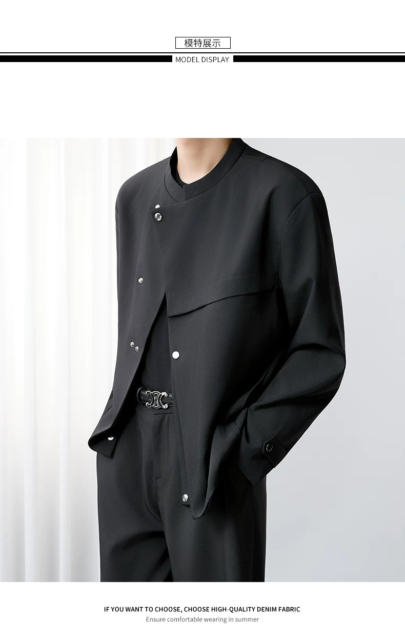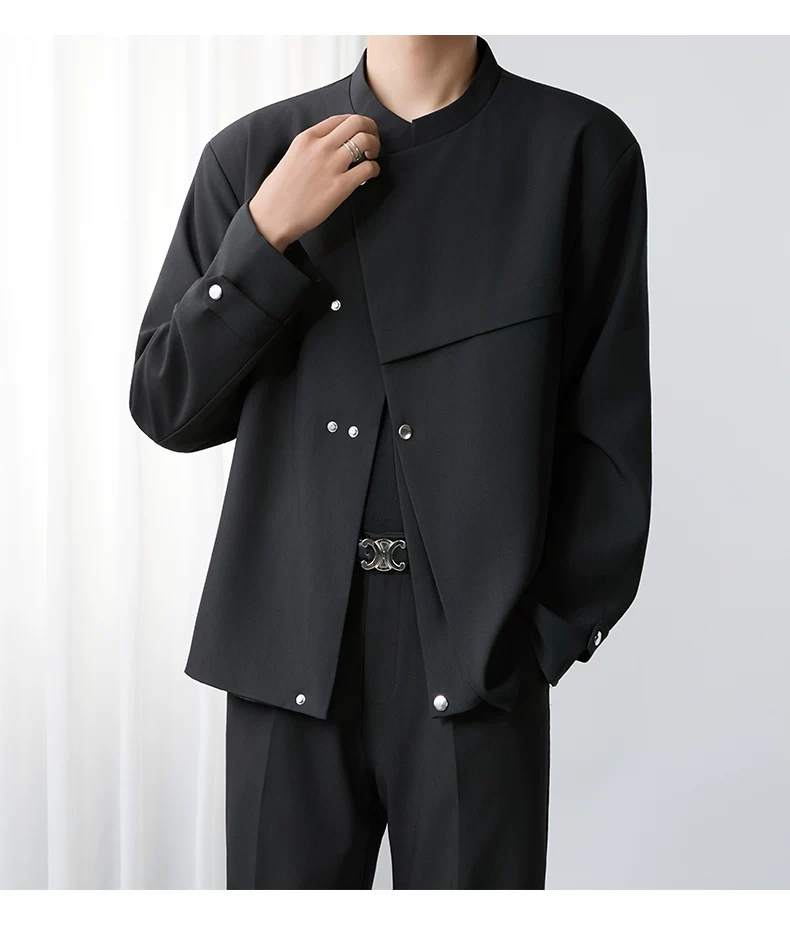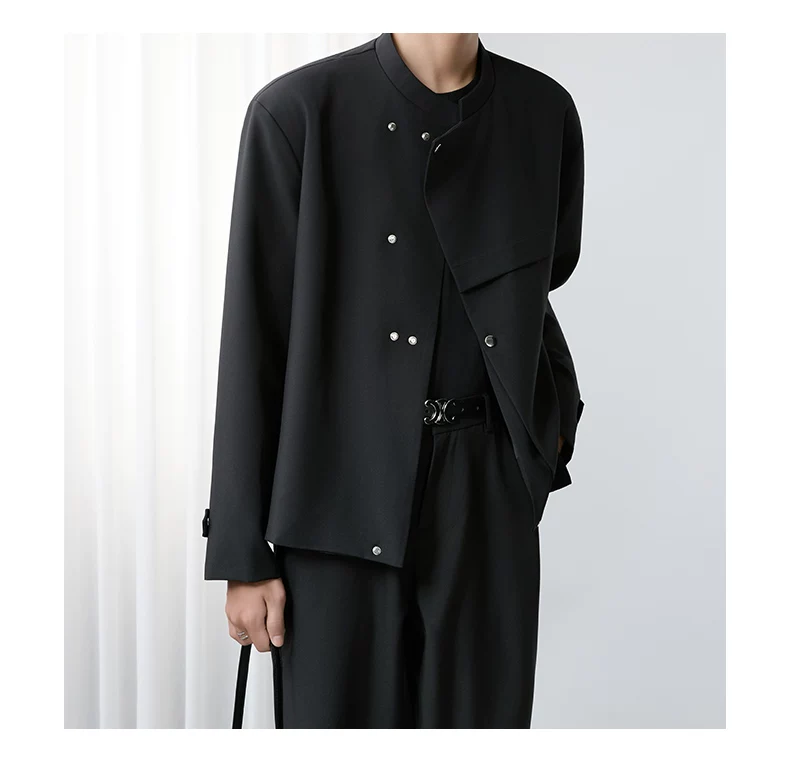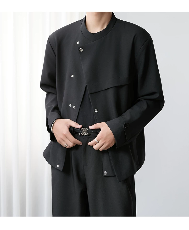 - Áo khoác blazer nam màu đen, dáng rộng, thiết kế phá cách, cổ đứng, kiểu xuân thu 2025, có đệm vai, chất liệu cao cấp, phong cách Trung Sơn.
