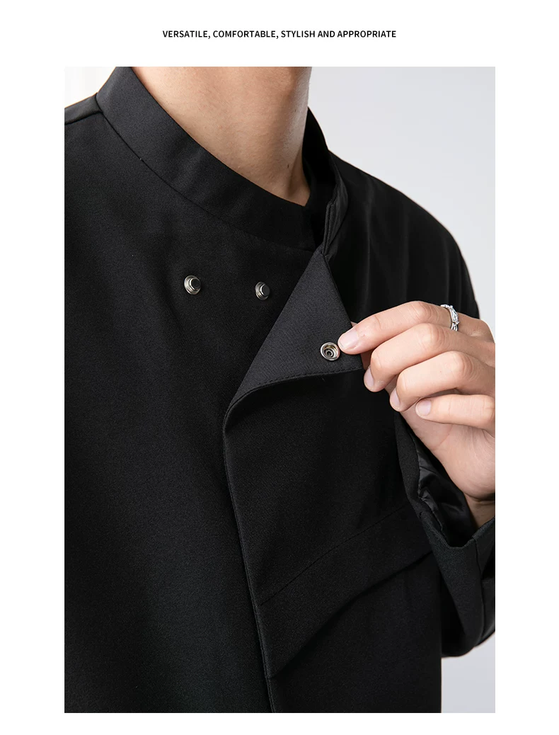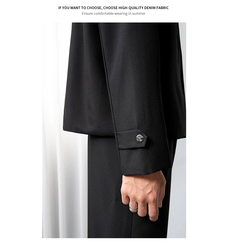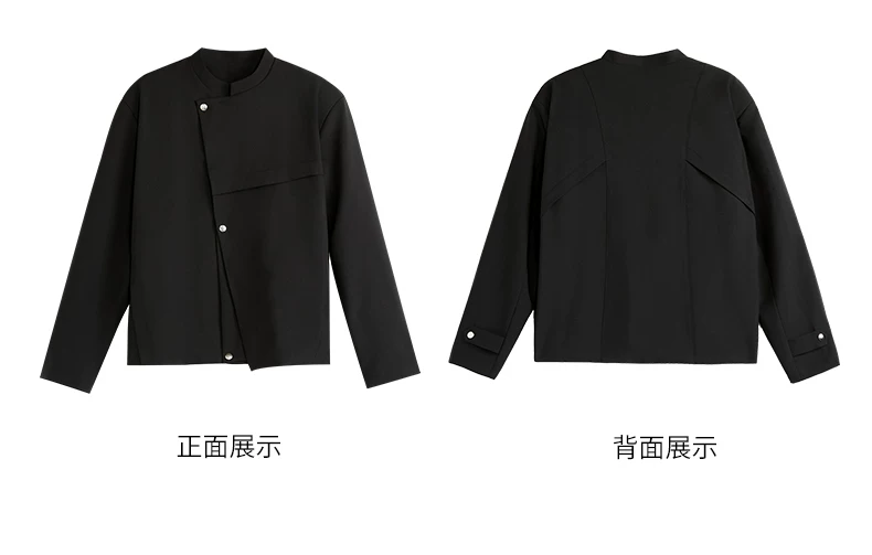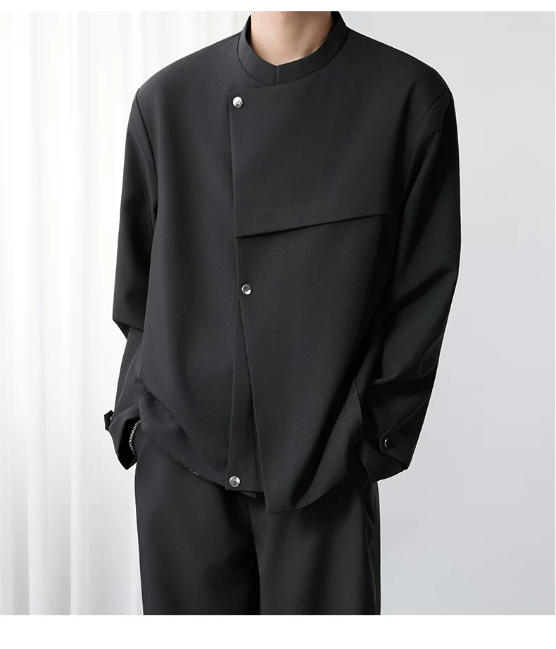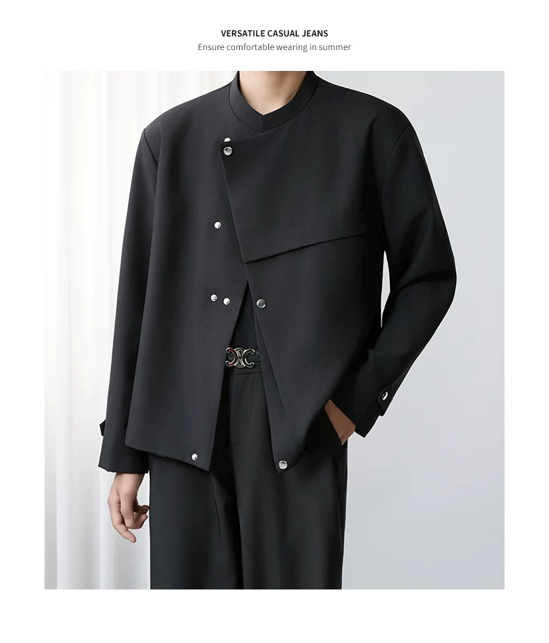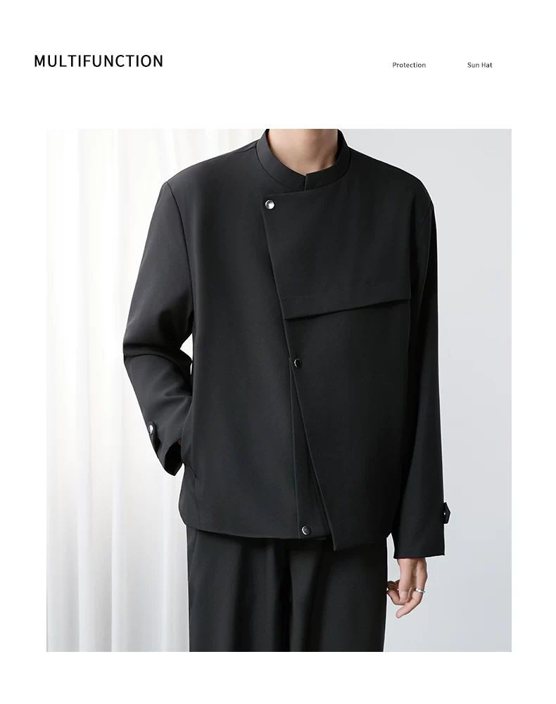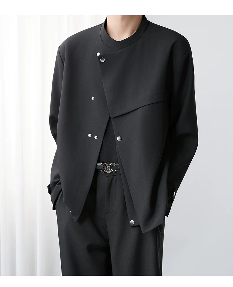 - Áo khoác blazer nam màu đen, dáng rộng, thiết kế phá cách, cổ đứng, kiểu xuân thu 2025, có đệm vai, chất liệu cao cấp, phong cách Trung Sơn.