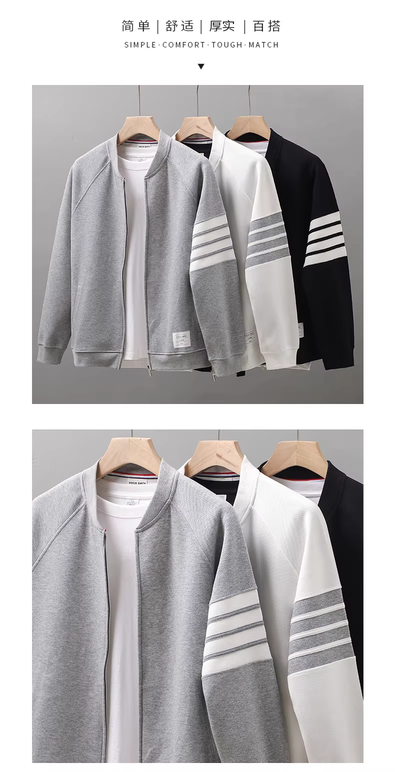 Áo khoác bốn sọc kiểu Nhật dành cho nam, áo khoác bóng chày cổ đứng dáng rộng, chất liệu dày dặn, không có mũ trùm đầu, áo cardigan kiểu dáng thời trang