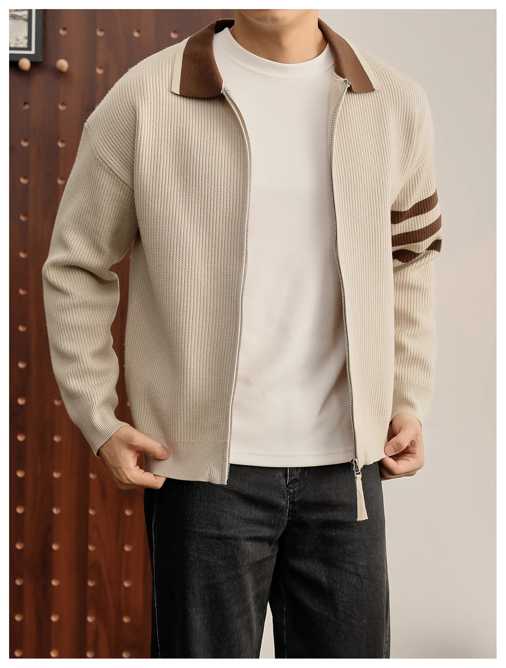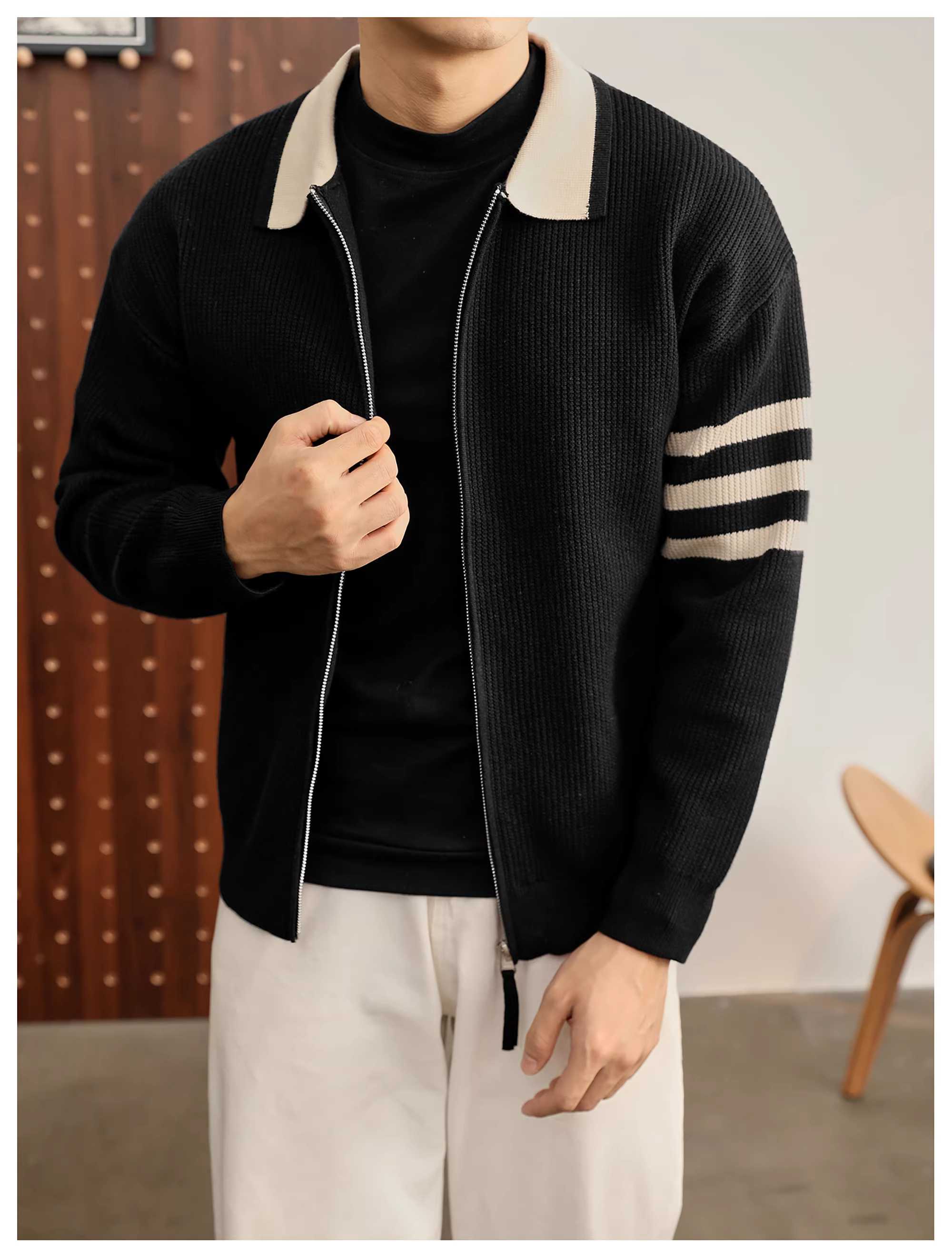 Áo khoác cardigan dệt kim ba sọc phong cách Mỹ thời thượng, phối màu, chất liệu lyocell Tencel, cổ áo phối màu, kiểu dáng casual dành cho nam