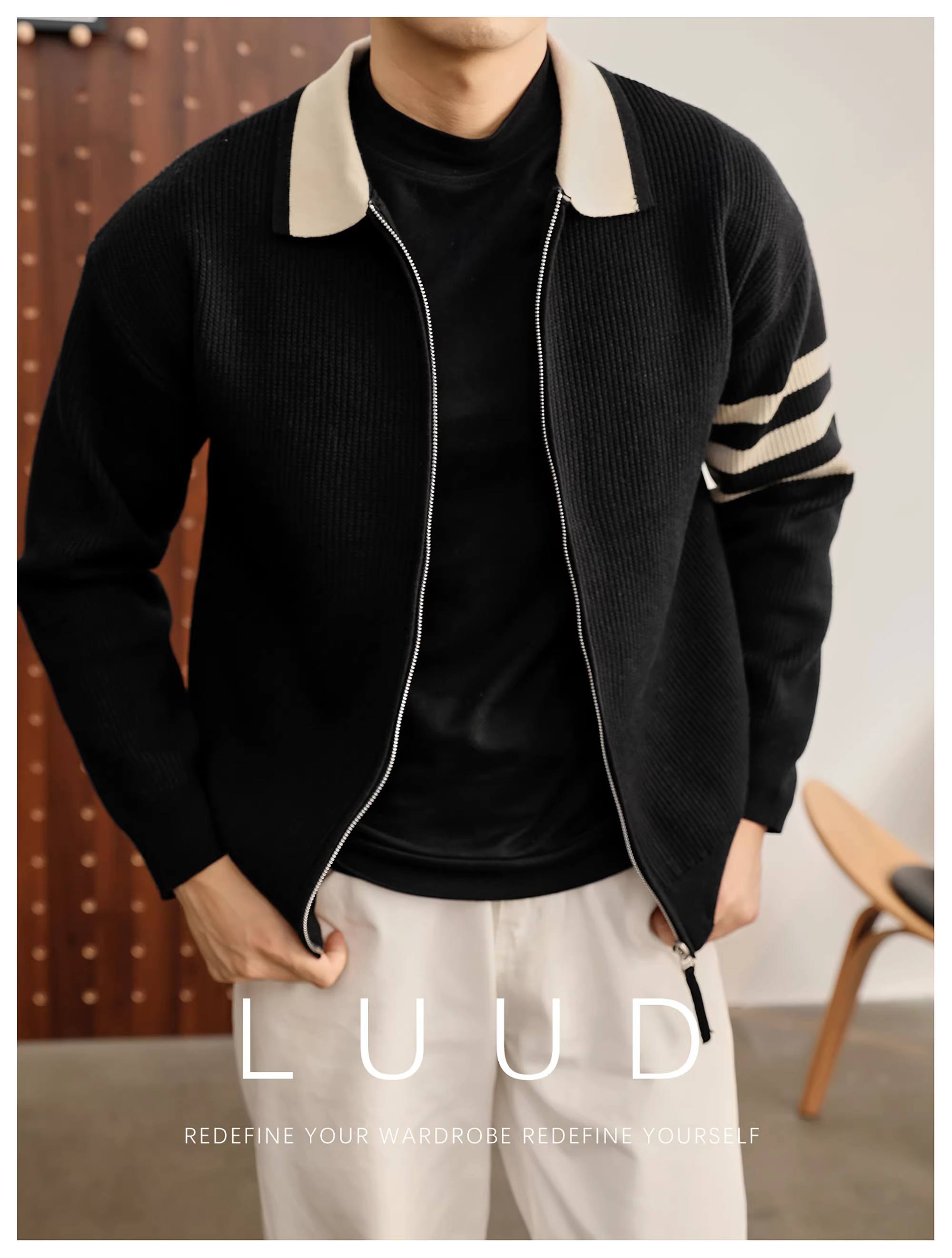 - Áo khoác cardigan dệt kim ba sọc phong cách Mỹ thời thượng, phối màu, chất liệu lyocell Tencel, cổ áo phối màu, kiểu dáng casual dành cho nam