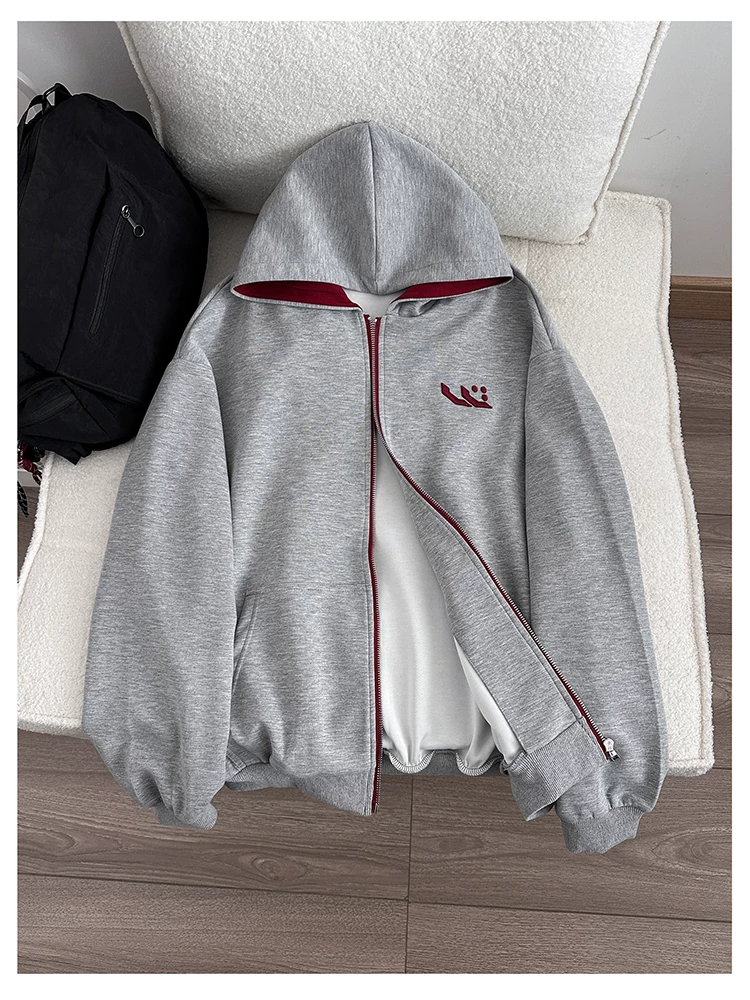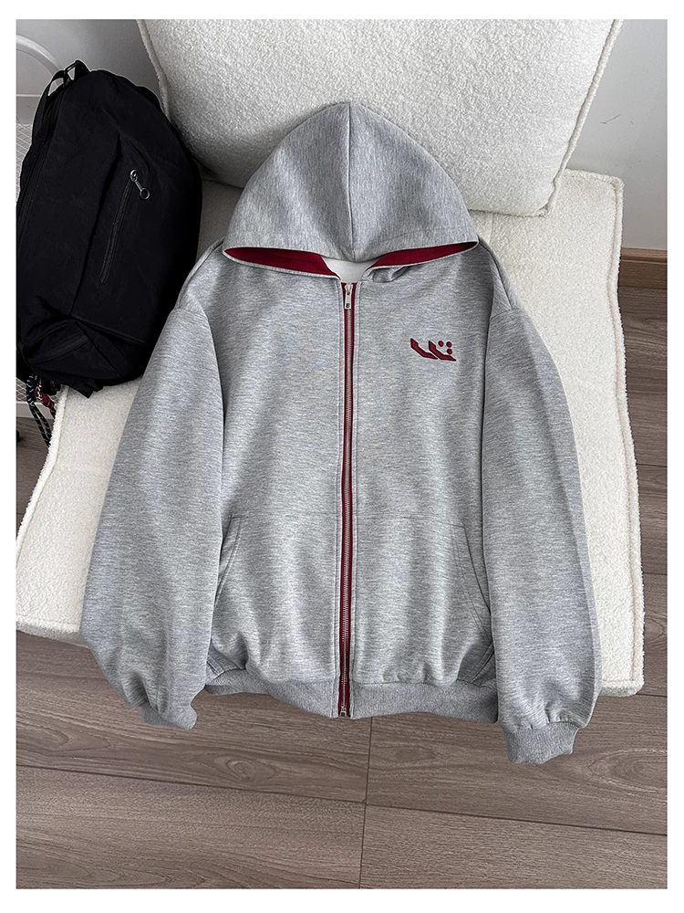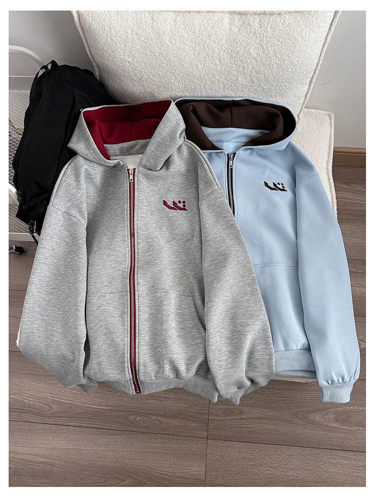 Áo khoác có mũ thêu kiểu Mỹ dành cho nam và nữ, áo khoác có khóa kéo thường ngày mùa xuân thu, áo khoác ngoài rộng rãi hợp thời trang dành cho cặp đôi.