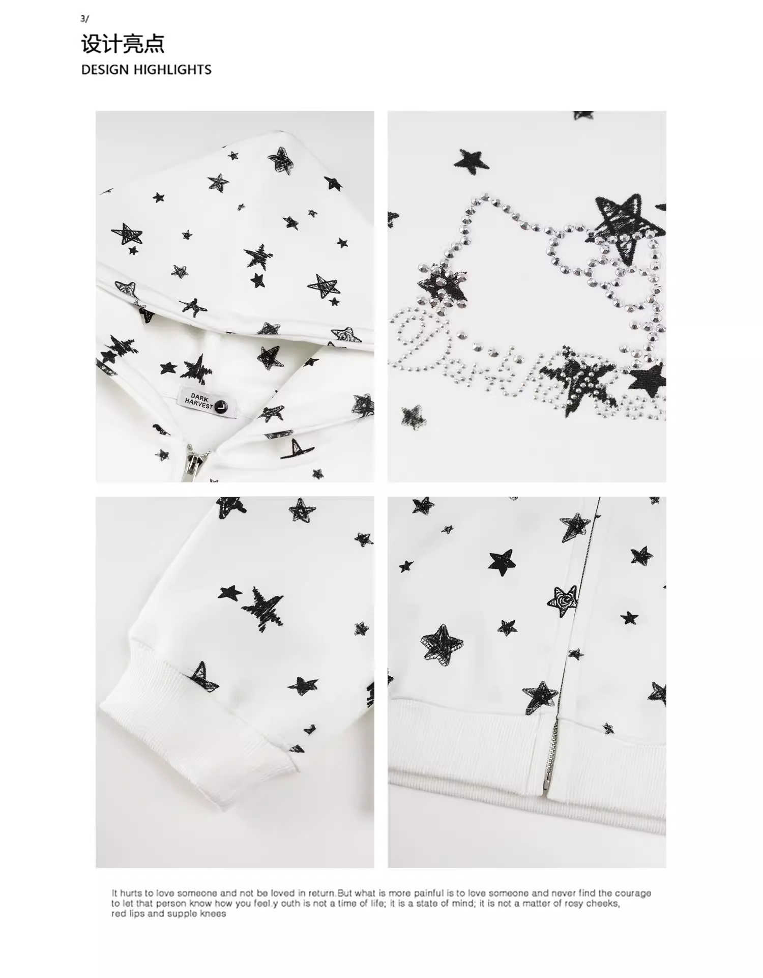 Áo khoác có mũ trùm đầu kiểu Mỹ cổ điển K787 đính đá toàn thân hình mèo KT, dáng rộng, phong cách thường ngày, đa năng, dành cho cặp đôi, có khóa kéo