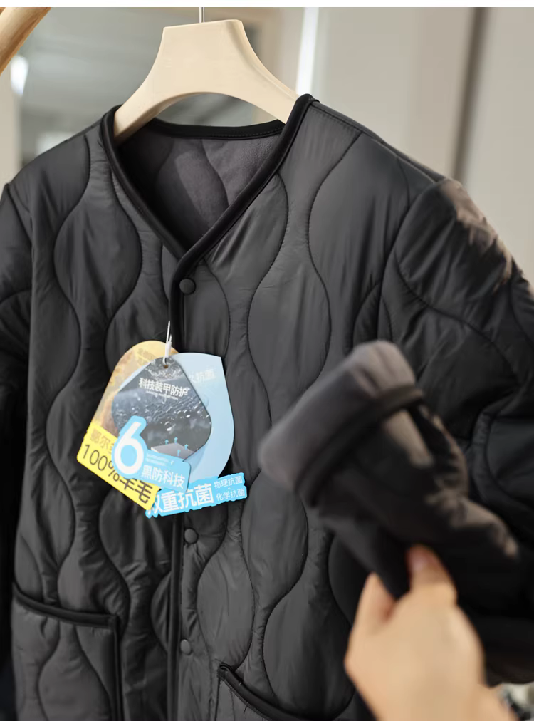 Áo khoác cotton dày dặn, lót lông cừu ba lớp, có thể giặt bằng máy, cổ chữ V, thích hợp để mặc nhiều lớp với lớp lót bên trong dành cho nữ trong mùa thu đông.
