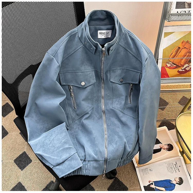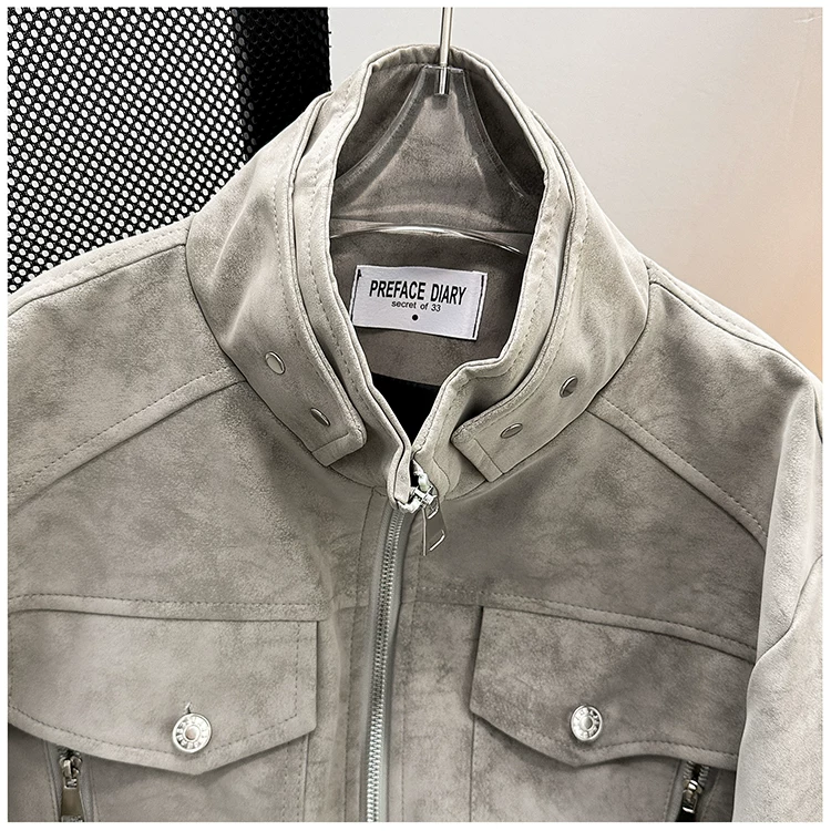 Áo khoác da kiểu Mỹ dành cho nam, mùa xuân, cao cấp, áo khoác da PU cá tính và thời trang, áo khoác Harrington cổ đứng kiểu dáng gọn gàng.