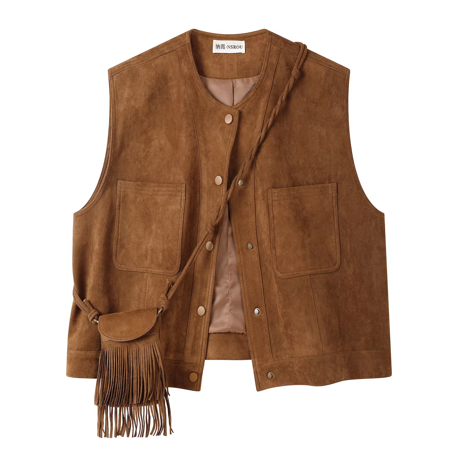 - Áo khoác da lộn phong cách retro đơn giản của Mỹ dành cho nữ, áo khoác ngắn không tay mùa thu