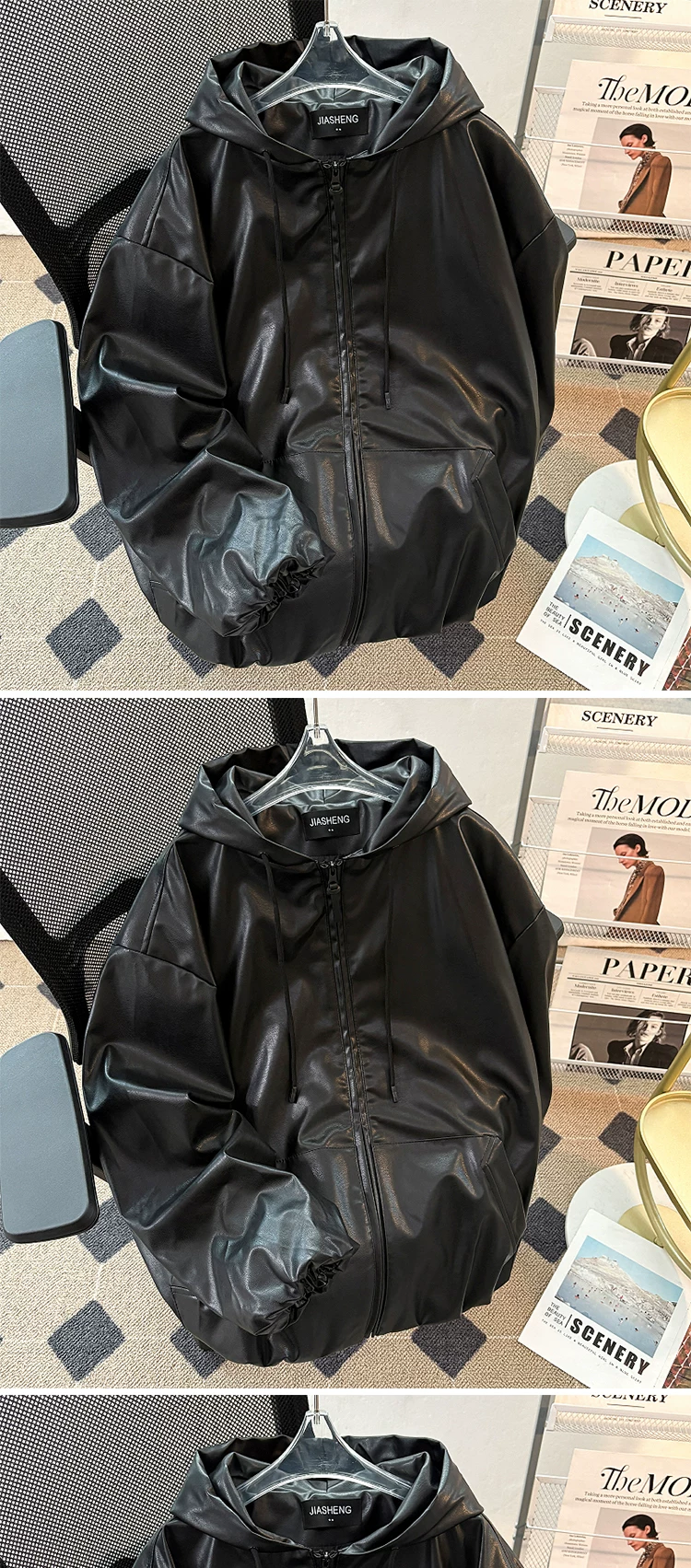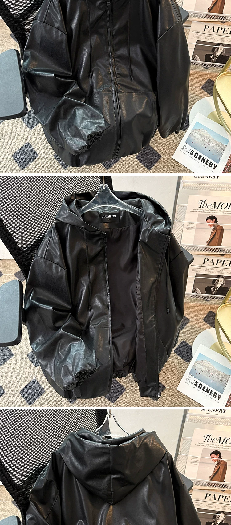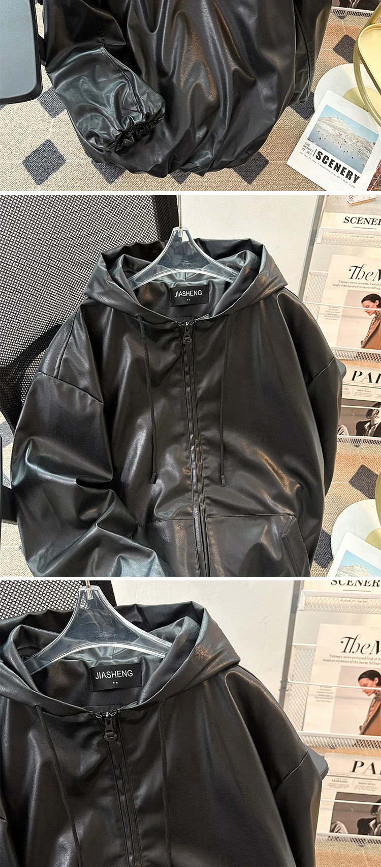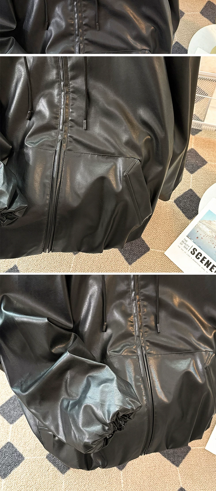 - Áo khoác da PU có mũ cao cấp dành cho nam, áo khoác phong cách Mỹ cổ điển hợp thời trang mùa thu, áo khoác biker rộng rãi cá tính.