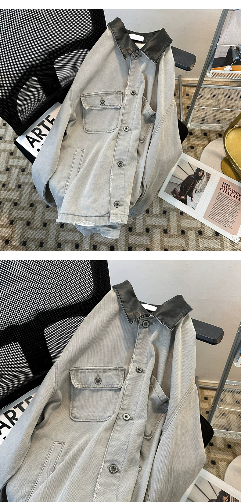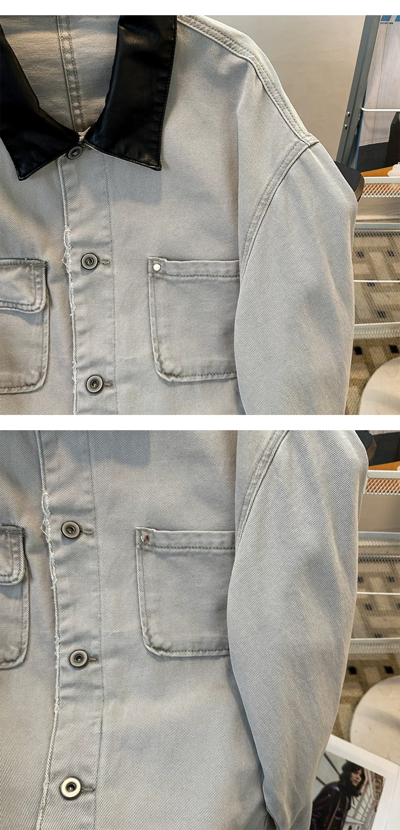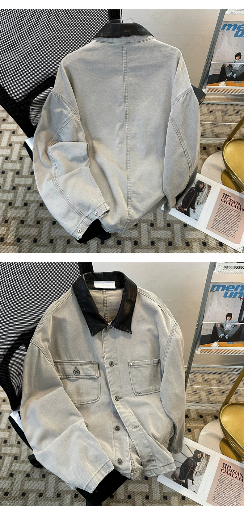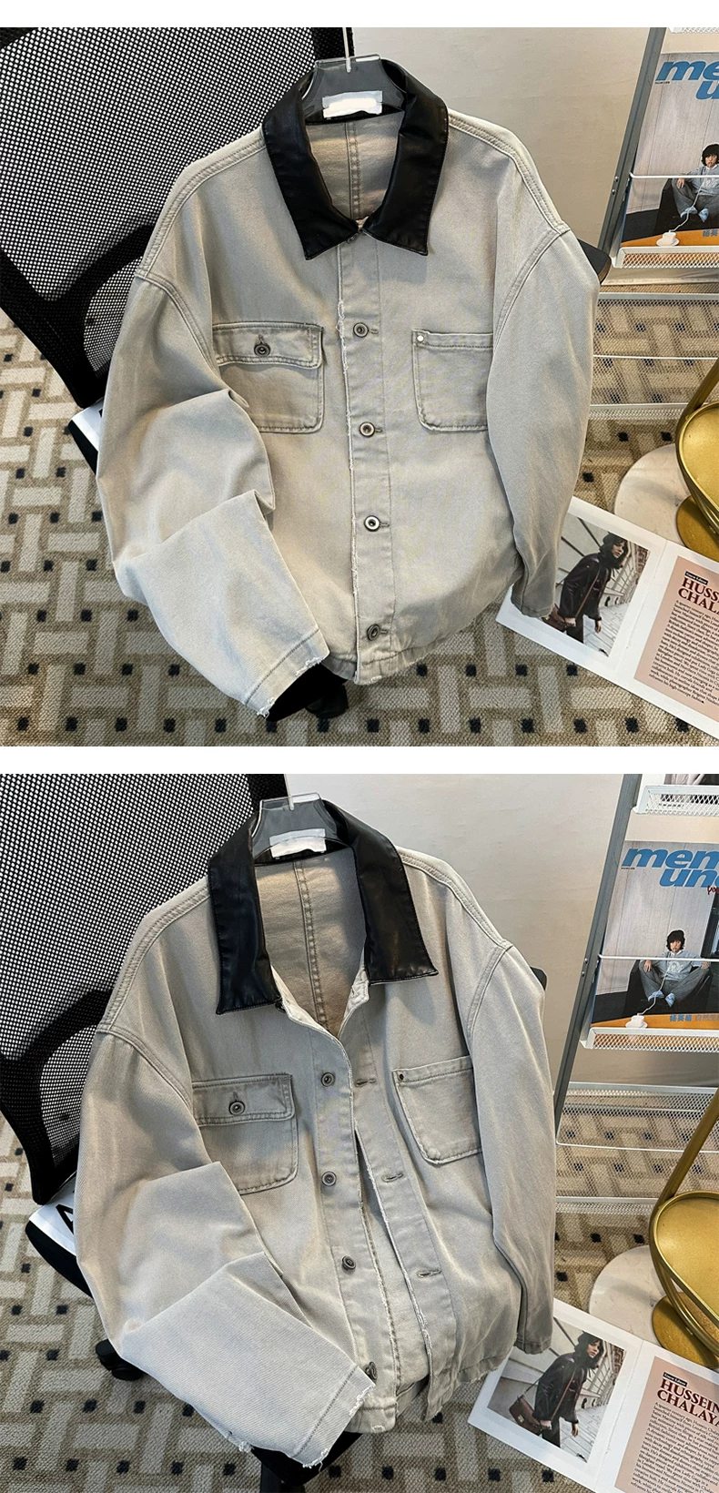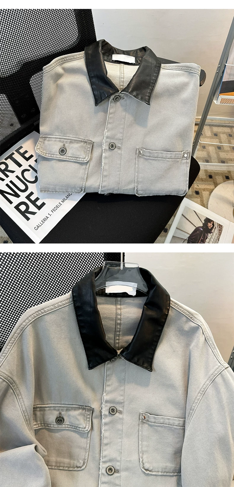 - Áo khoác da PU kiểu Mỹ phối chất liệu, áo khoác denim nam mùa xuân thu, kiểu dáng rộng rãi, hợp thời trang, thiết kế cổ điển.
