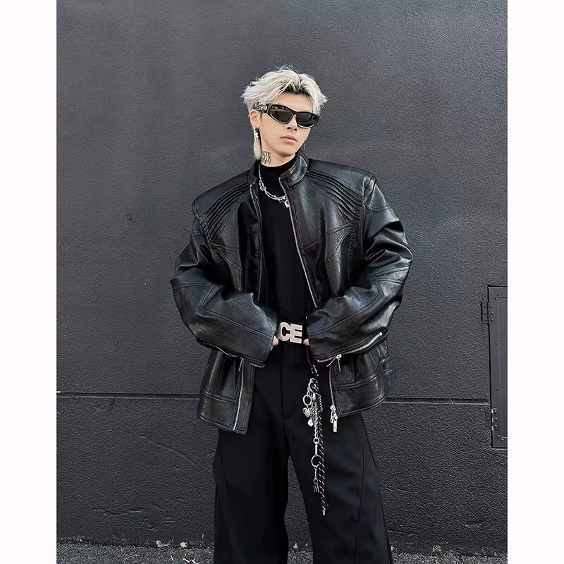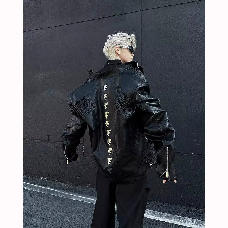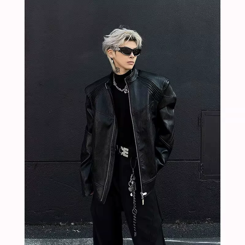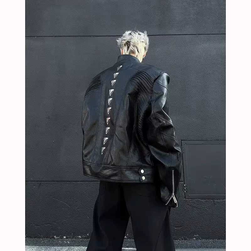 Áo khoác da PU thiết kế gờ kim loại, kiểu dáng đường phố Mỹ mùa xuân, áo khoác ngắn với cổ đứng độc đáo dành cho nam.