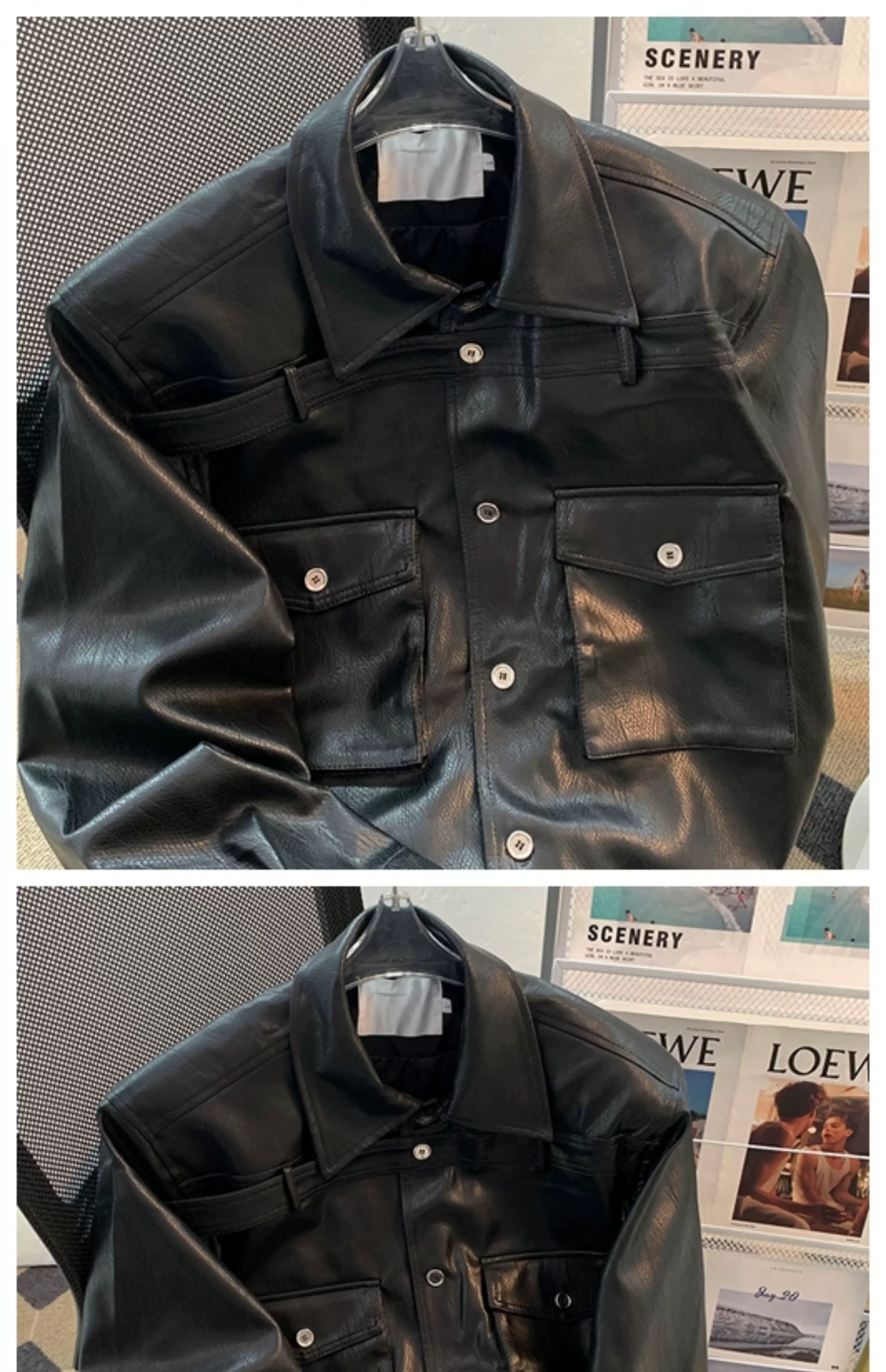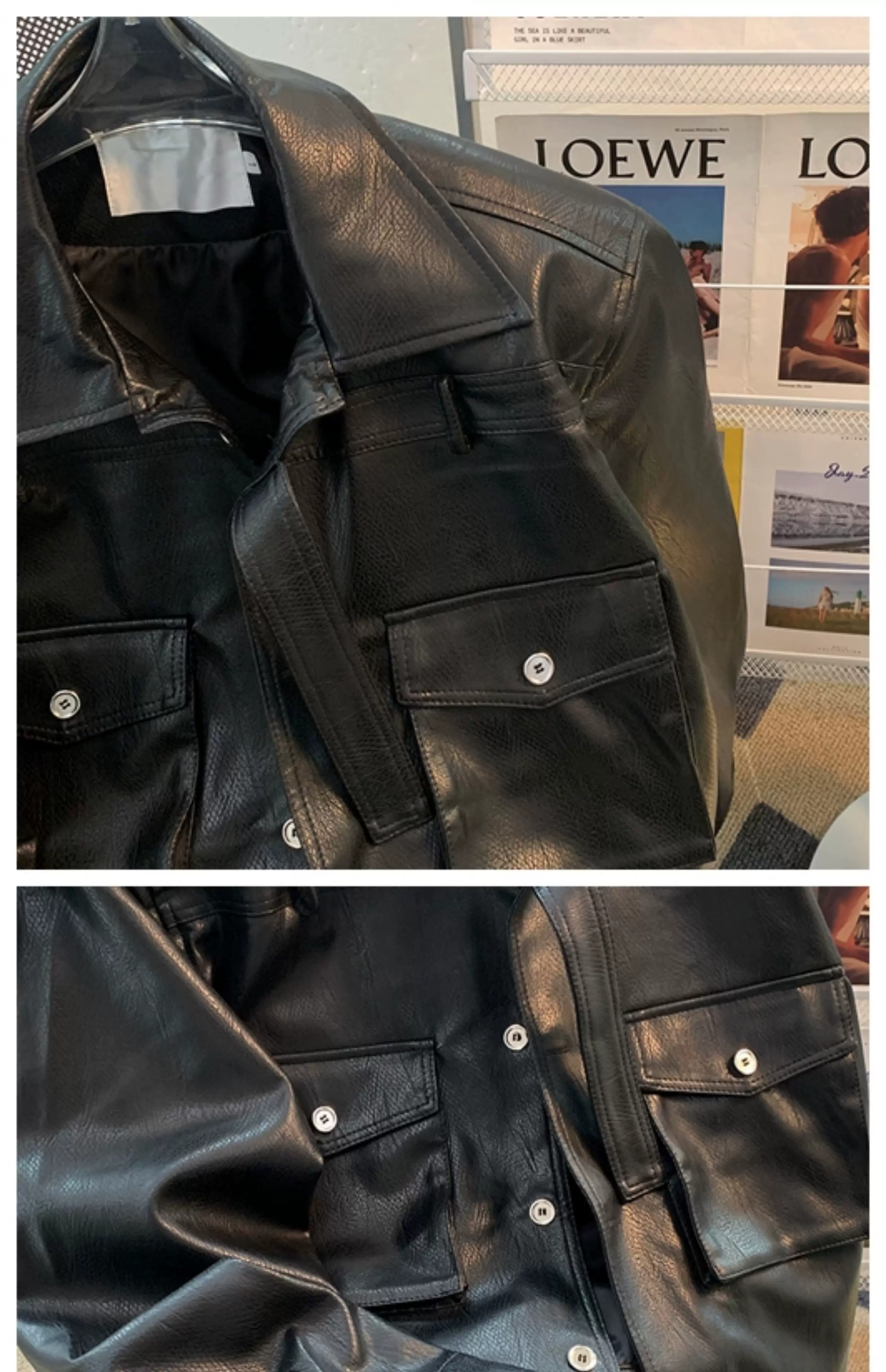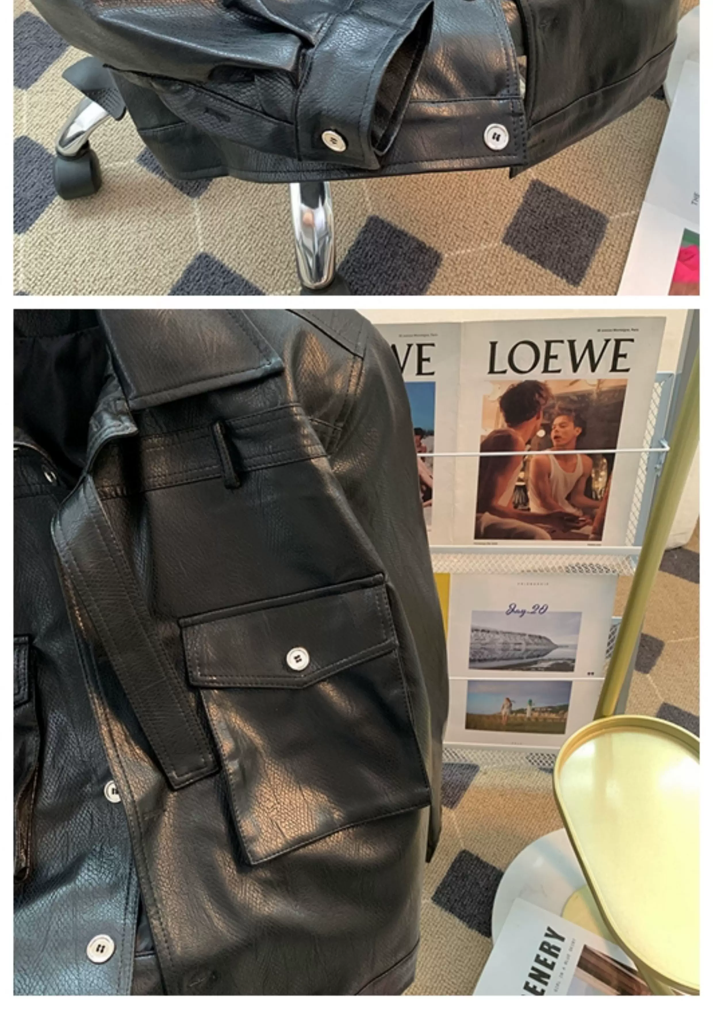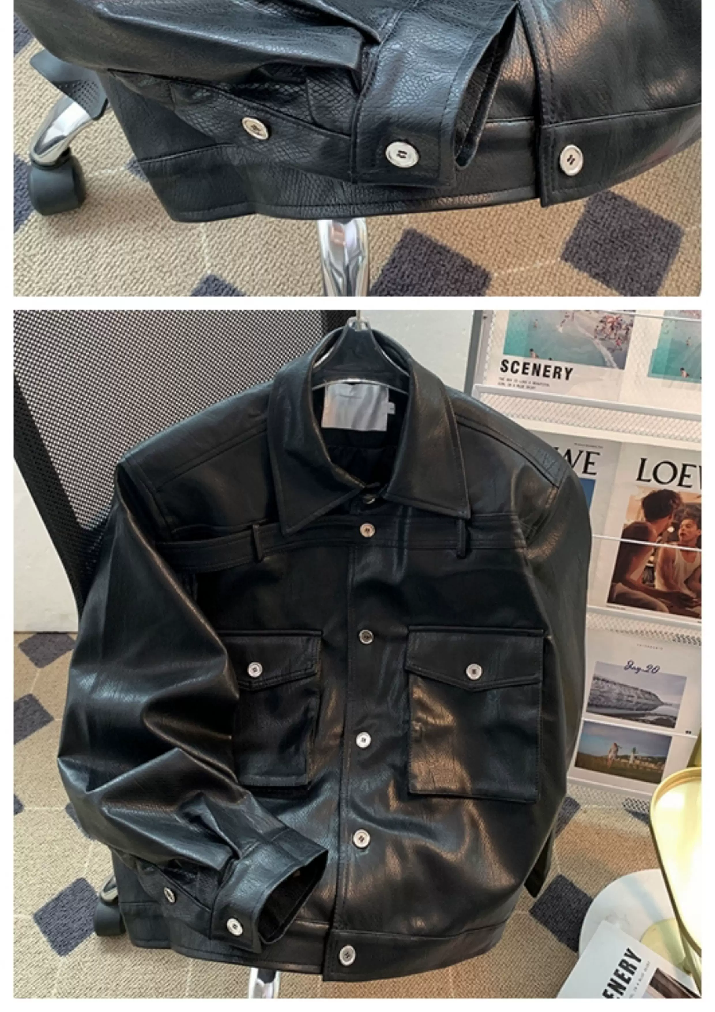 - Áo khoác da thiết kế phá cách dành cho nam, phong cách Mỹ thời thượng mùa xuân thu, áo khoác da PU cá tính, dáng rộng, cổ lật, kiểu áo khoác biker.