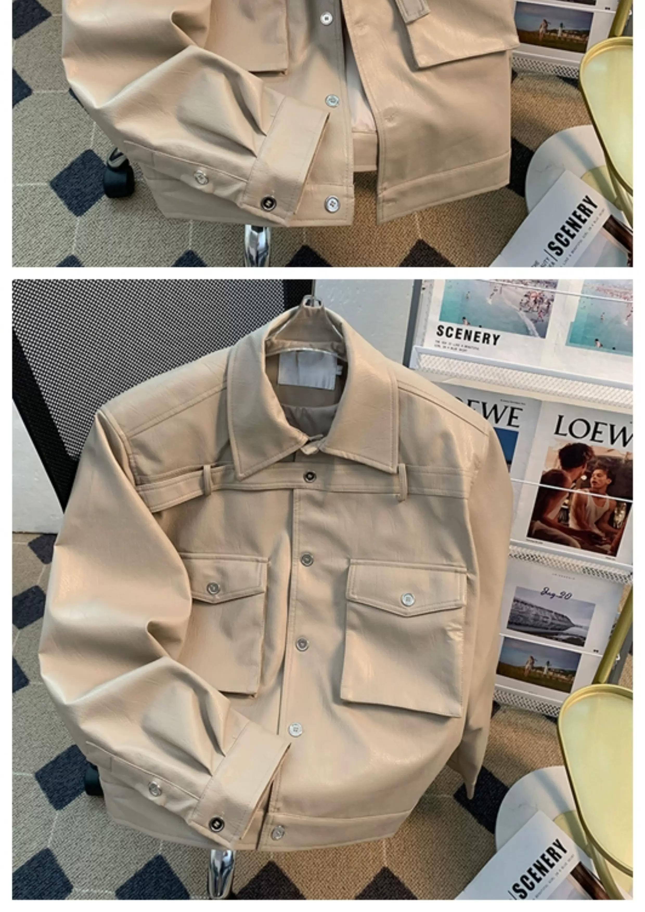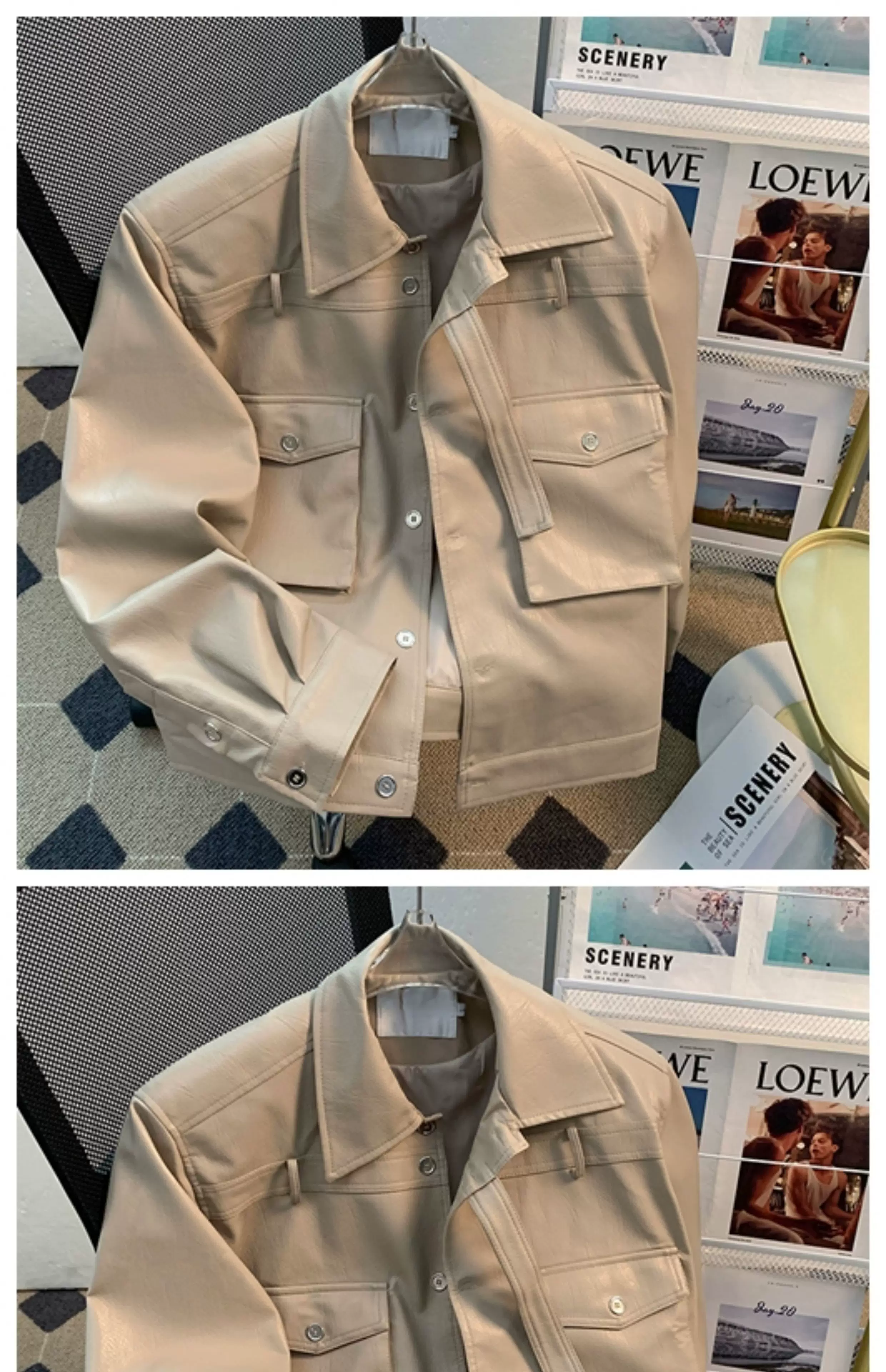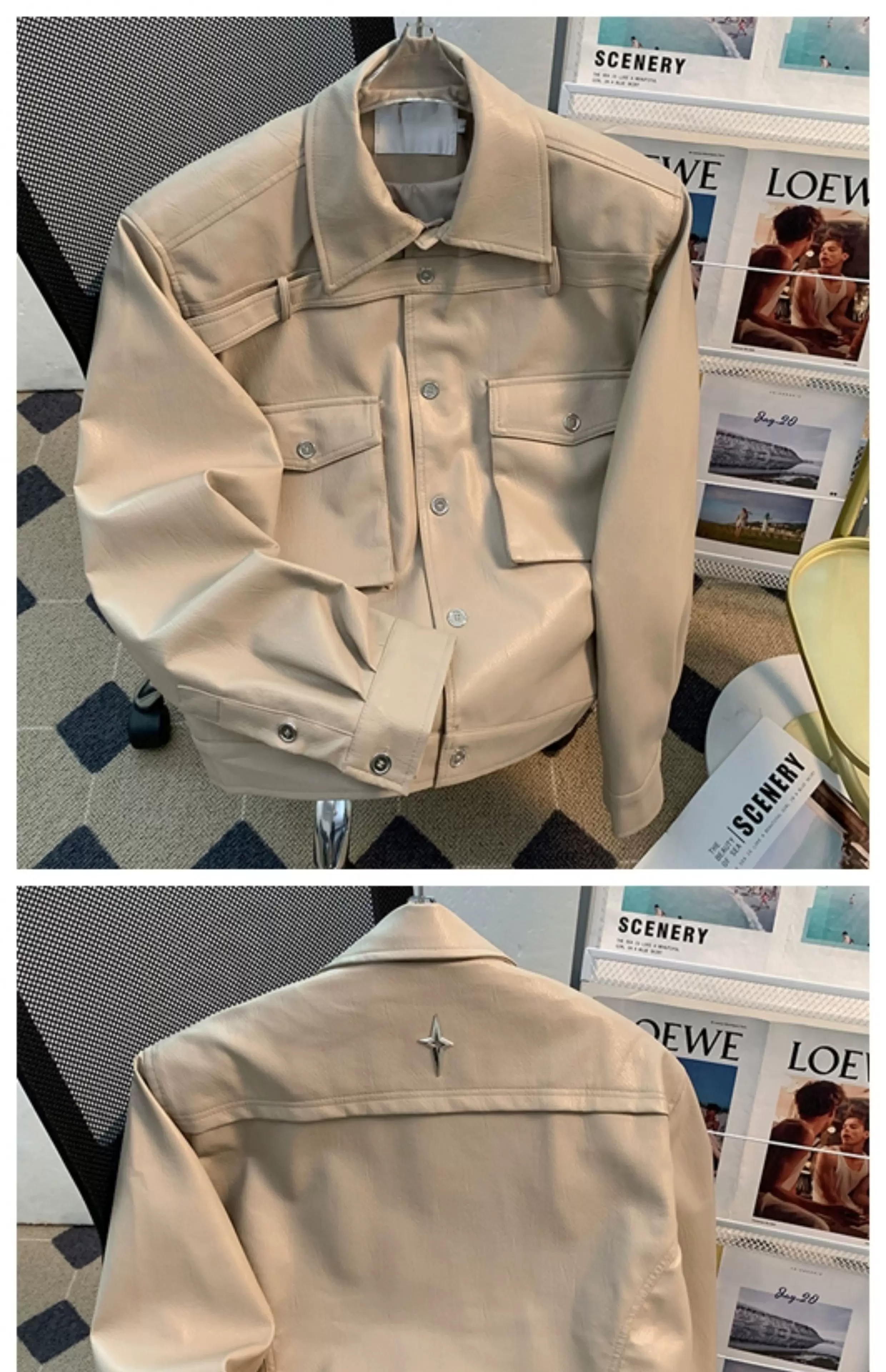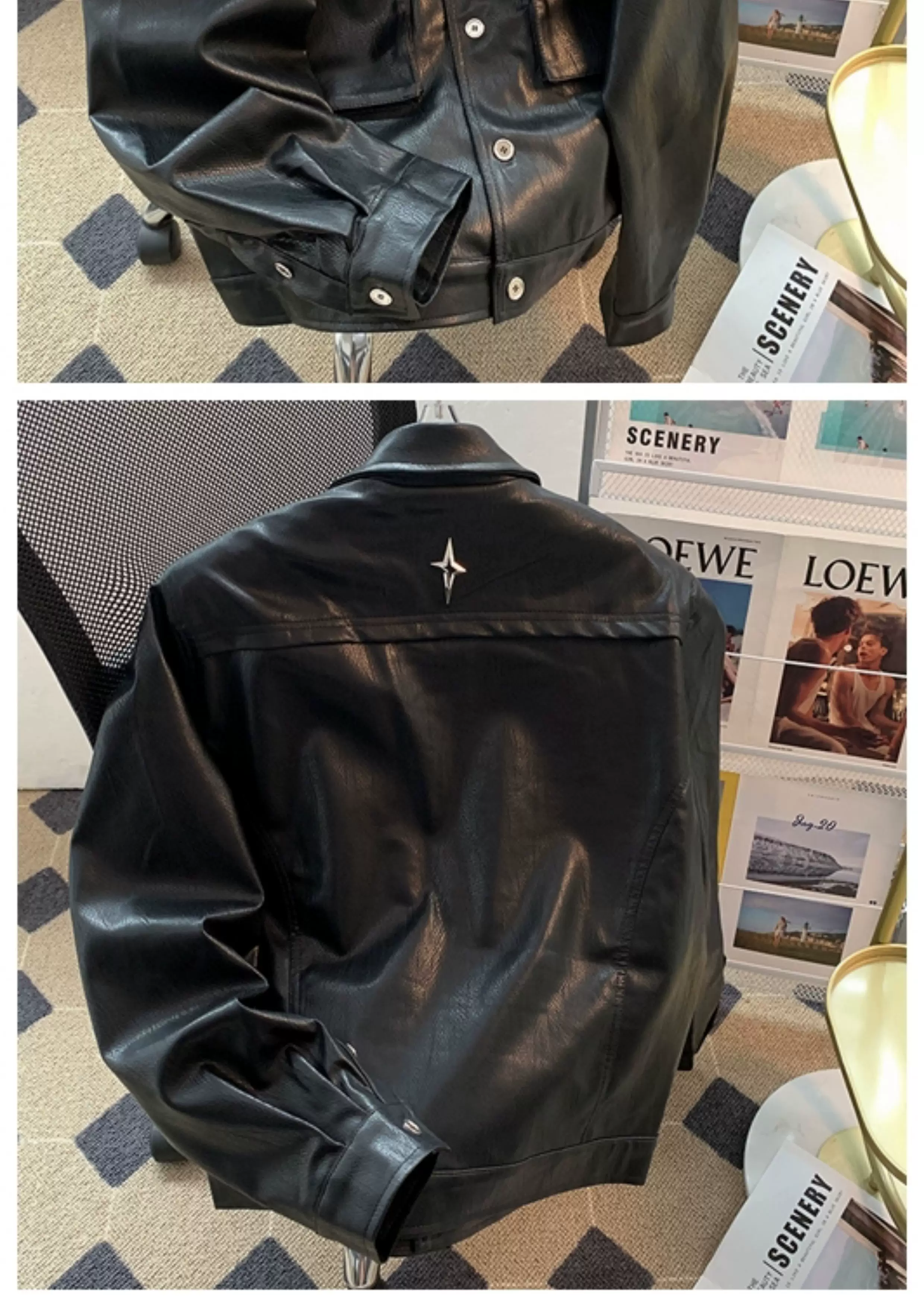 - Áo khoác da thiết kế phá cách dành cho nam, phong cách Mỹ thời thượng mùa xuân thu, áo khoác da PU cá tính, dáng rộng, cổ lật, kiểu áo khoác biker.