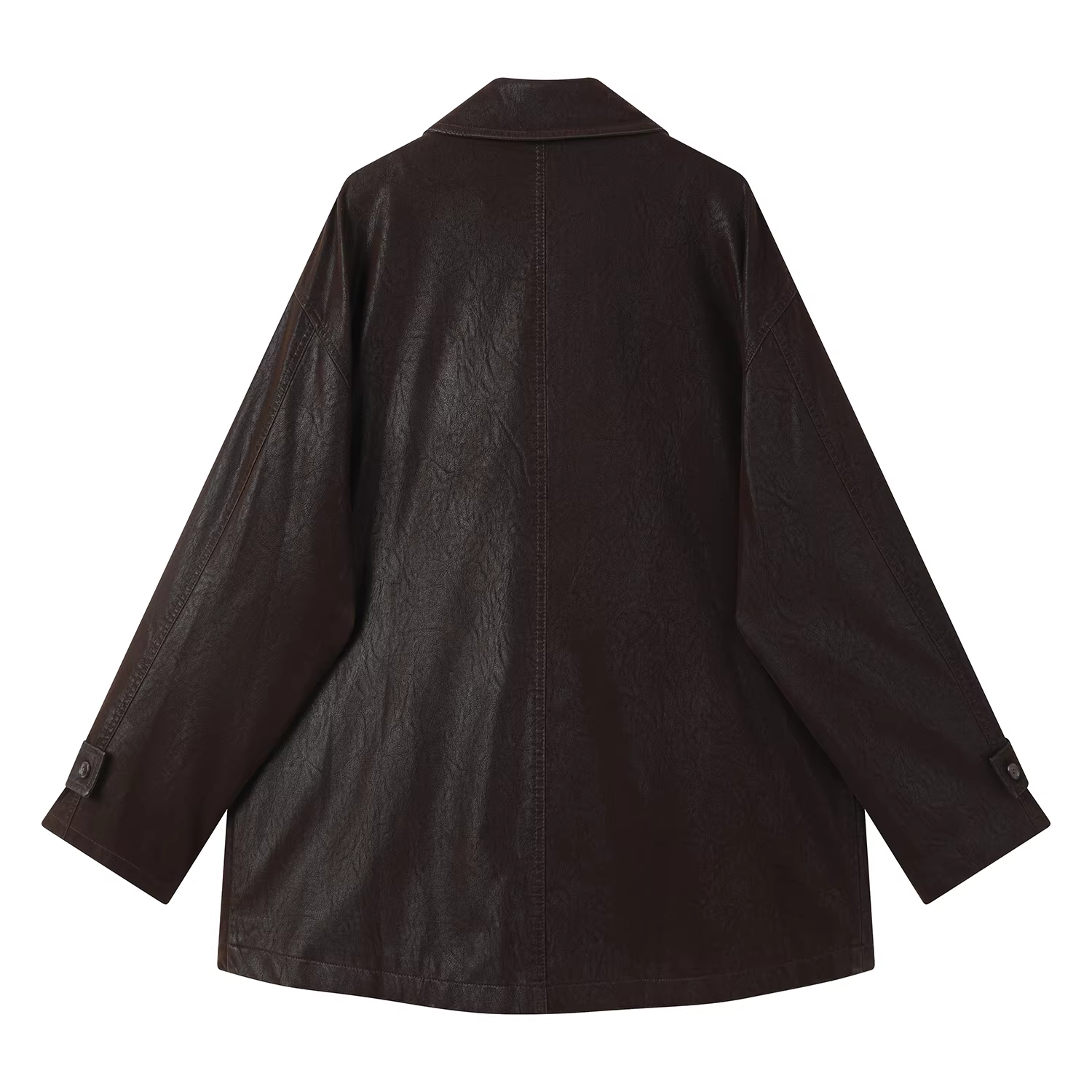 - Áo khoác da xe máy màu cà phê Melard cổ điển, phong cách và sang trọng dành cho nữ, áo khoác da dài trung bình cho mùa thu.
