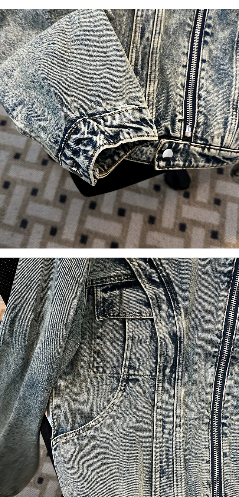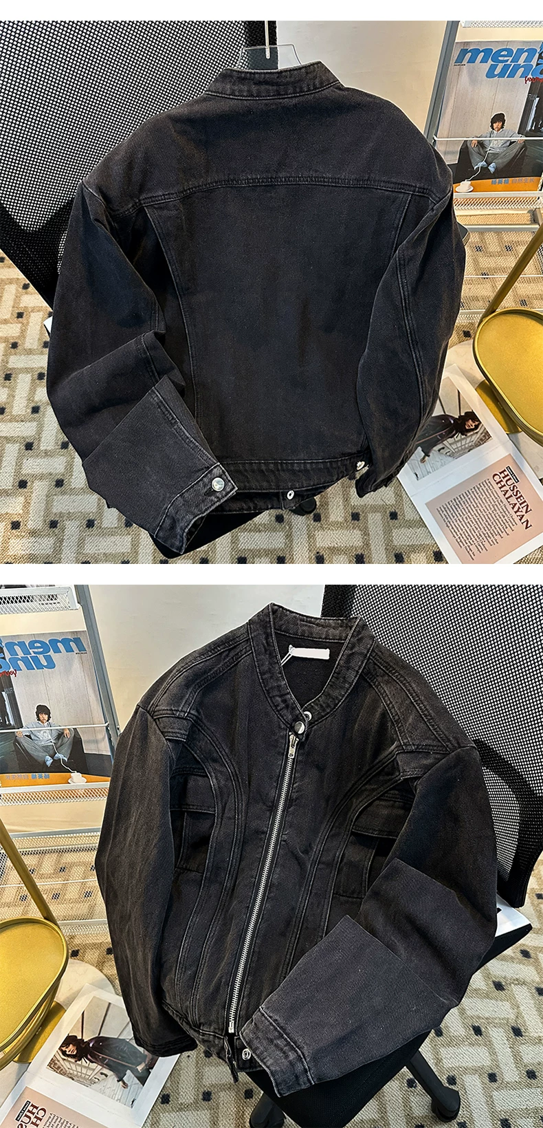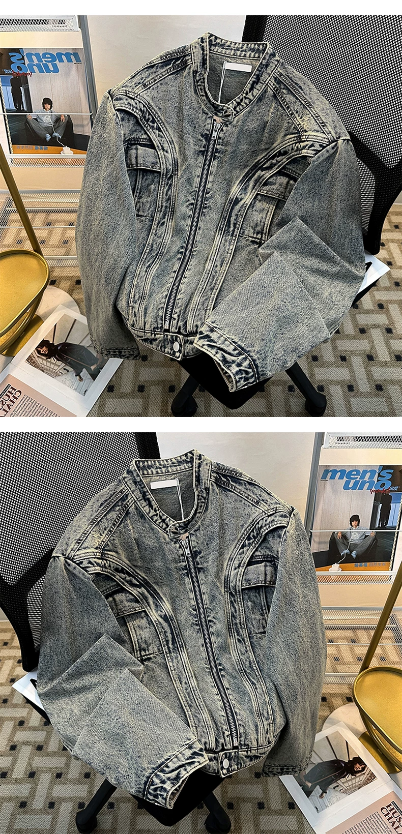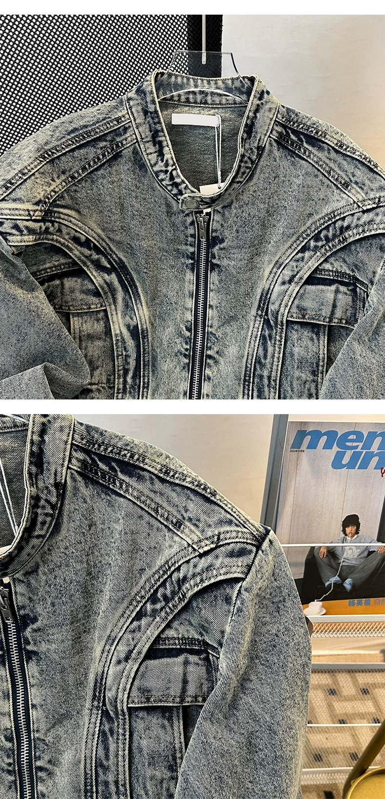 - Áo khoác denim cao cấp dành cho nam, kiểu dáng ngắn rộng, cổ đứng, phong cách Mỹ thời thượng mùa xuân, chất liệu denim vintage đã qua xử lý.
