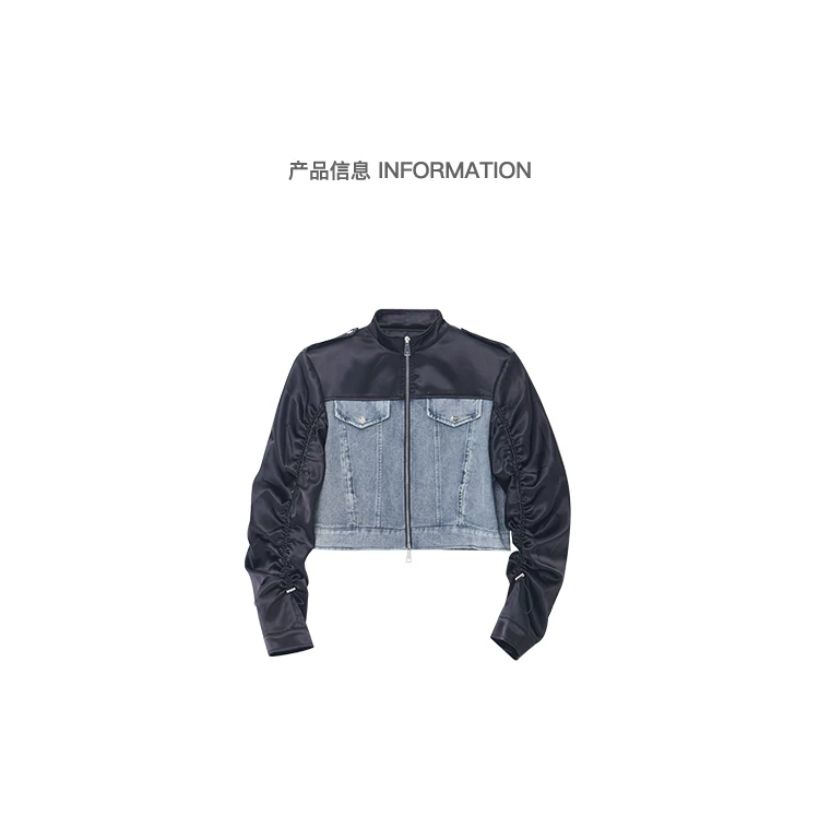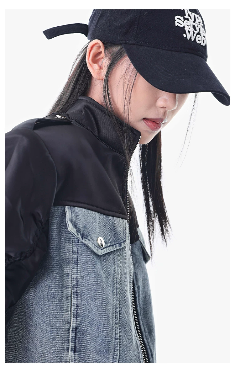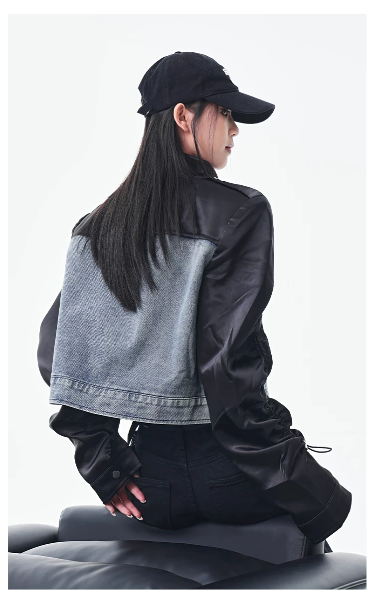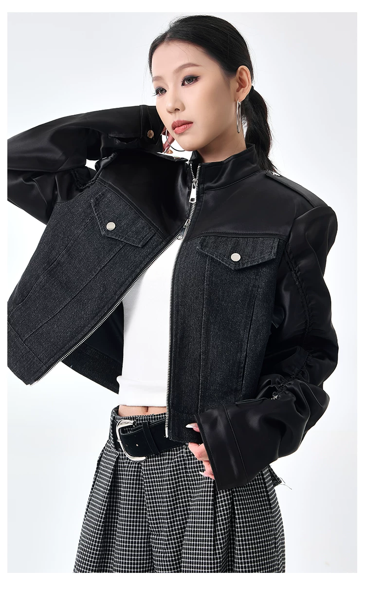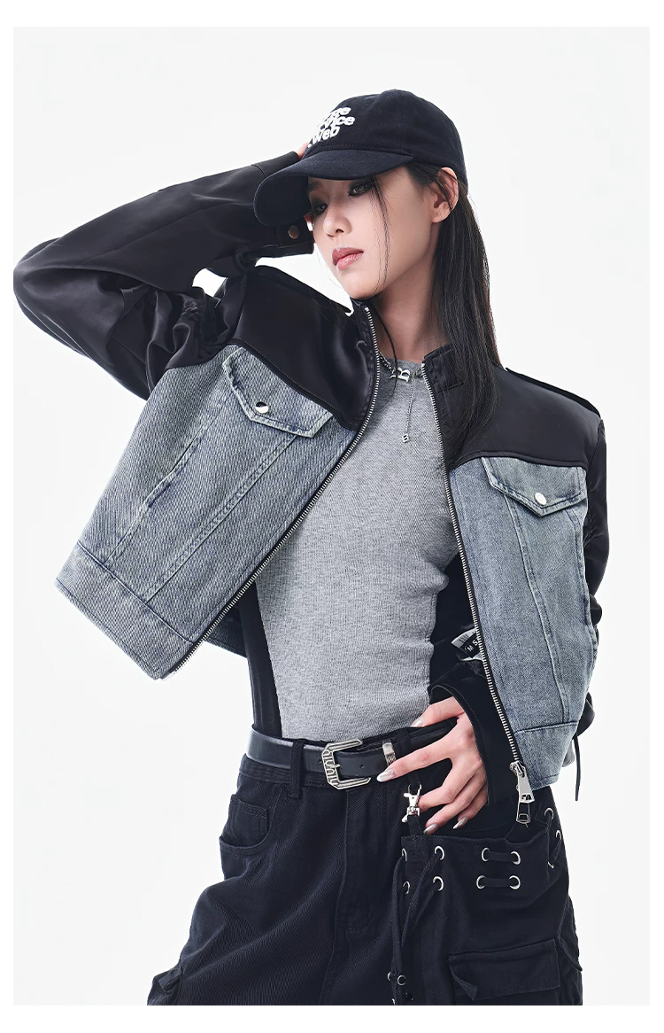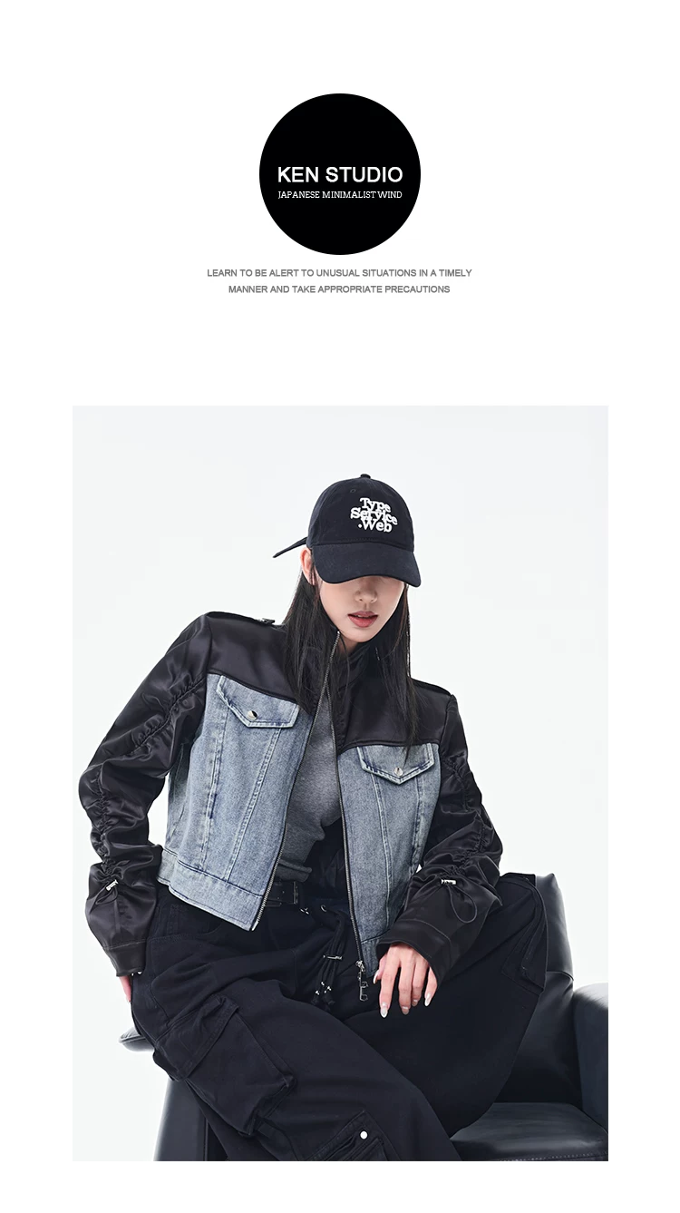 Áo khoác denim chắp vá mùa thu đông mới của KEN STUDIO dành cho nữ, áo khoác ngắn ôm dáng thời trang