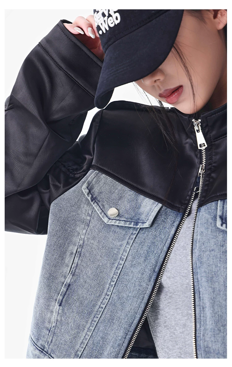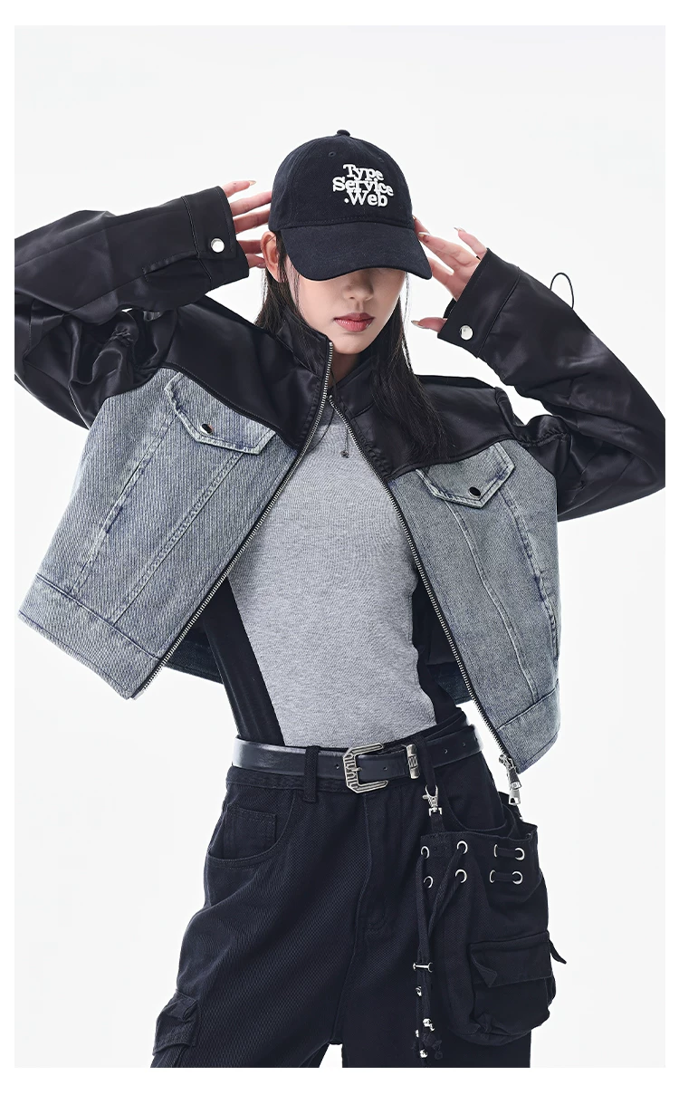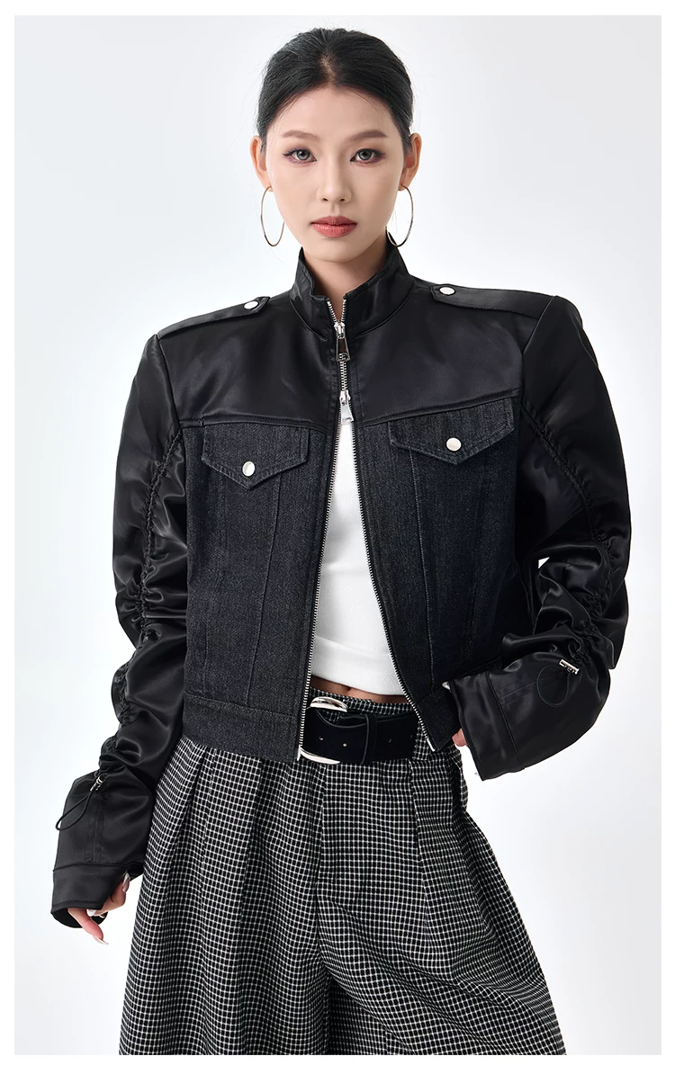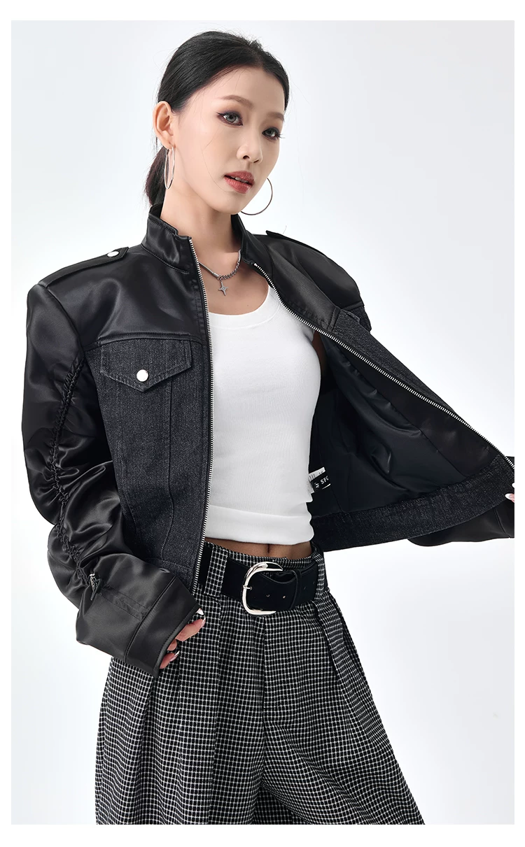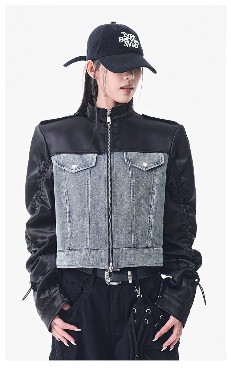 Áo khoác denim chắp vá mùa thu đông mới của KEN STUDIO dành cho nữ, áo khoác ngắn ôm dáng thời trang
