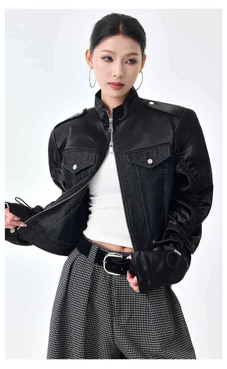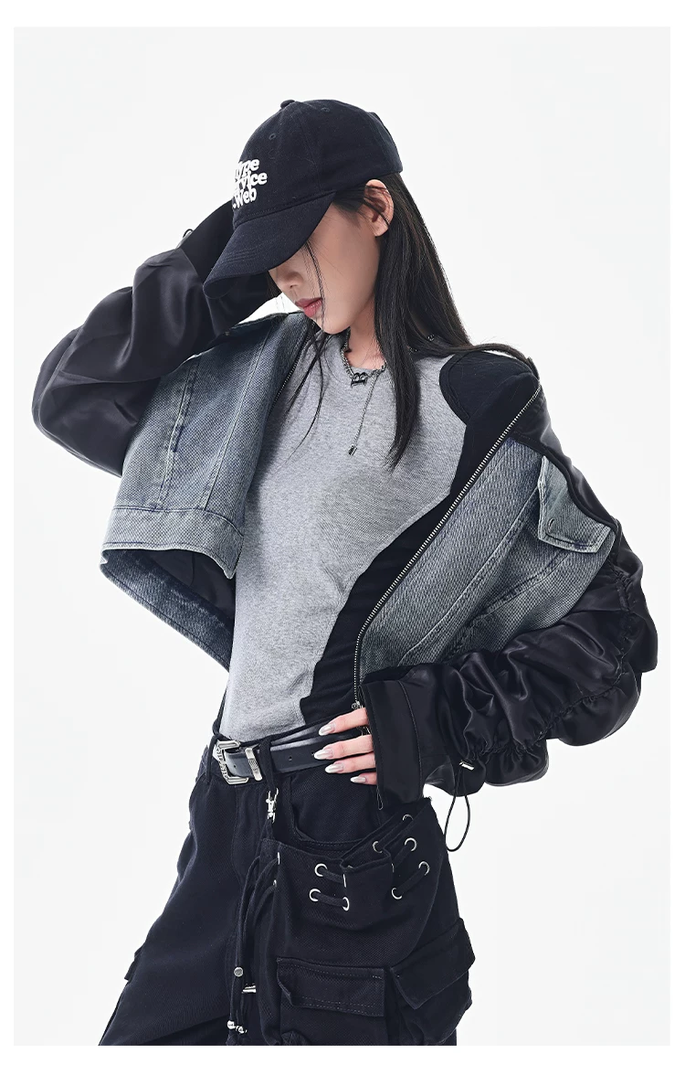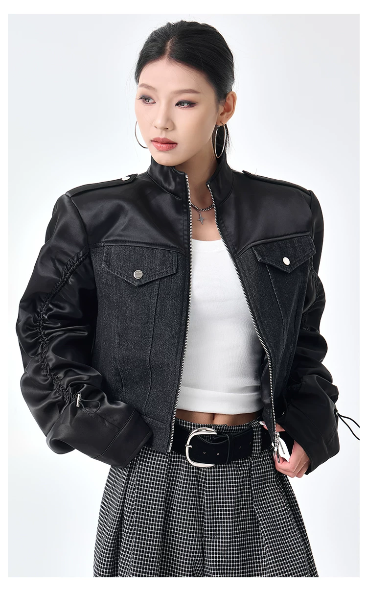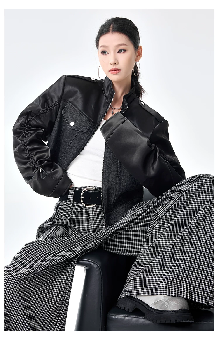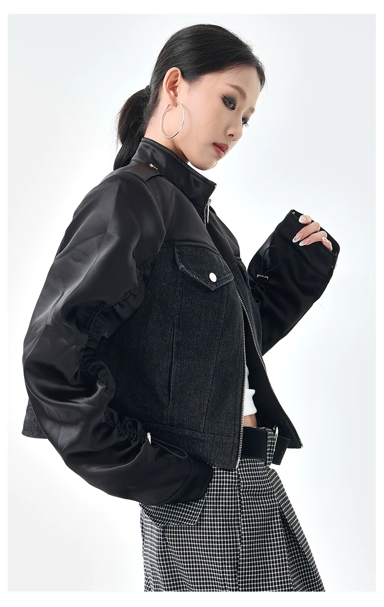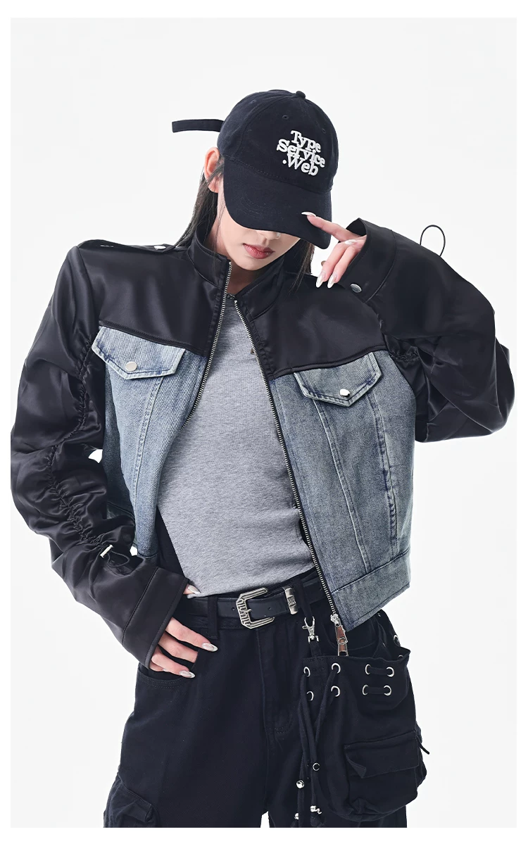 Áo khoác denim chắp vá mùa thu đông mới của KEN STUDIO dành cho nữ, áo khoác ngắn ôm dáng thời trang