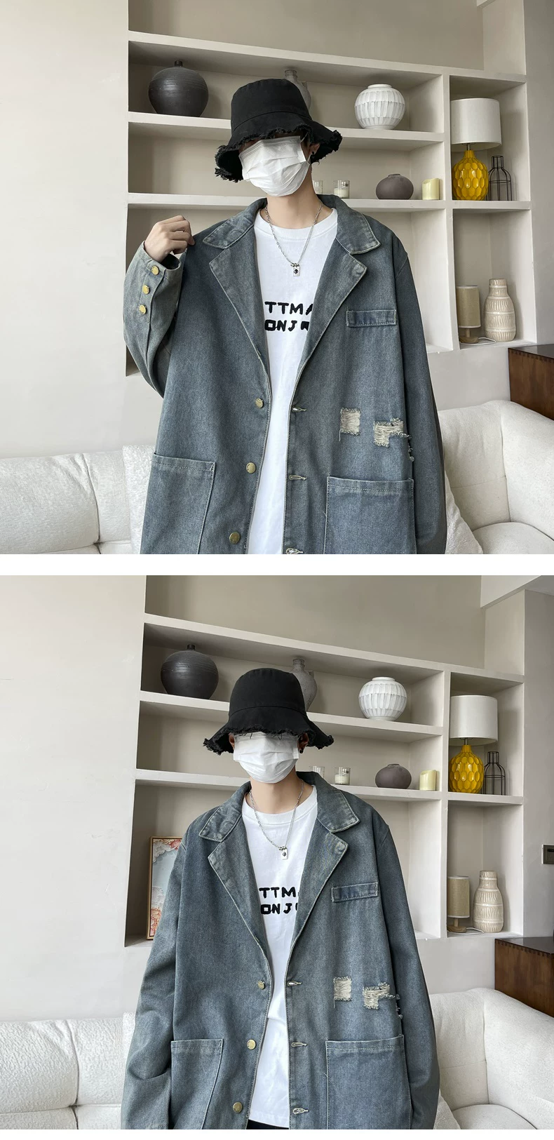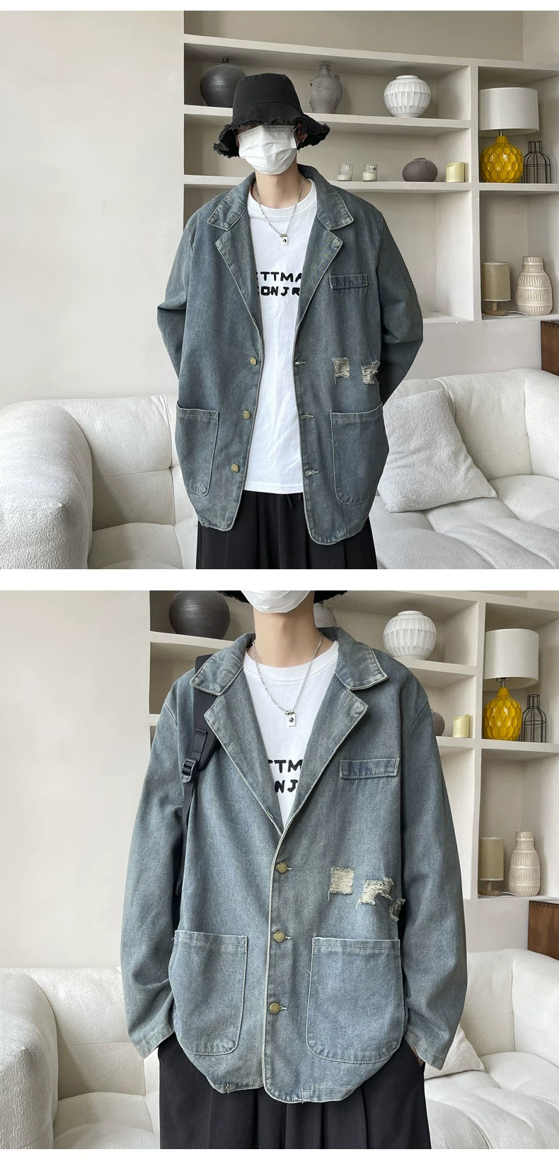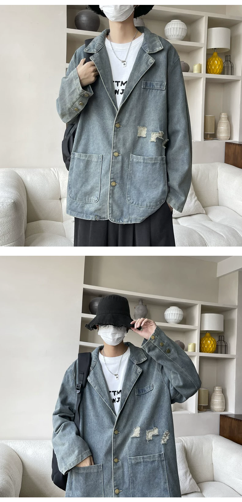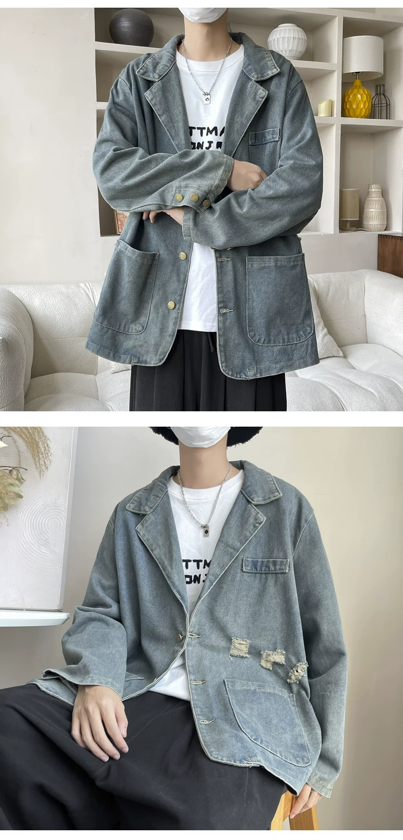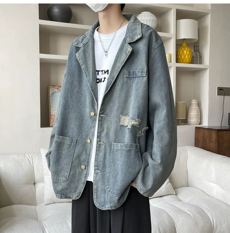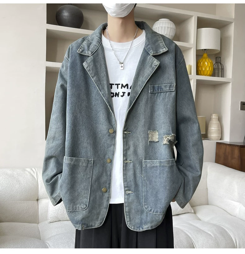 - Áo khoác denim cổ áo kiểu suit, áo khoác thời trang xuân thu, áo khoác nam rộng rãi phong cách Mỹ cổ điển.
