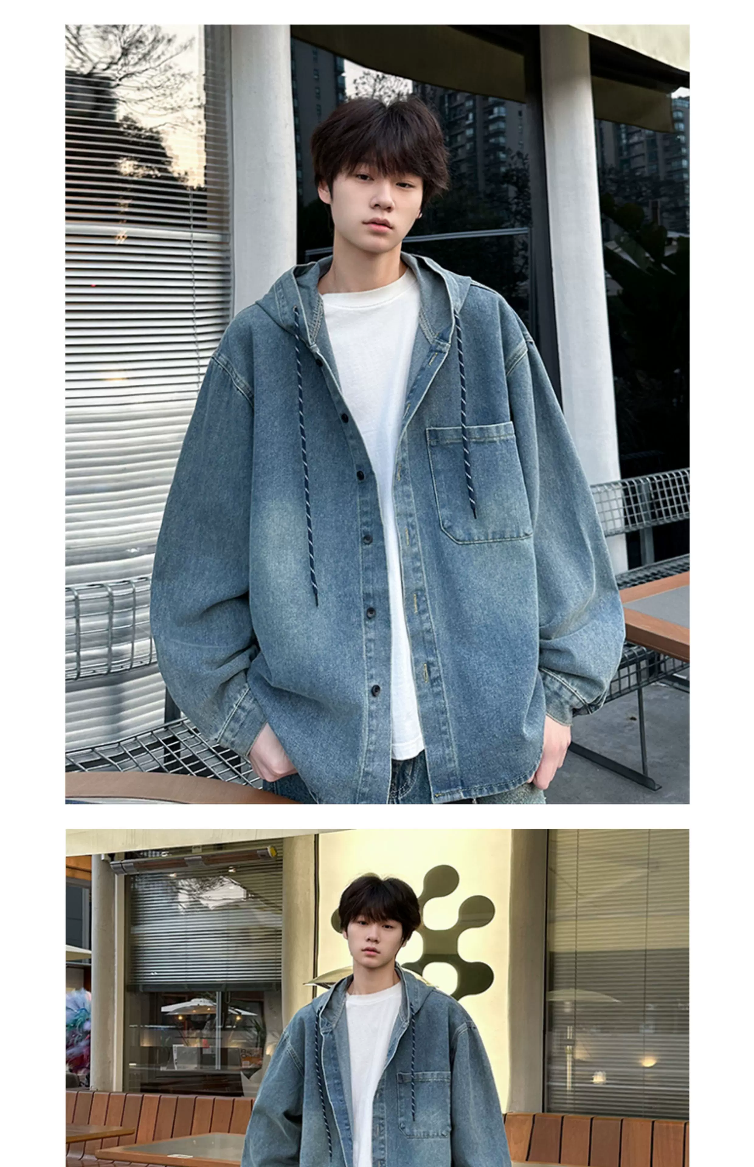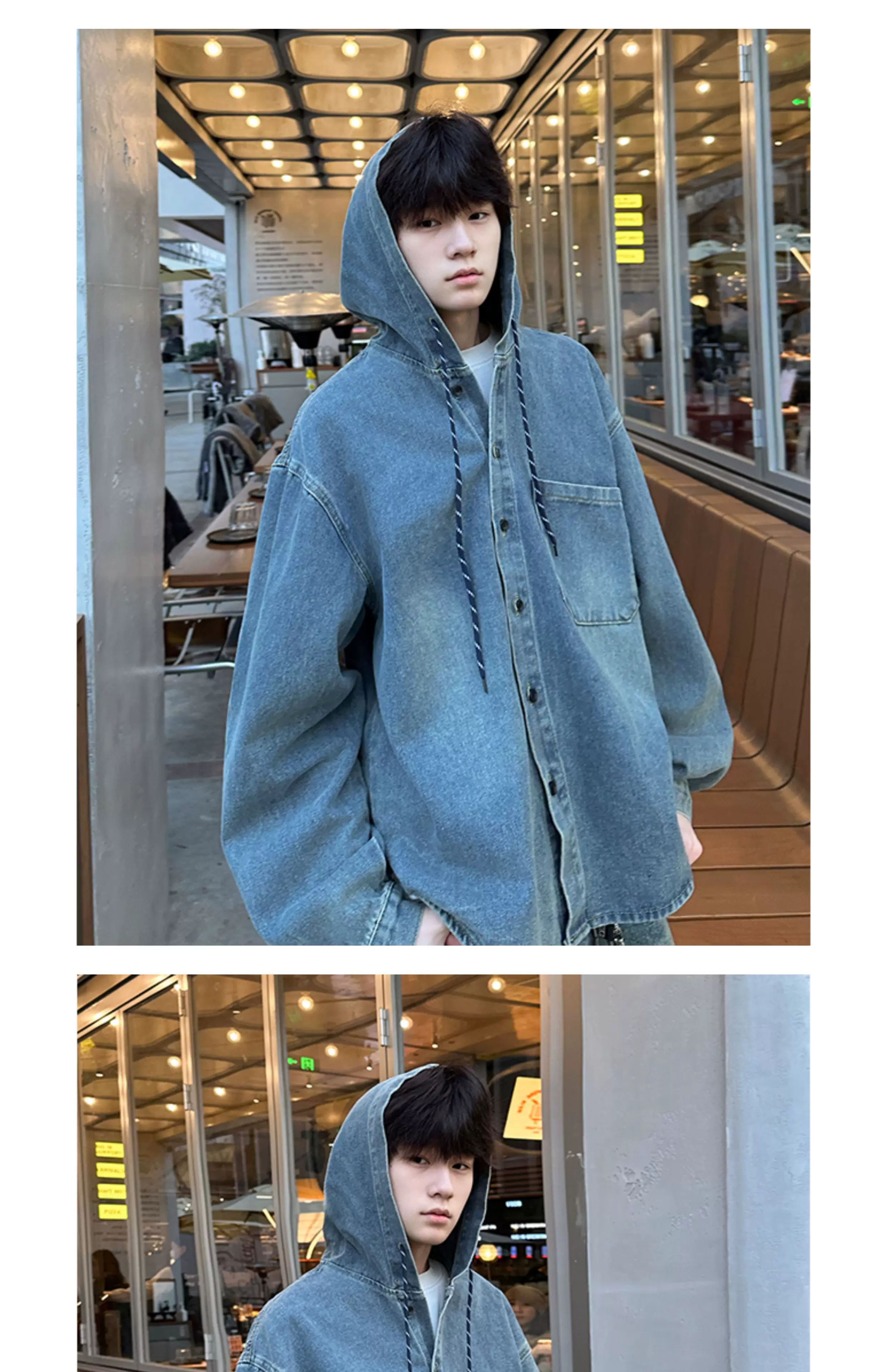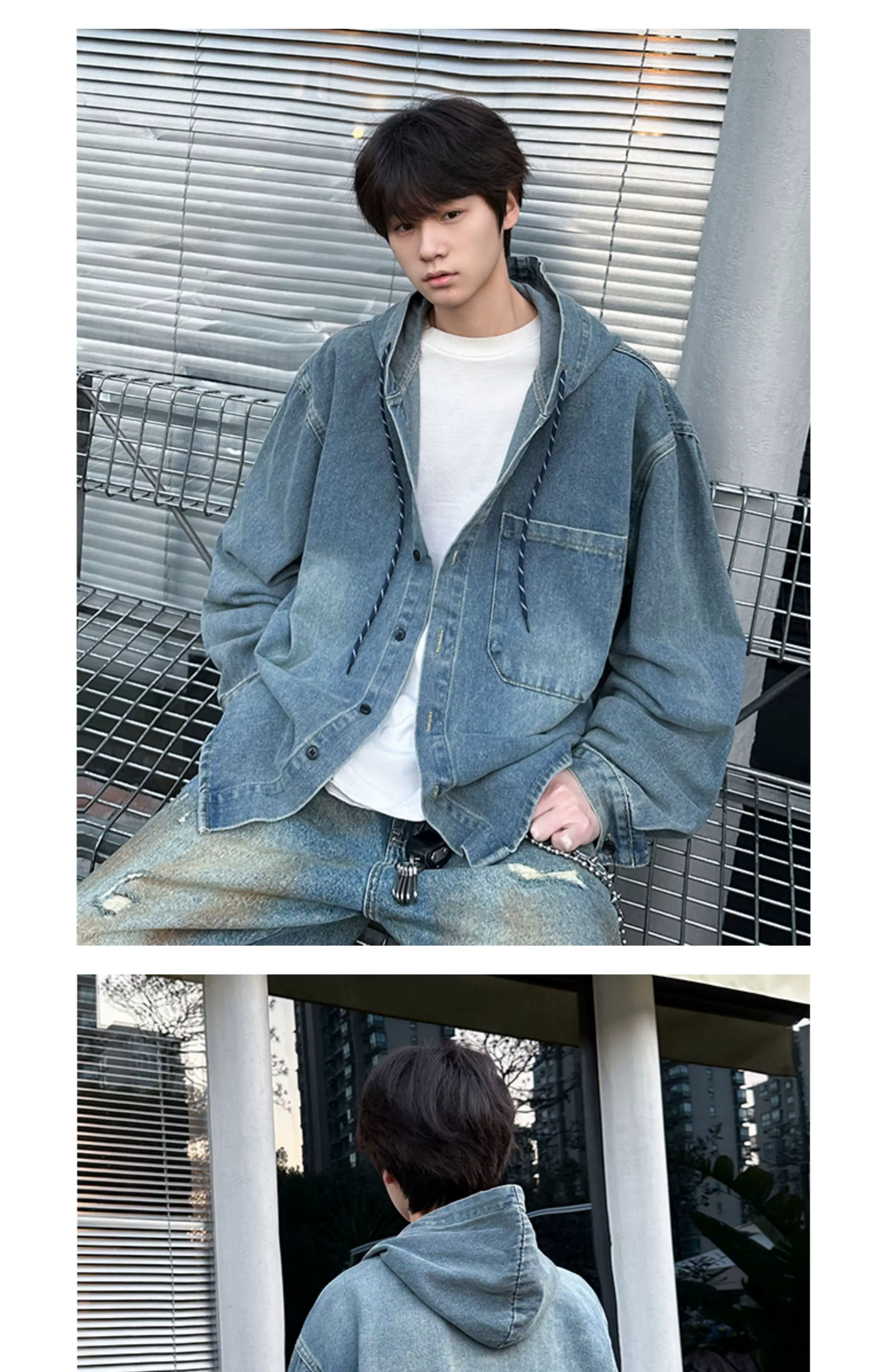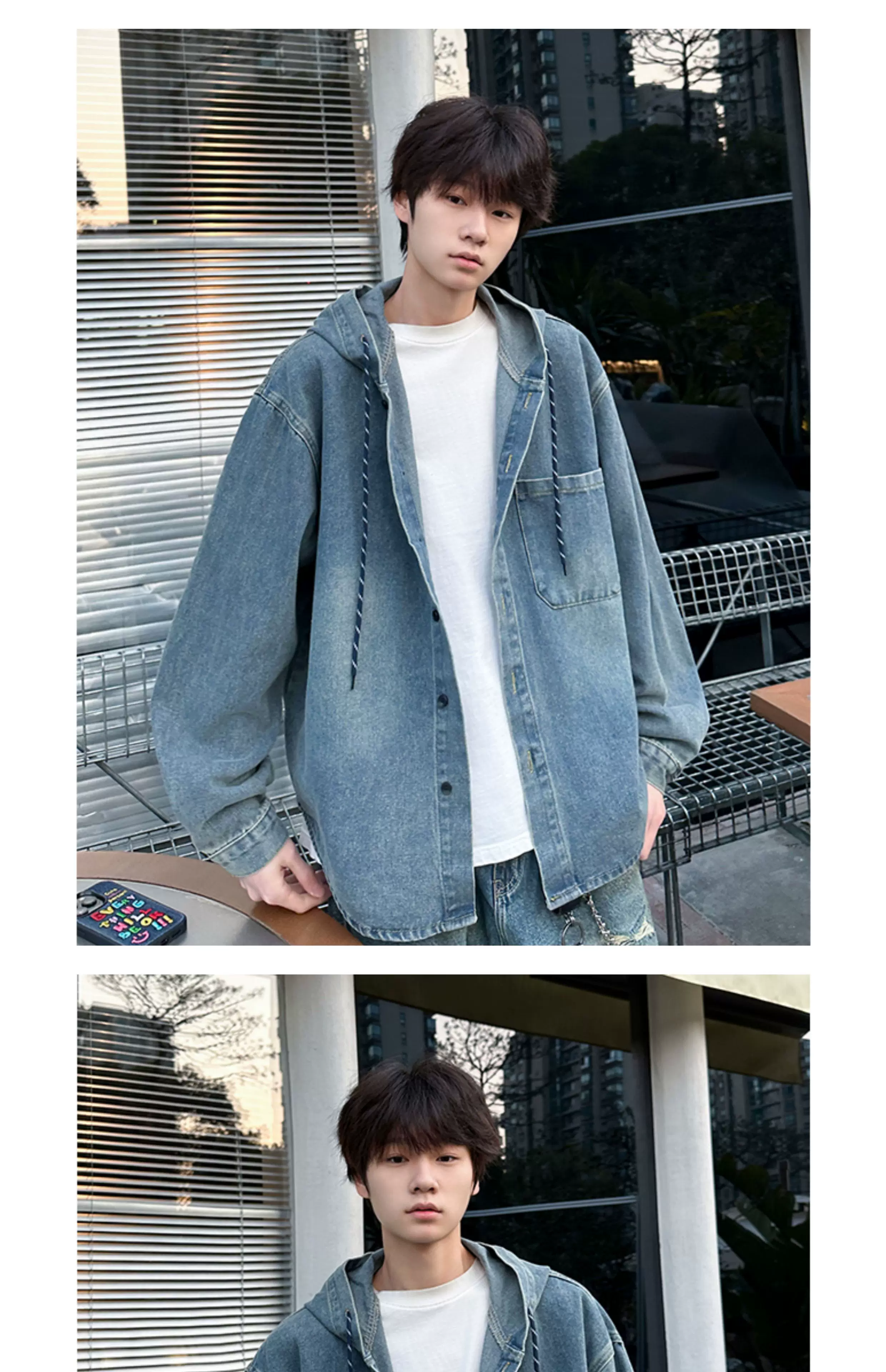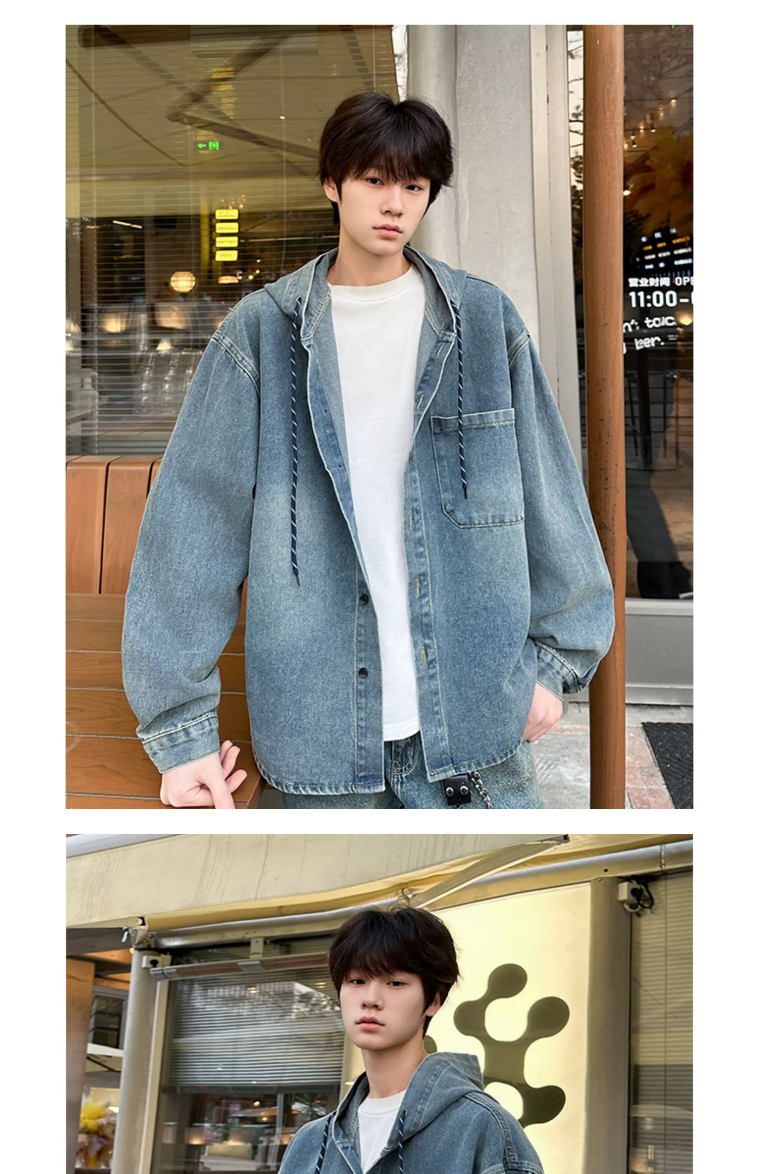 - Áo khoác denim cổ điển mùa xuân thu dành cho nam, áo khoác có mũ rộng rãi, áo khoác thường ngày phong cách retro Mỹ thời thượng.