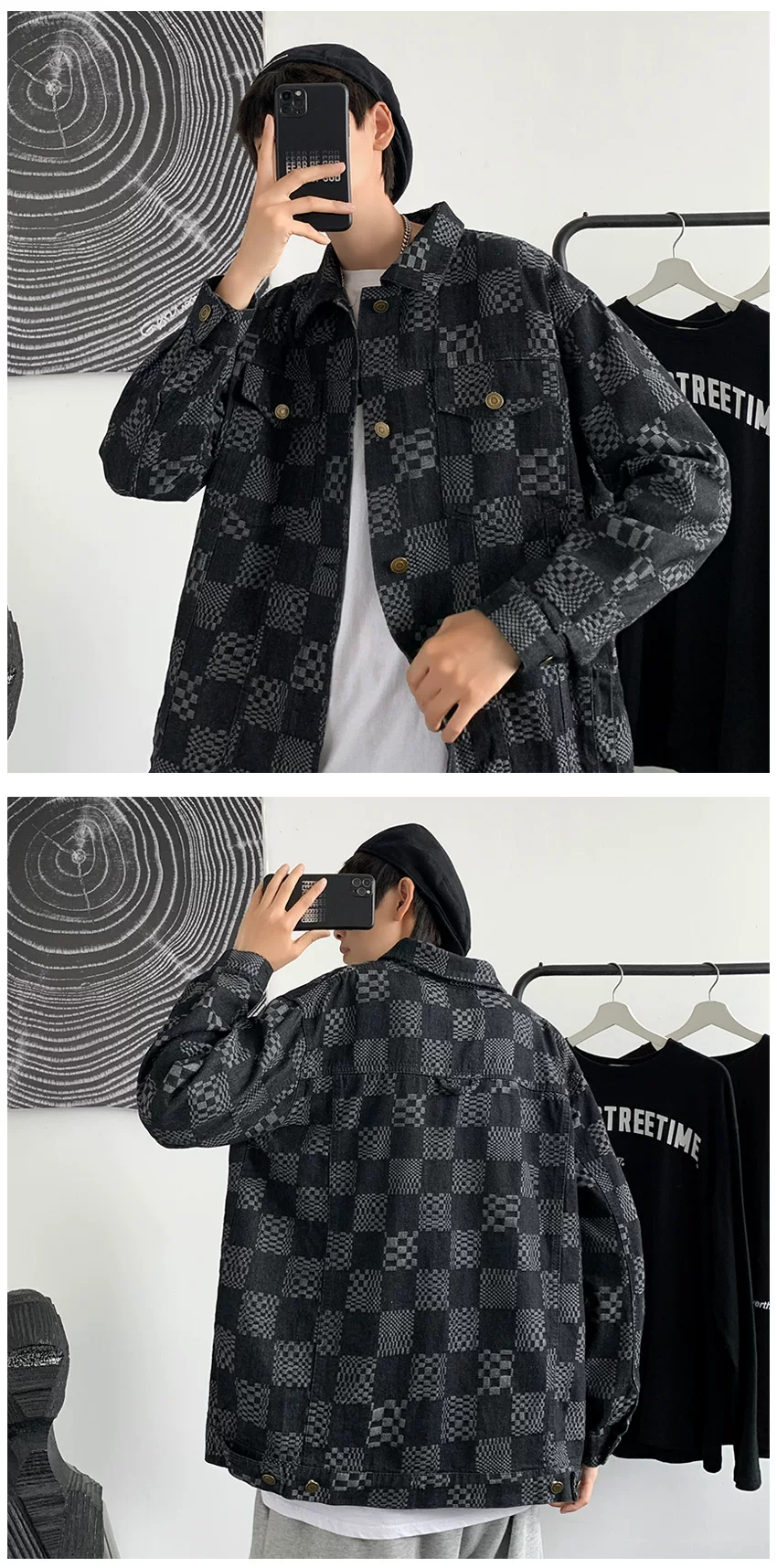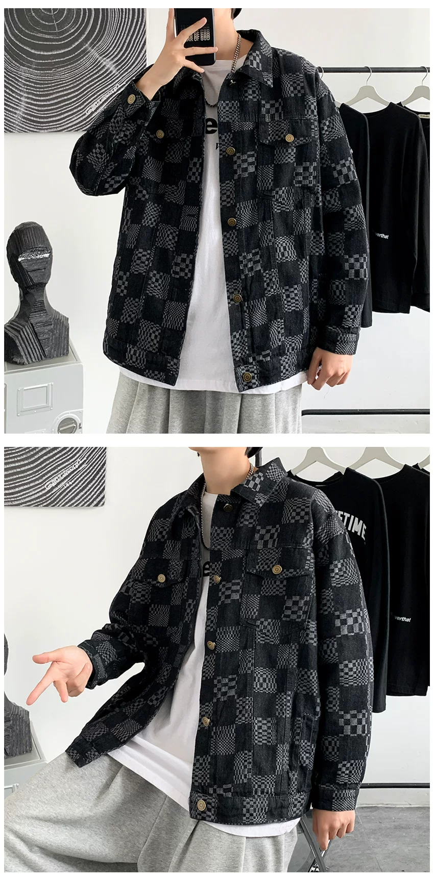 - Áo khoác denim kẻ caro cao cấp dành cho nam, áo khoác workwear dáng rộng thời trang xuân thu, phong cách Hồng Kông cá tính.