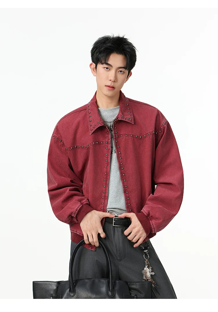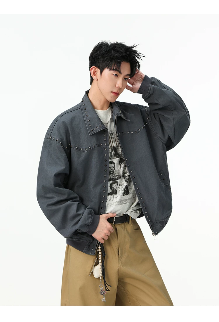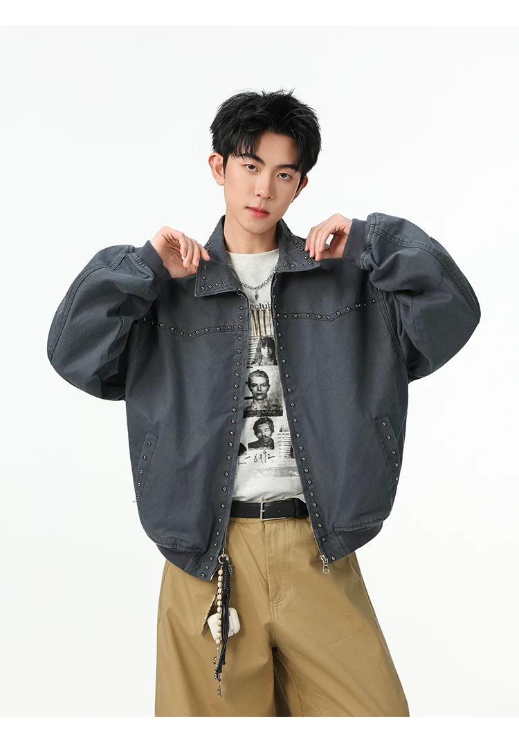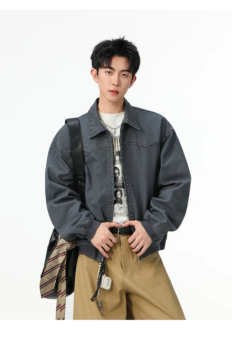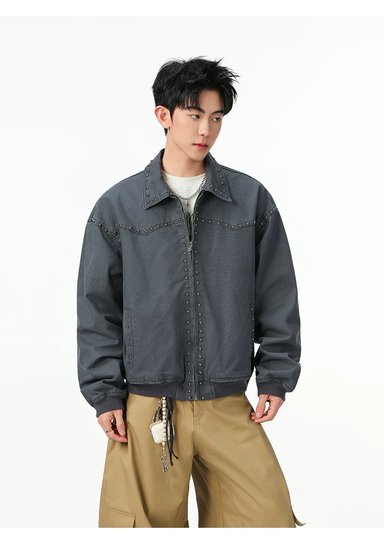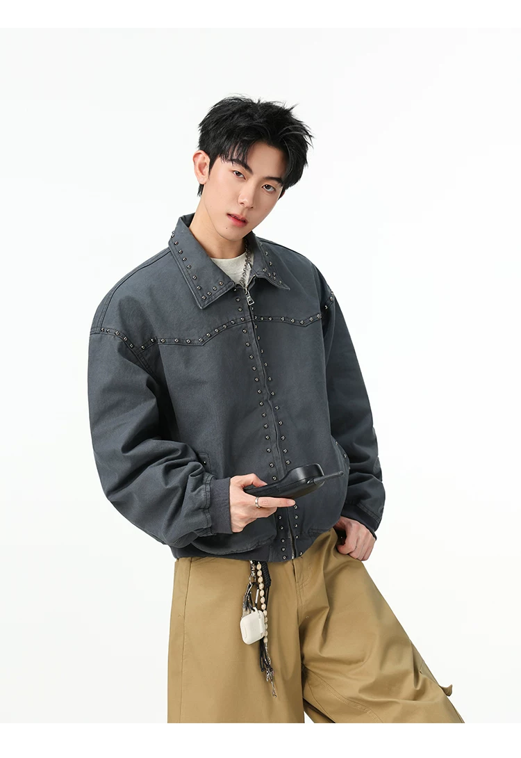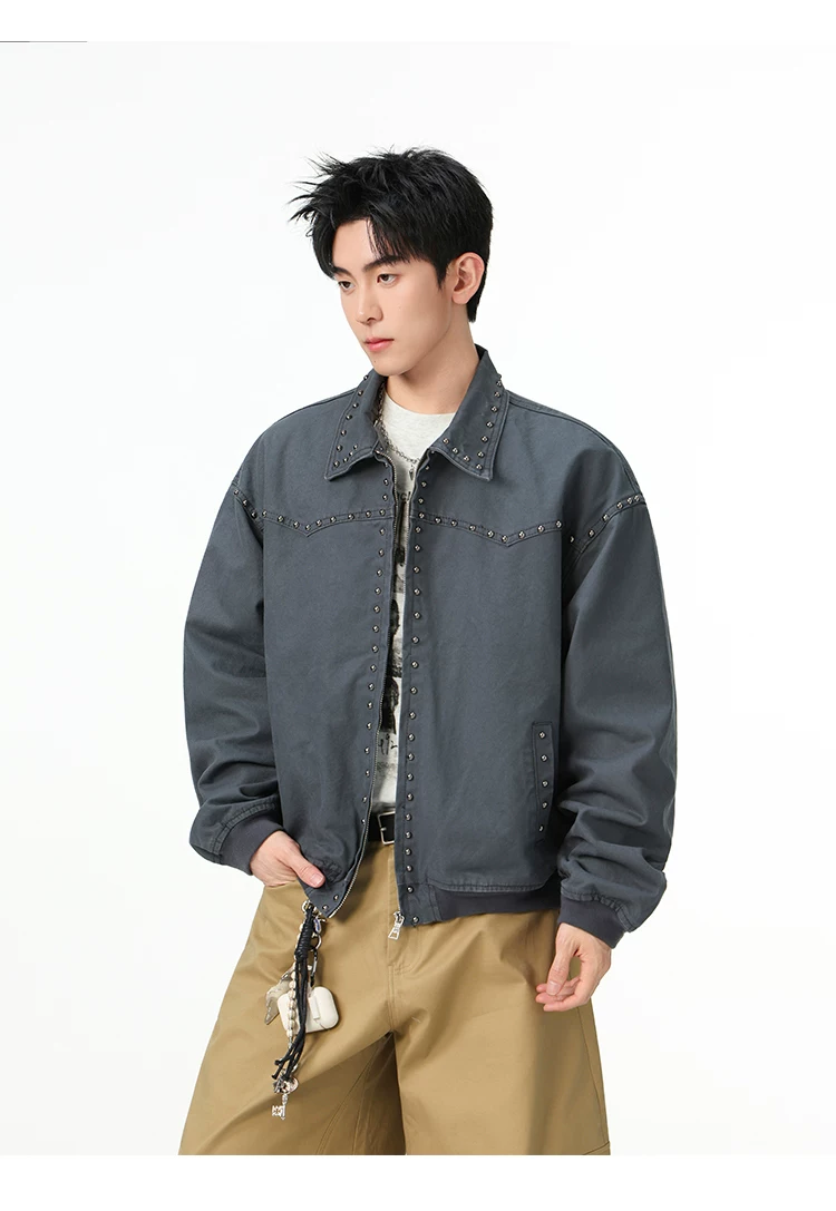 Áo khoác denim kiểu Mỹ dành cho nam, mùa xuân thu, áo khoác ngắn có khóa kéo, kiểu dáng thời trang với thiết kế đinh tán.