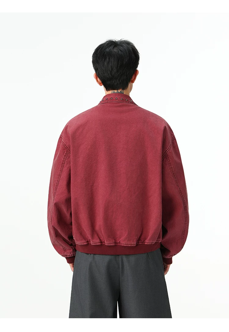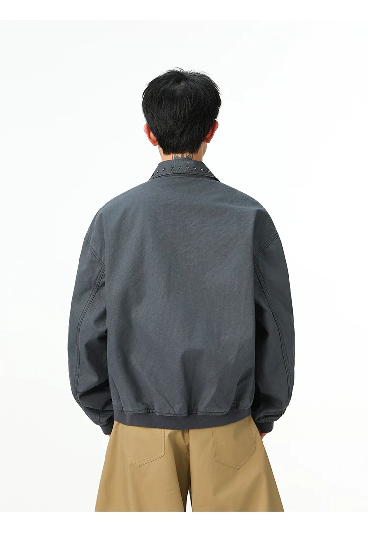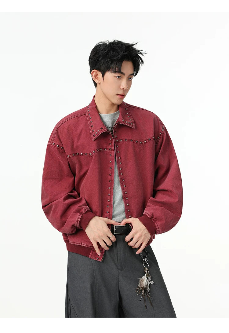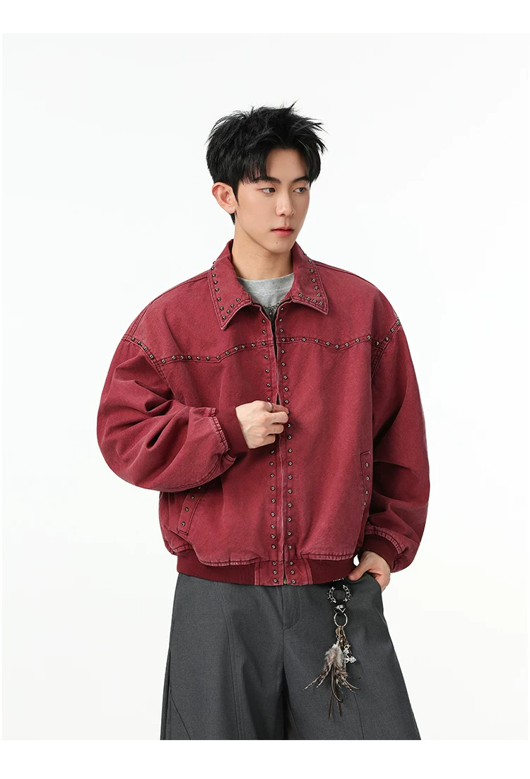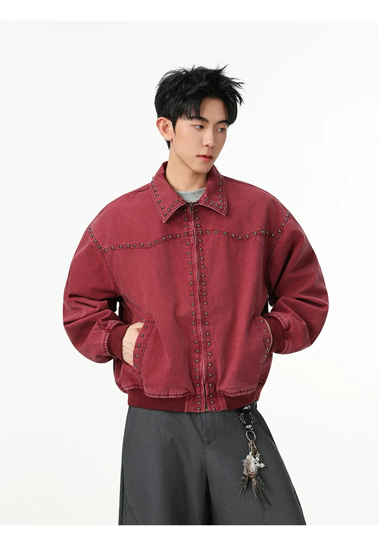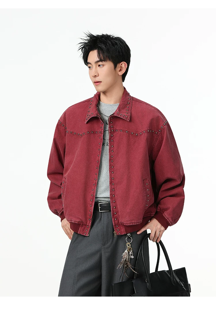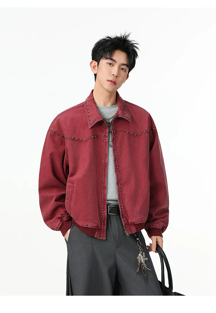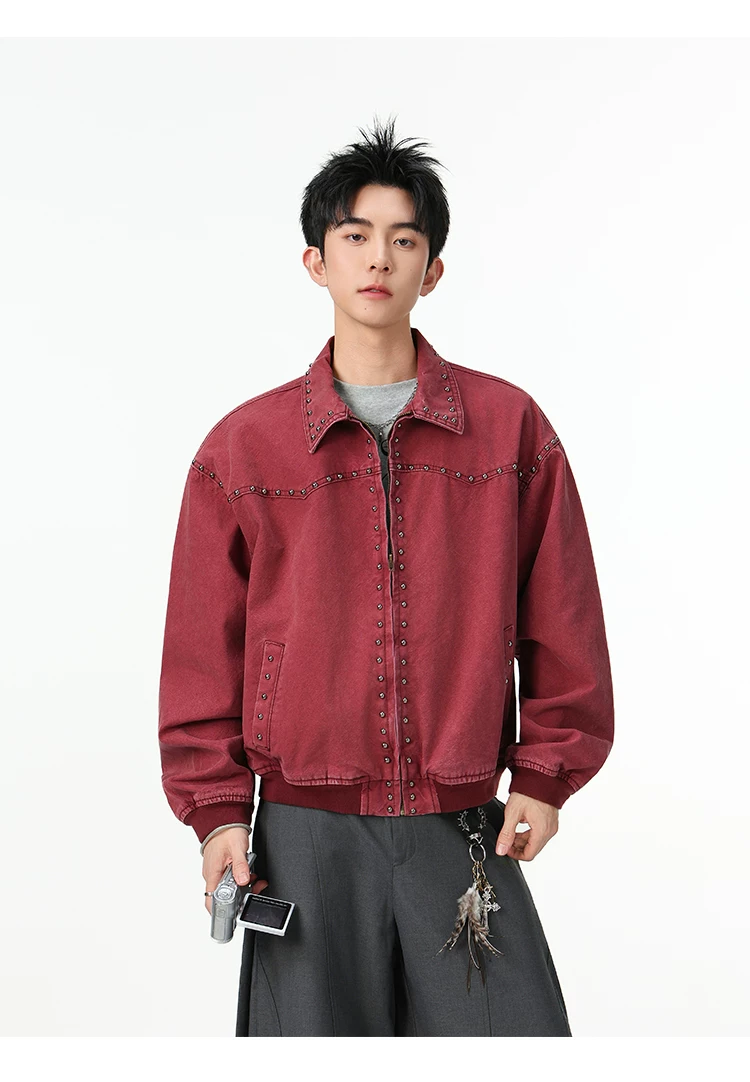 Áo khoác denim kiểu Mỹ dành cho nam, mùa xuân thu, áo khoác ngắn có khóa kéo, kiểu dáng thời trang với thiết kế đinh tán.