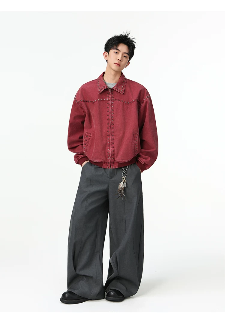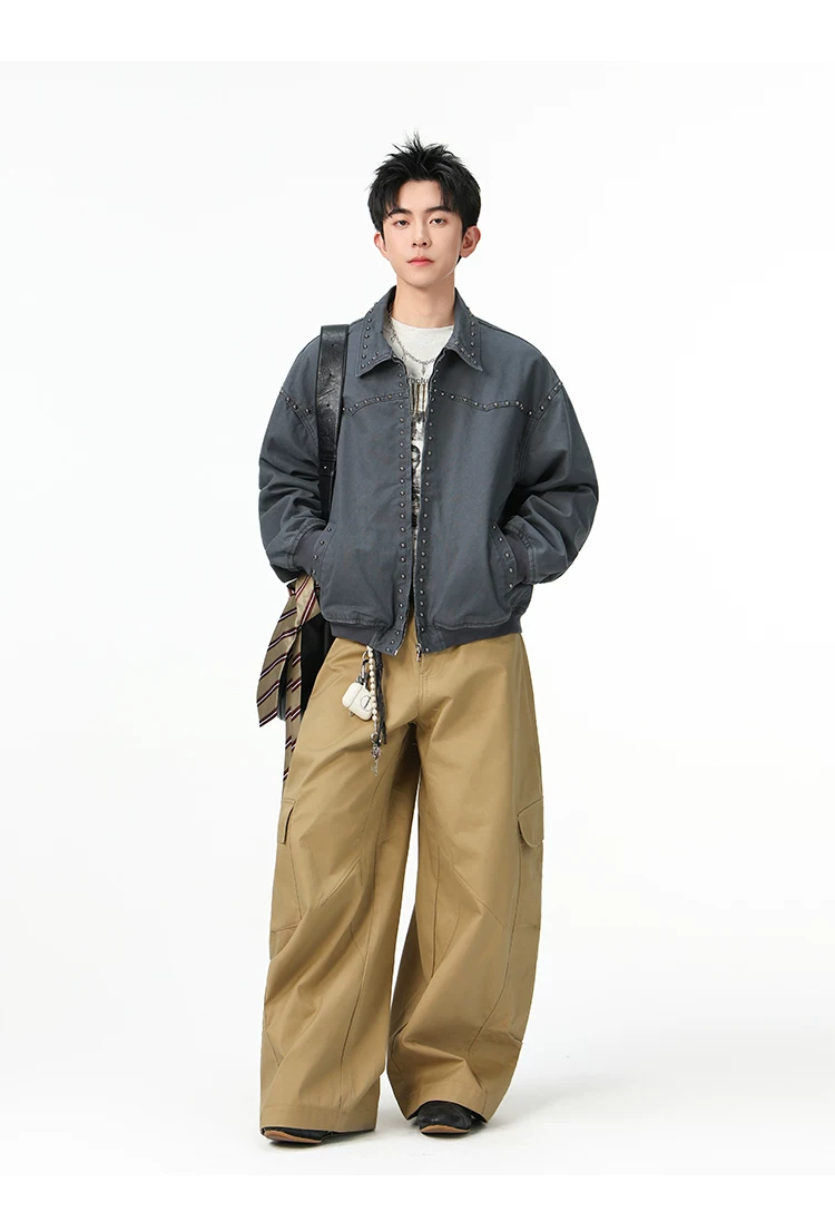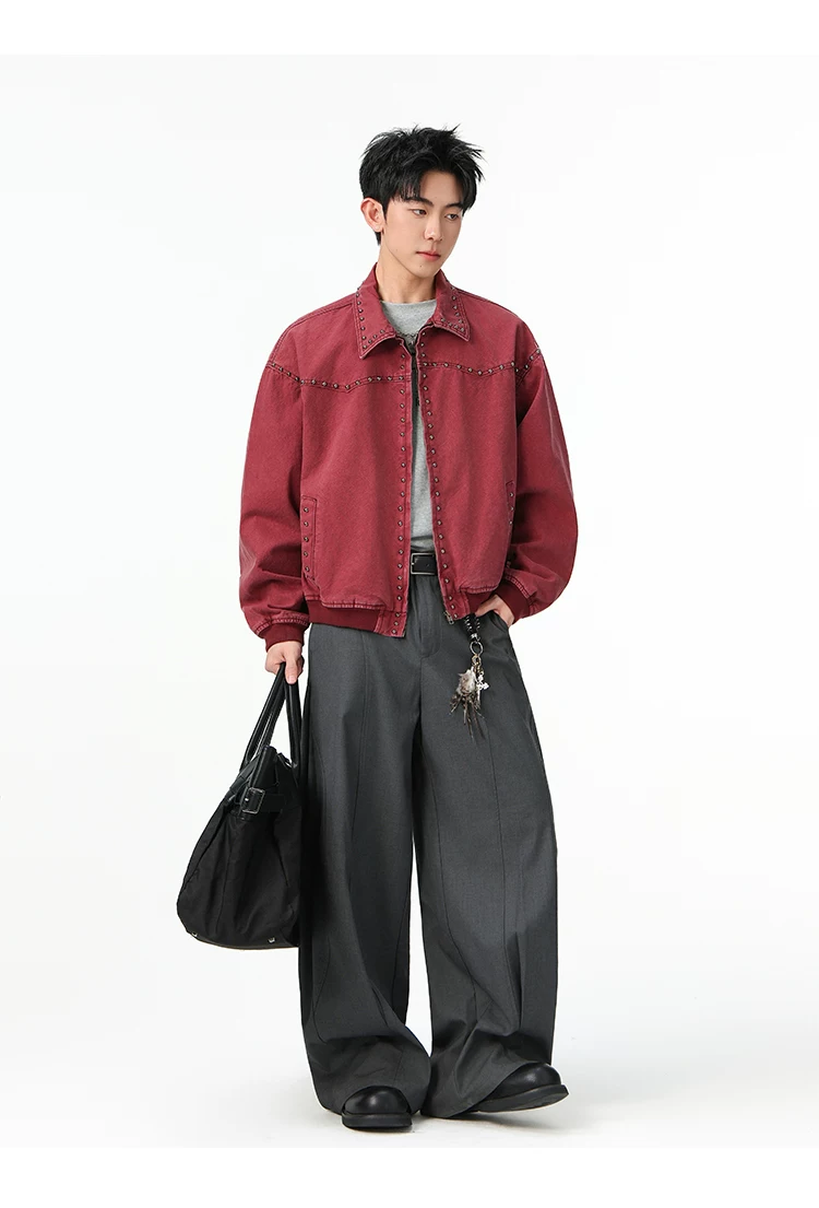 - Áo khoác denim kiểu Mỹ dành cho nam, mùa xuân thu, áo khoác ngắn có khóa kéo, kiểu dáng thời trang với thiết kế đinh tán.