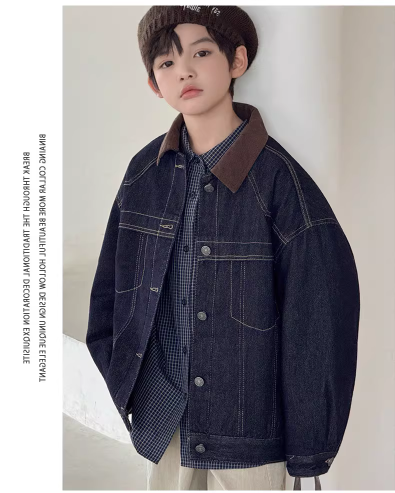 - Áo khoác denim may chần cổ trụ thời trang Thu/Đông 2025 dành cho bé trai và bé gái, áo khoác ngoài hợp xu hướng cho trẻ lớn