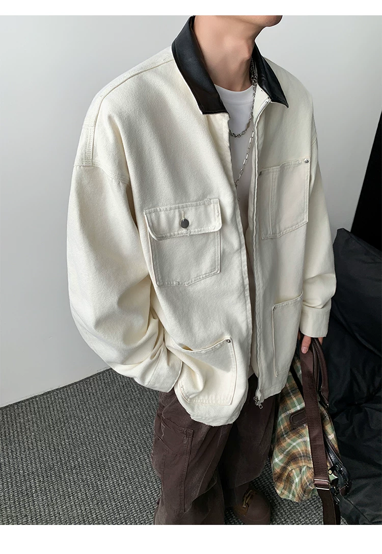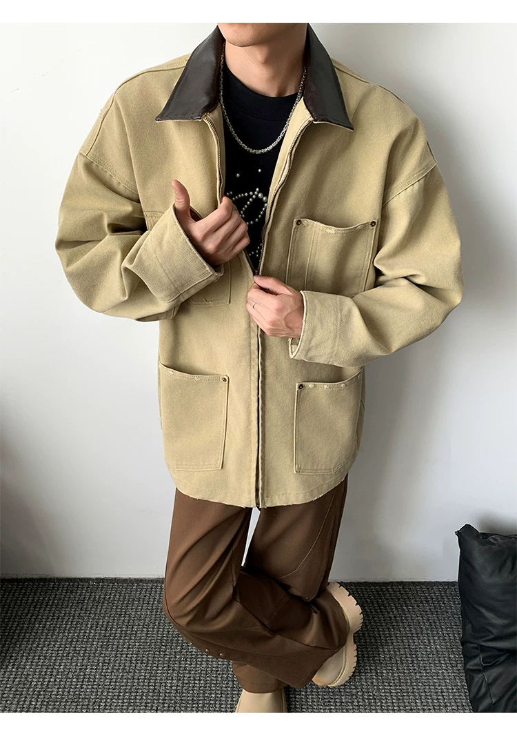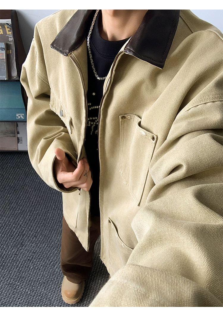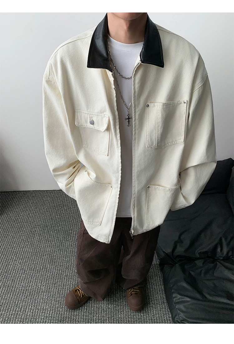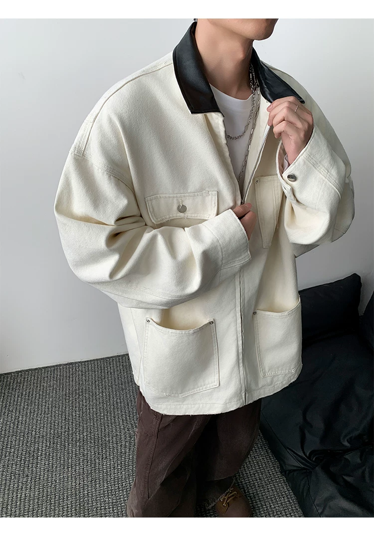 - Áo khoác denim nam phong cách retro Mỹ, chất liệu da PU, kiểu dáng rộng rãi, thời trang thu đông, kiểu áo khoác công nhân, áo ngắn kiểu barn.