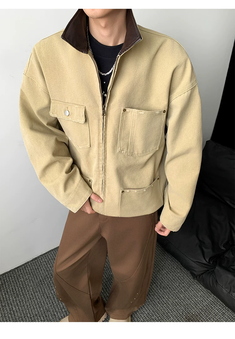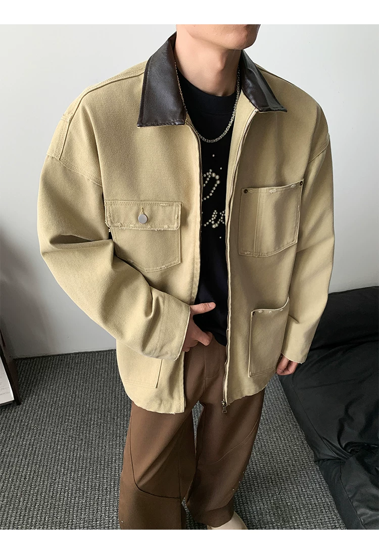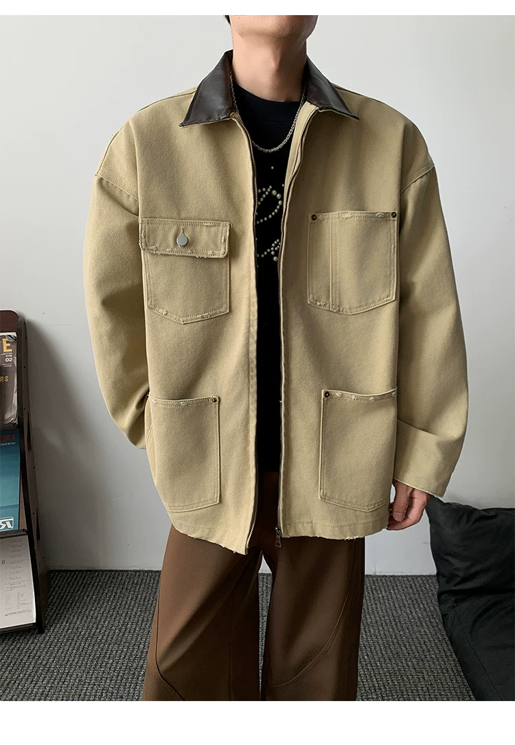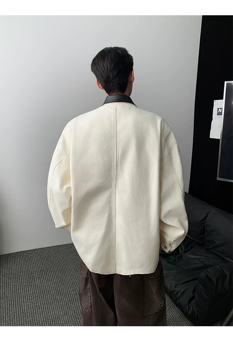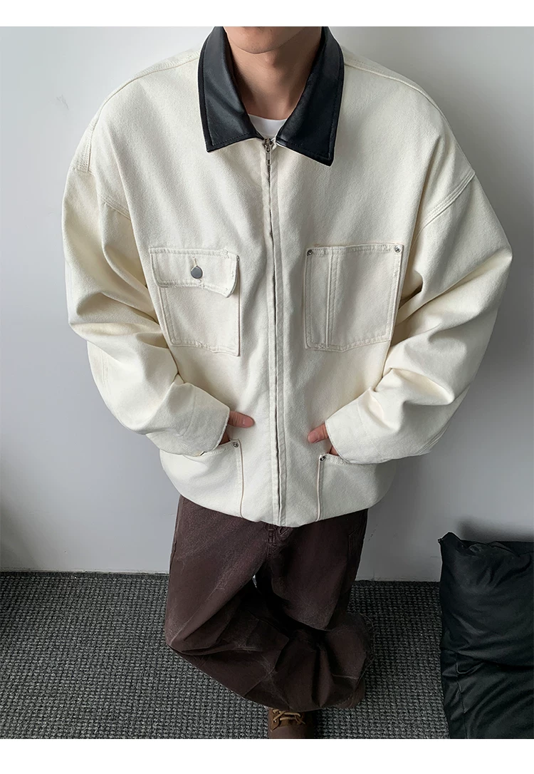 - Áo khoác denim nam phong cách retro Mỹ, chất liệu da PU, kiểu dáng rộng rãi, thời trang thu đông, kiểu áo khoác công nhân, áo ngắn kiểu barn.