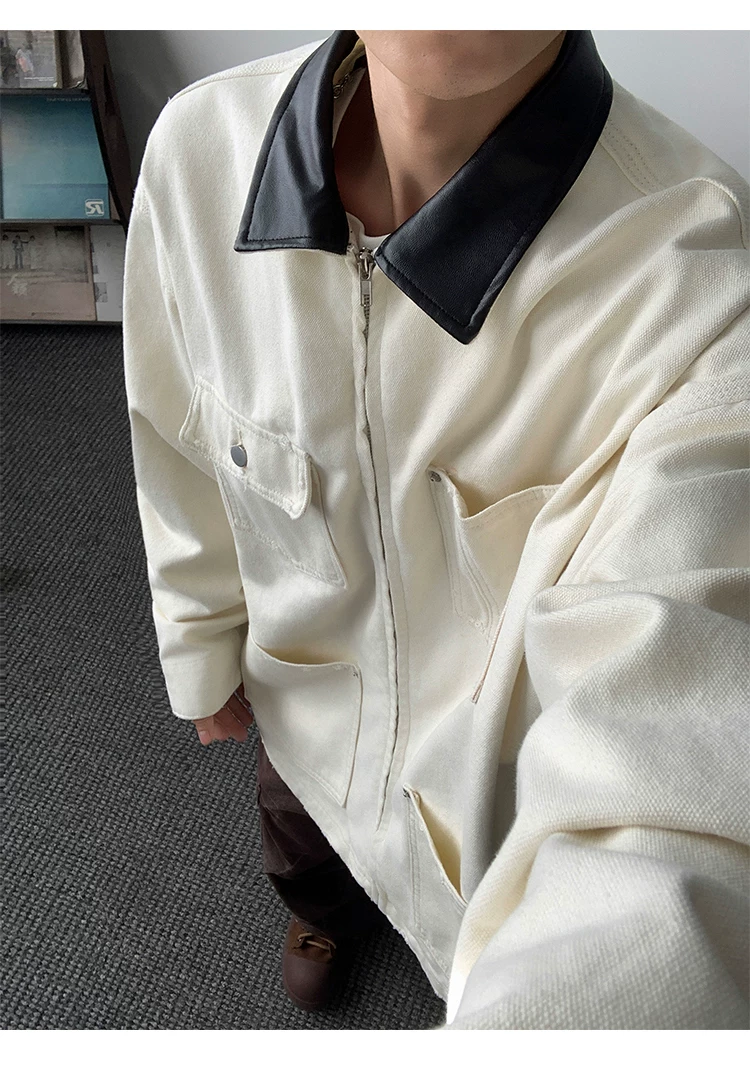 Áo khoác denim nam phong cách retro Mỹ, chất liệu da PU, kiểu dáng rộng rãi, thời trang thu đông, kiểu áo khoác công nhân, áo ngắn kiểu barn.