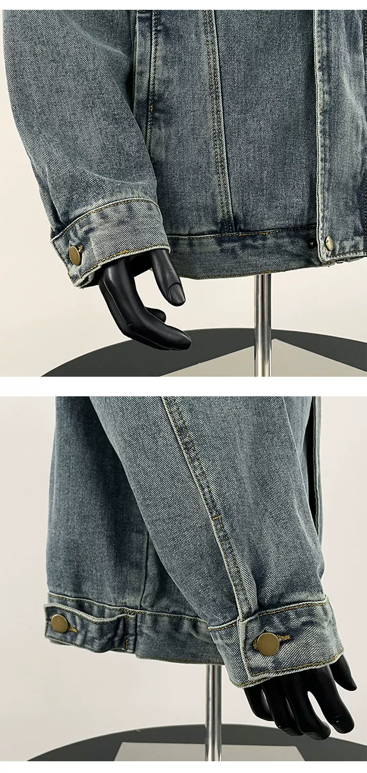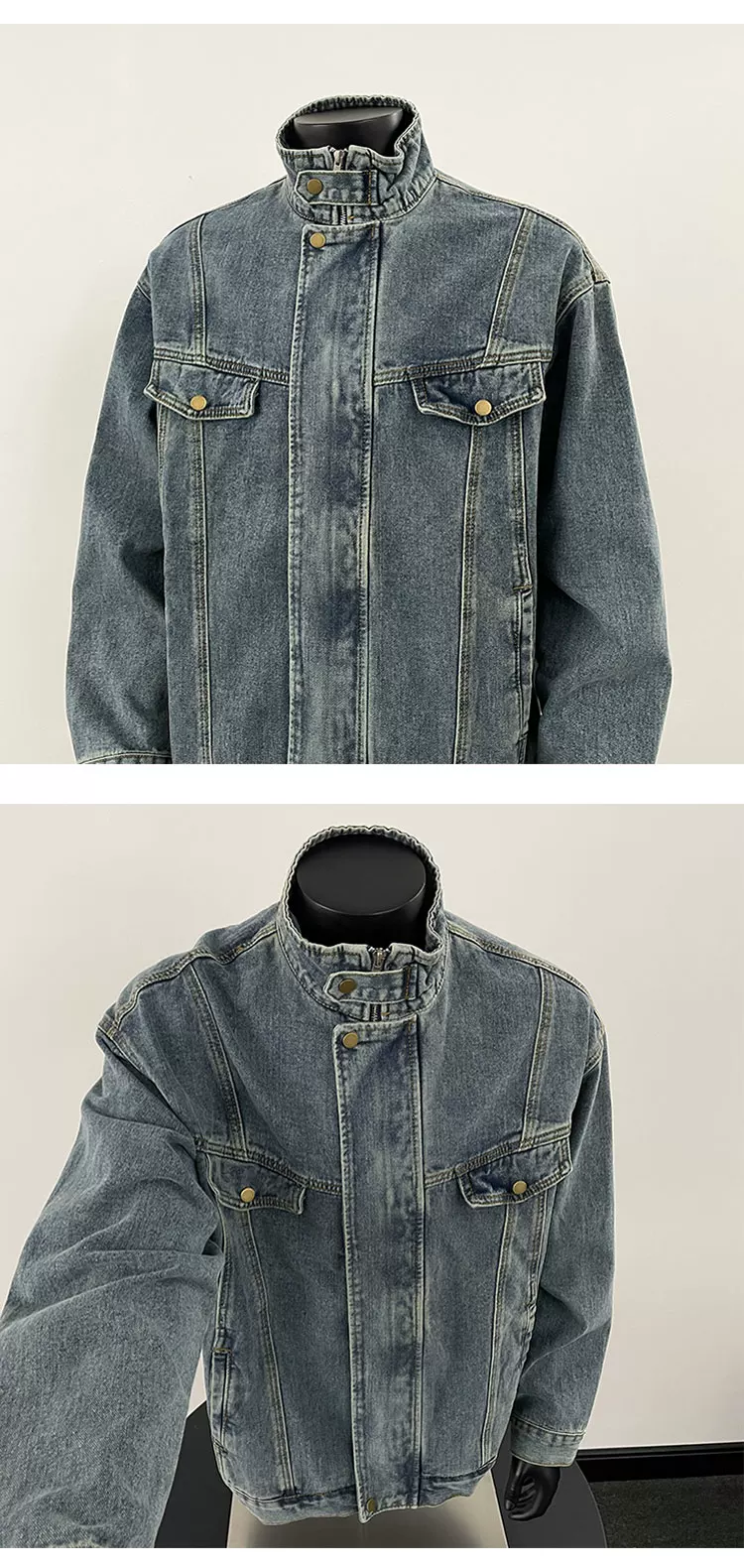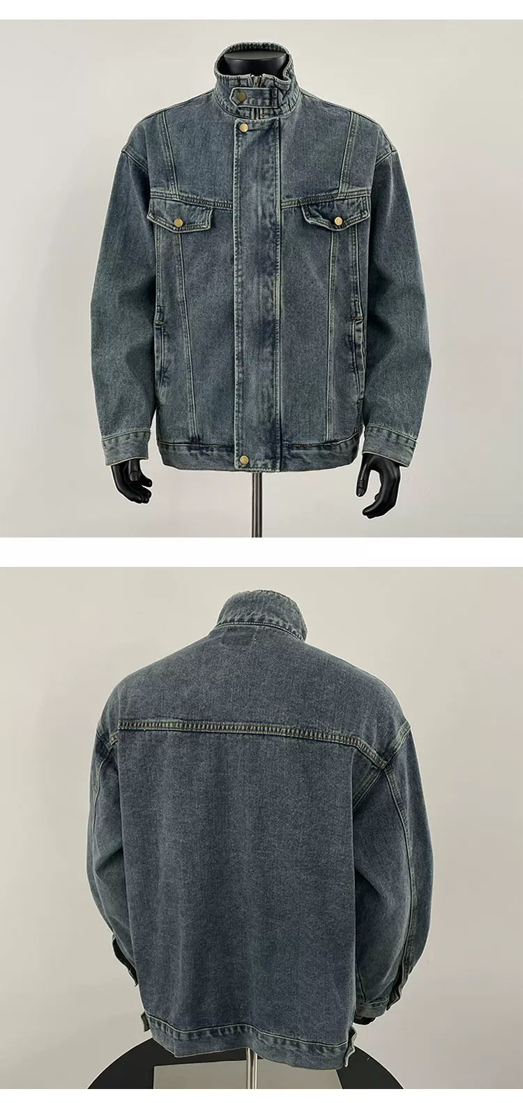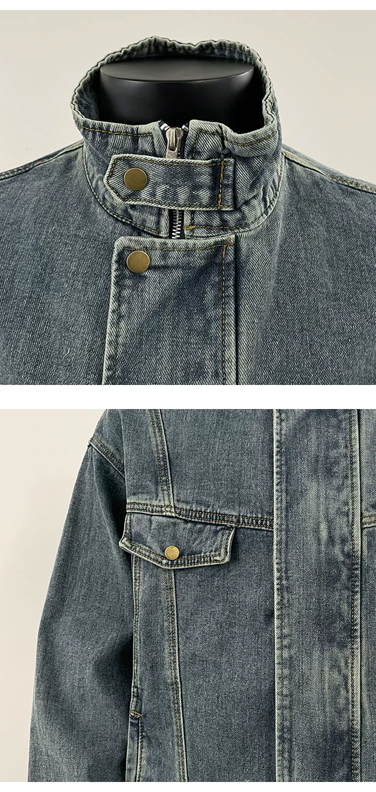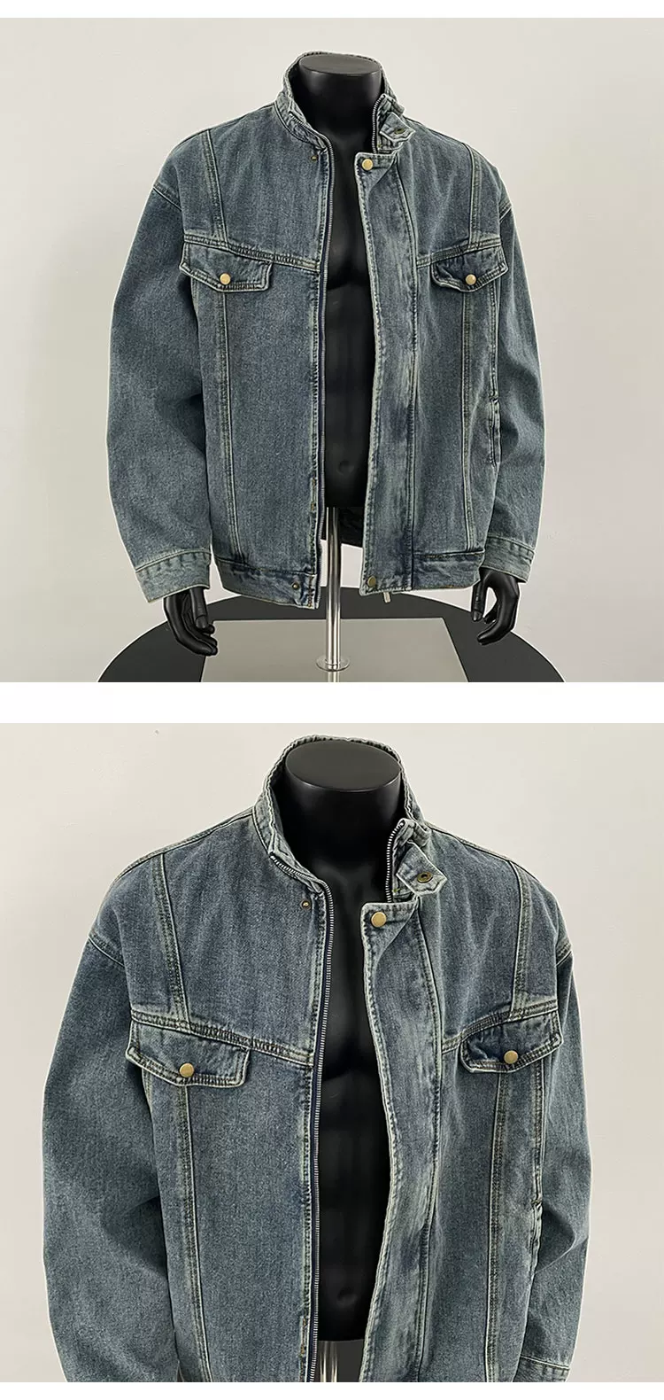 - Áo khoác denim nam Xuân 2025, áo khoác cổ đứng dày dặn, kiểu dáng rộng rãi, thời thượng, phong cách Mỹ cao cấp.