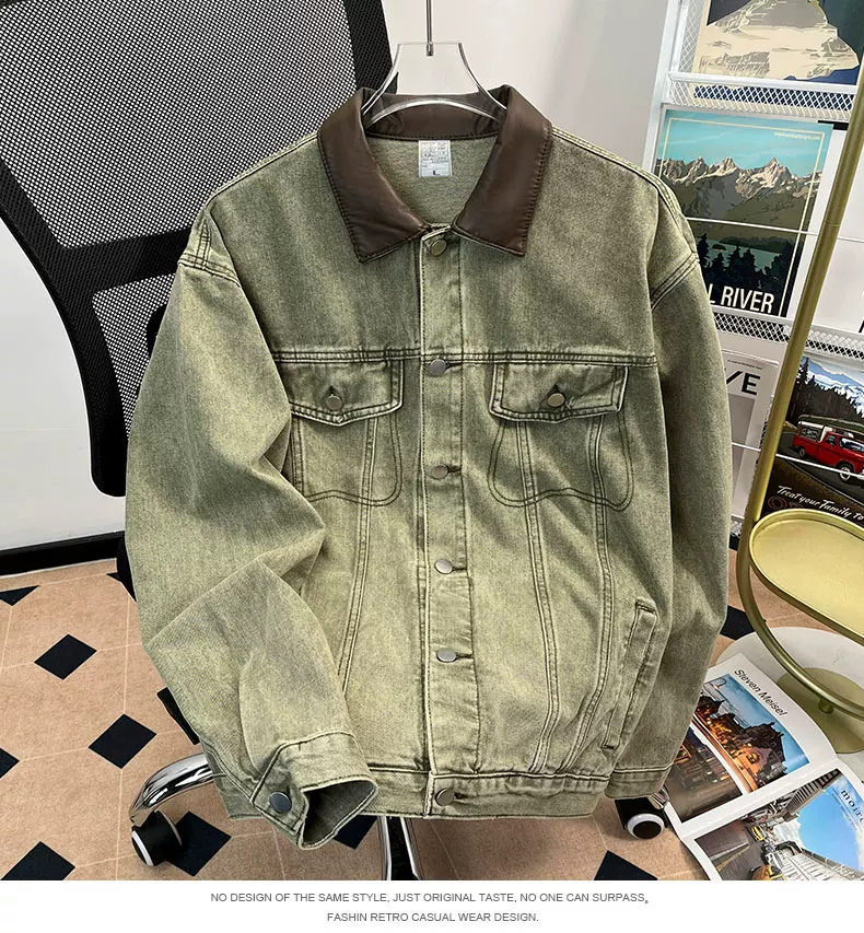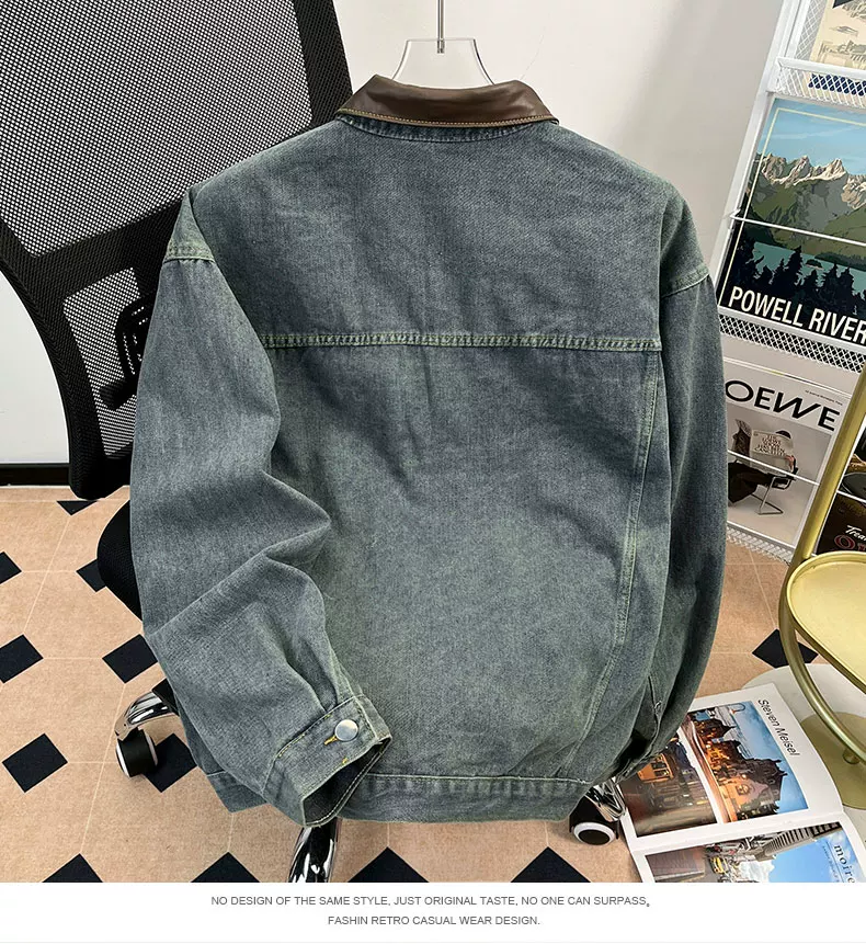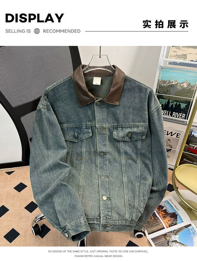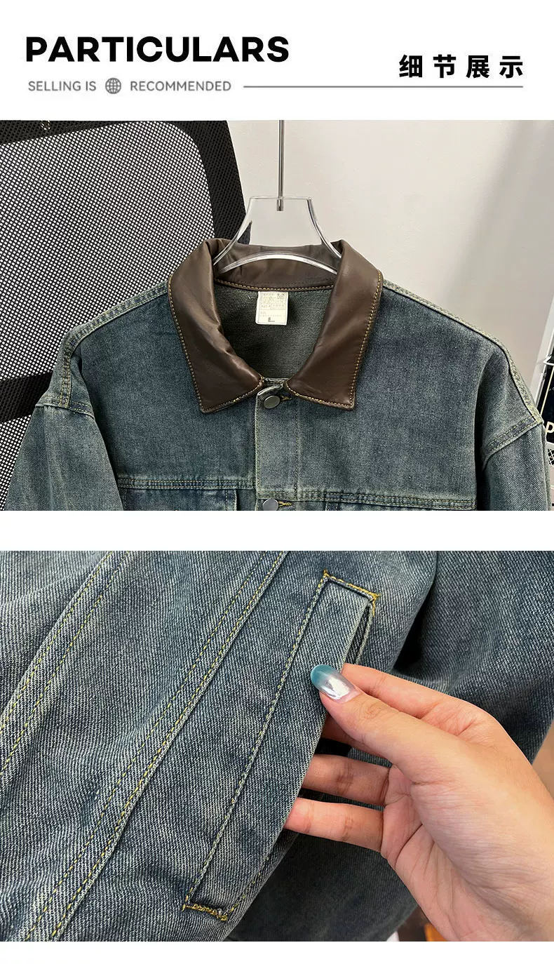 - Áo khoác denim phối da PU dành cho nam, phong cách retro Mỹ mùa xuân thu, áo khoác công sở cổ bẻ, thương hiệu thời thượng, giặt mài, kiểu dáng cá tính và sành điệu.