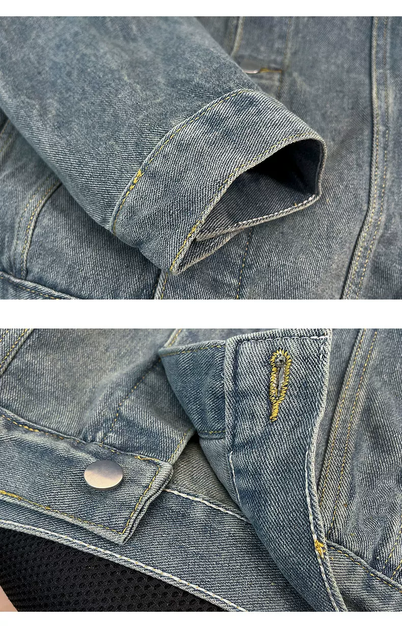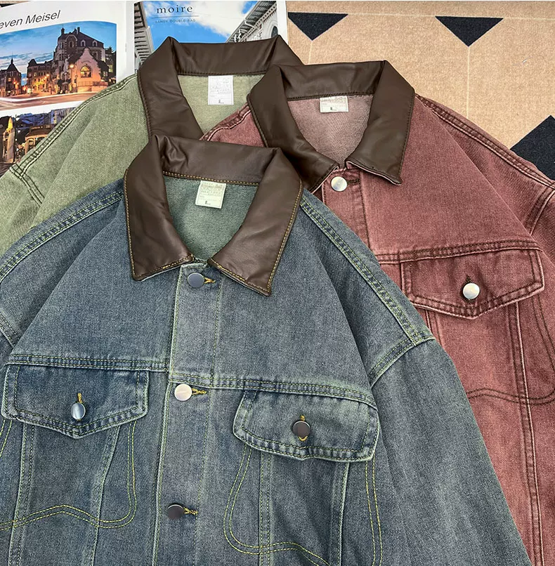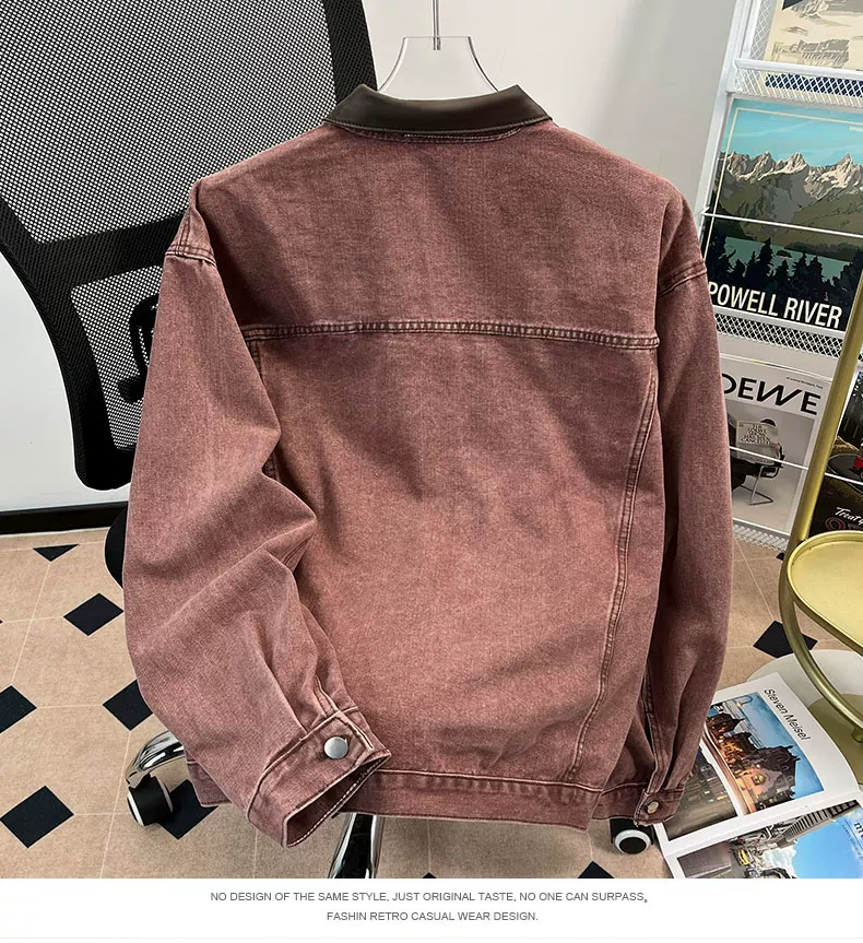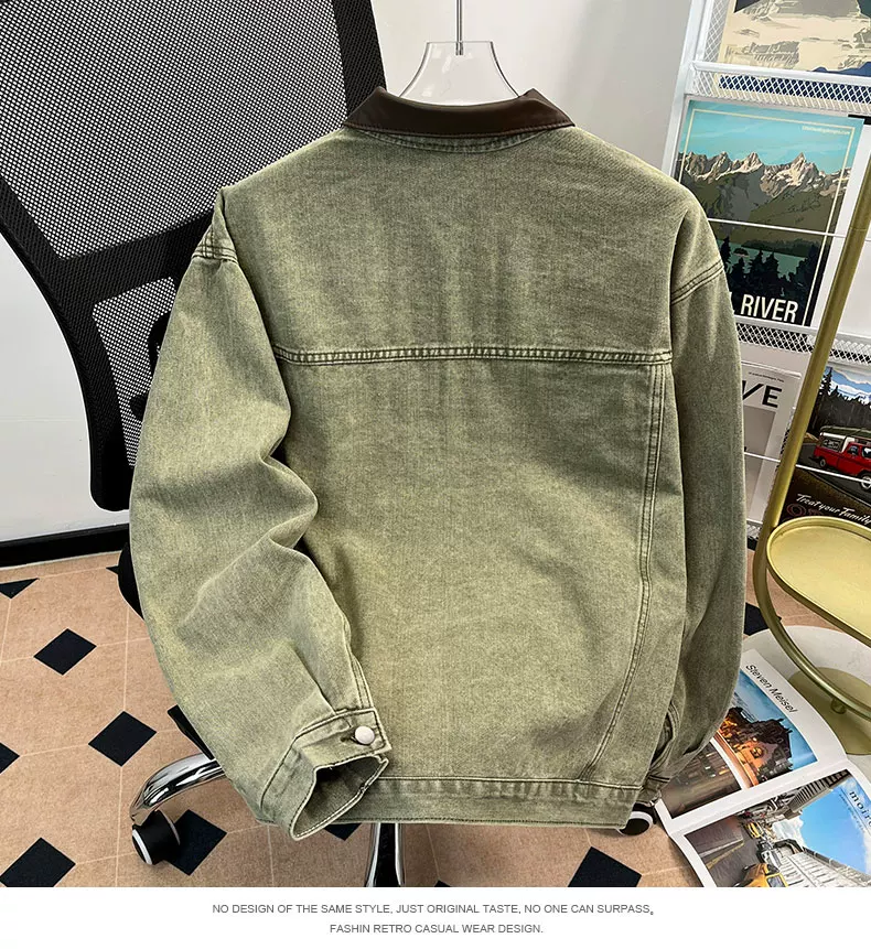 - Áo khoác denim phối da PU dành cho nam, phong cách retro Mỹ mùa xuân thu, áo khoác công sở cổ bẻ, thương hiệu thời thượng, giặt mài, kiểu dáng cá tính và sành điệu.