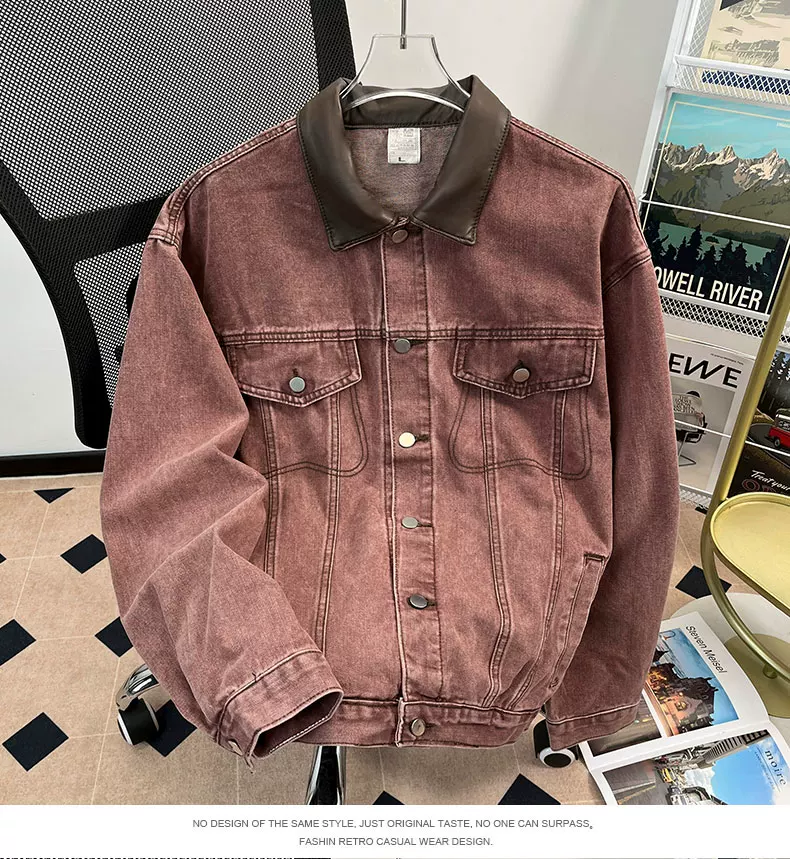 Áo khoác denim phối da PU dành cho nam, phong cách retro Mỹ mùa xuân thu, áo khoác công sở cổ bẻ, thương hiệu thời thượng, giặt mài, kiểu dáng cá tính và sành điệu.