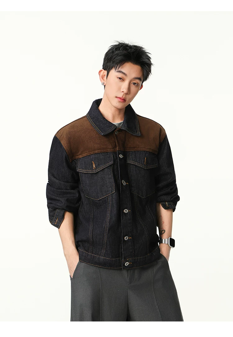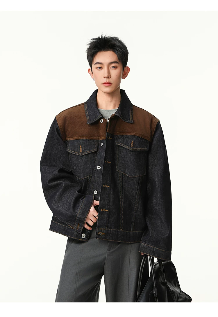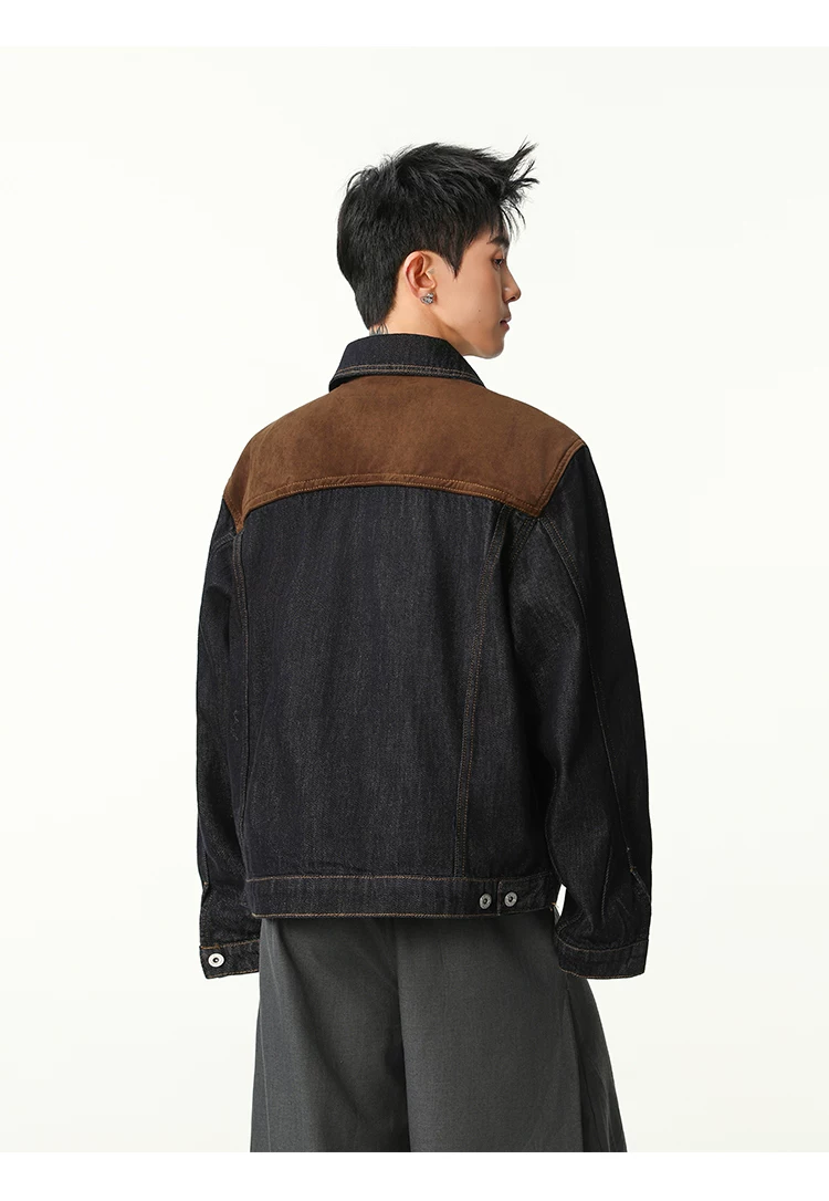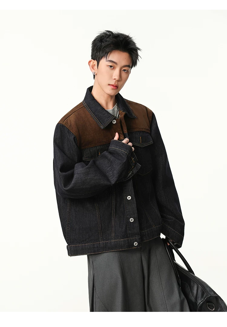 Áo khoác denim phối vải kiểu Mỹ cổ điển dành cho nam, dáng rộng mùa xuân thu, cổ áo phối màu, áo khoác công sở thời trang cá tính.