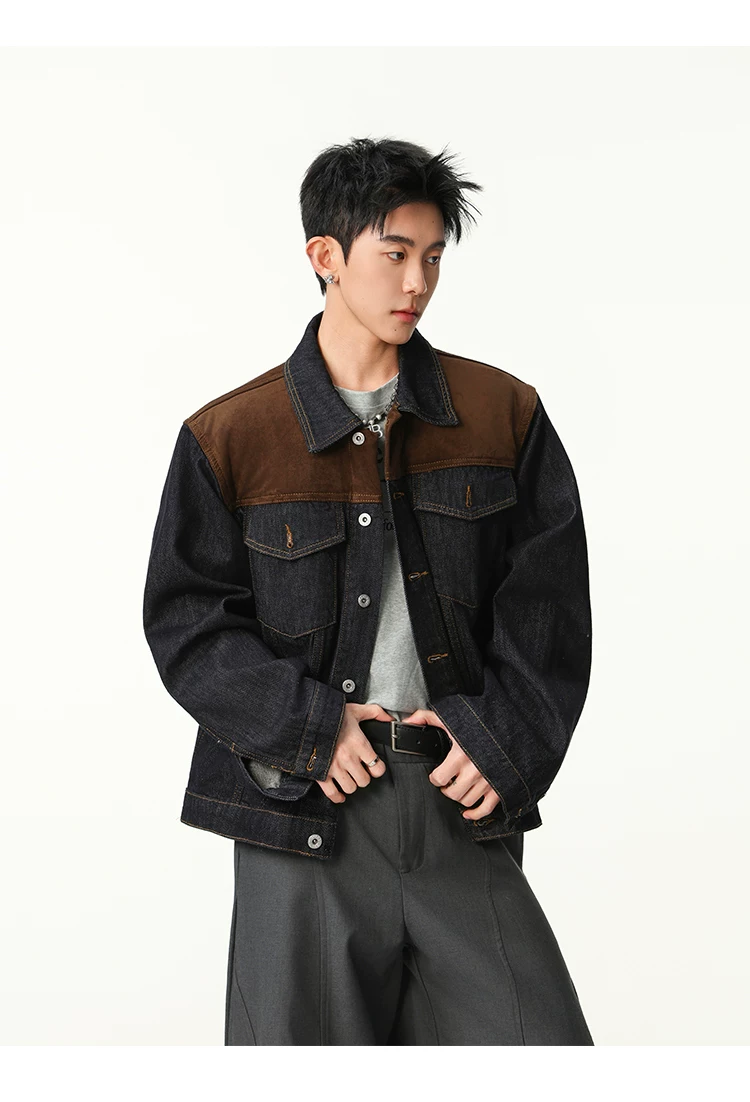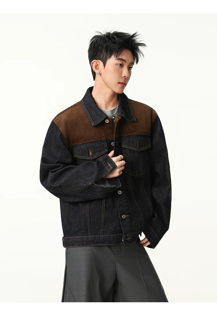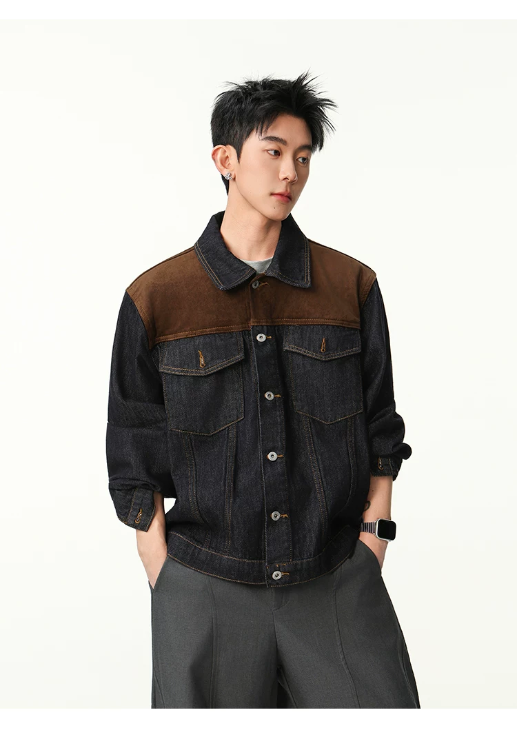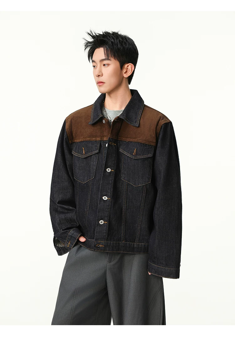 Áo khoác denim phối vải kiểu Mỹ cổ điển dành cho nam, dáng rộng mùa xuân thu, cổ áo phối màu, áo khoác công sở thời trang cá tính.